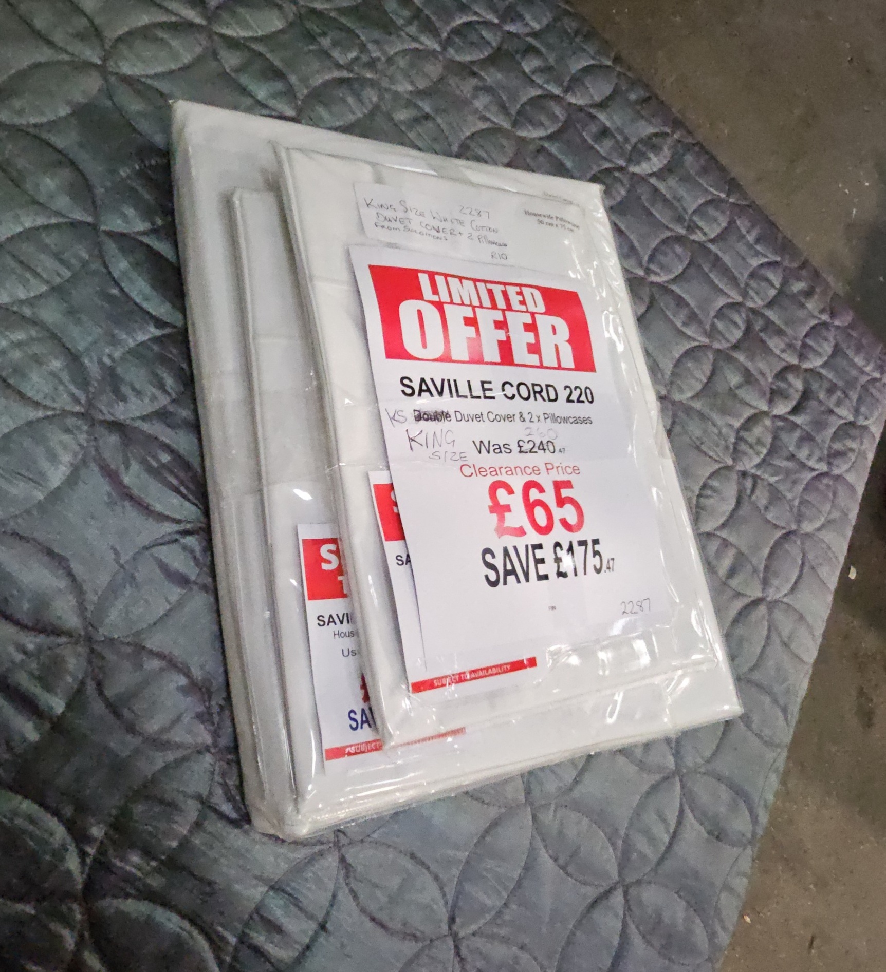 A Saville Cord 220 white cotton bedding set comprising one king size duvet cover and a pair of matching pillowcases. The item is housed in its original clear plastic retail packaging. A prominent red and white clearance label identifies the product as Saville Cord 220. Although the printed text on the label specifies a Double Duvet Cover, this has been struck through and King Size has been added in blue ink. This is supported by a separate handwritten tag at the top of the package which reads 2287 King Size White Cotton Duvet Cover + 2 Pillowcases From Solomons R10. The retail label displays a previous price of 240.47 GBP and a clearance price of 65.00 GBP.