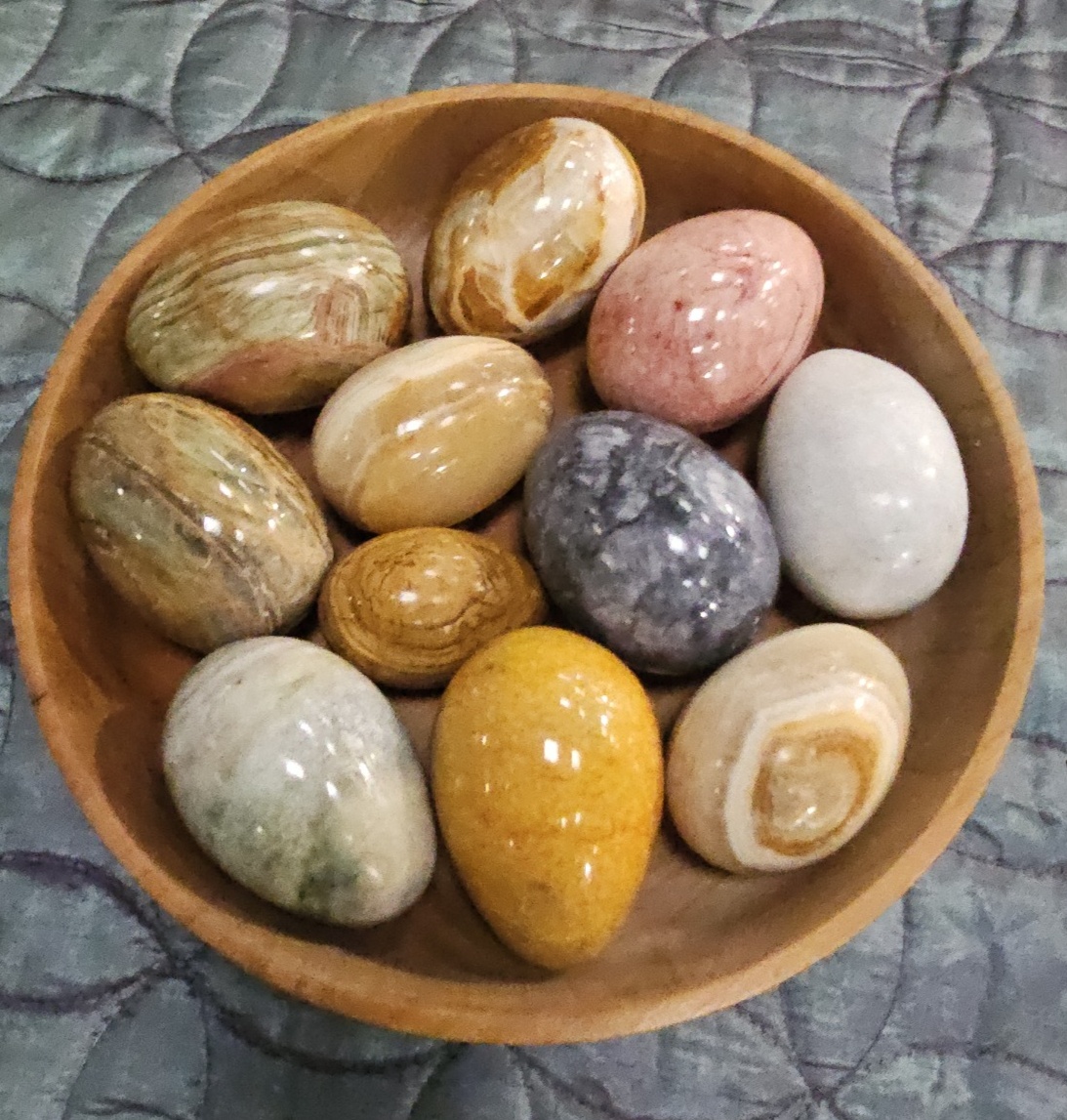 The collection appears to be in good overall condition. No chips, cracks, or significant surface scratches are visible to the stone specimens. The wooden bowl remains structurally sound with minor surface wear consistent with age and use.