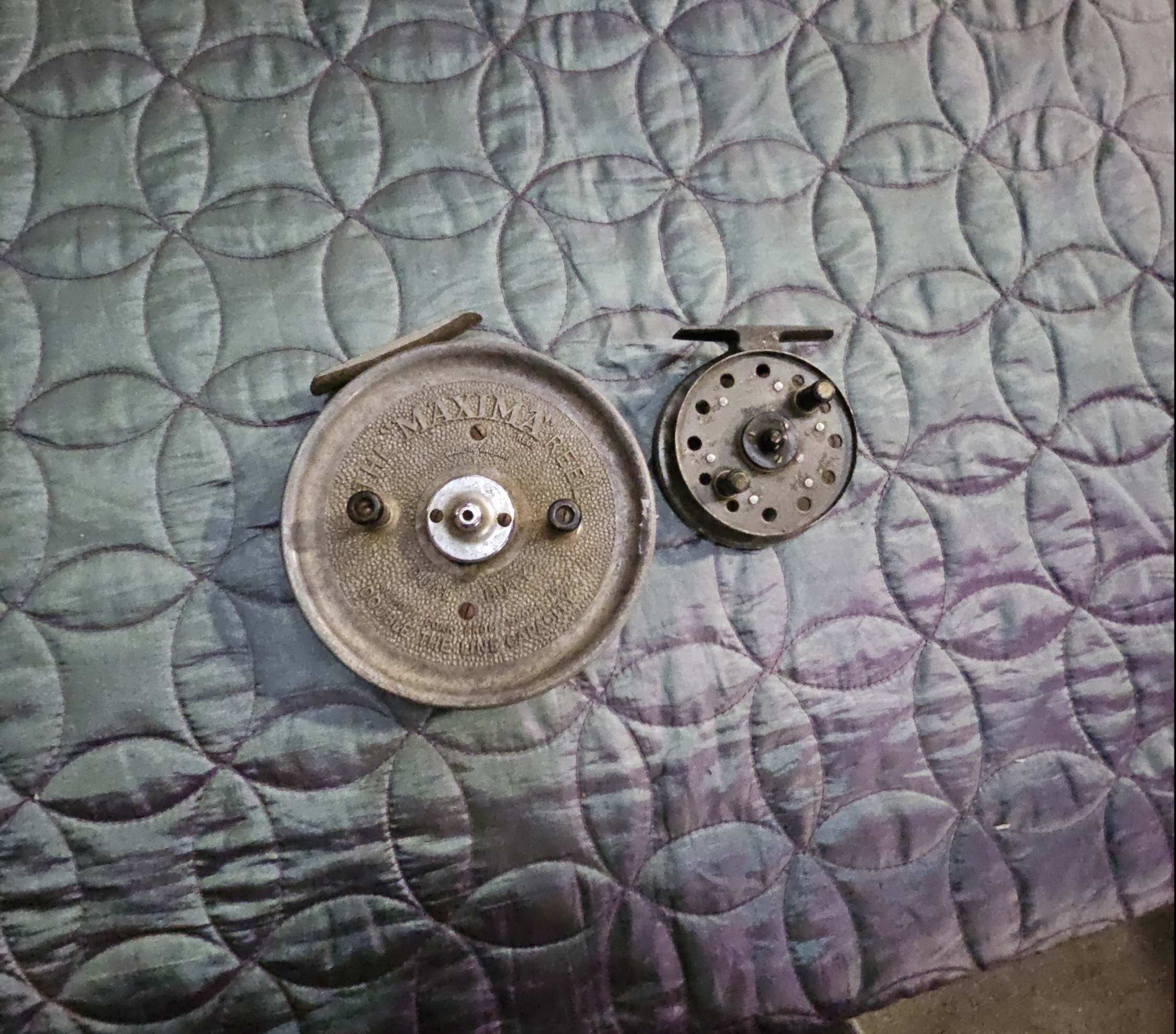 This lot consists of two vintage metal fishing reels of different specifications. The larger reel is a Maxima centrepin model, constructed from cast alloy with a textured finish. The face plate is embossed with the name THE MAXIMA REEL and the phrase DOUBLE THE LINE CAPACITY. It is fitted with two black winding handles and a central silver-toned hub, while the reverse features a six-spoke reinforced design. The smaller item is a perforated fly-fishing reel attributed to Hardy, resembling the St. George Junior pattern. It features a single winding handle, a central screw-down hub, and a characteristic circular perforation pattern on the face. No maker’s marks are visible on the smaller reel.