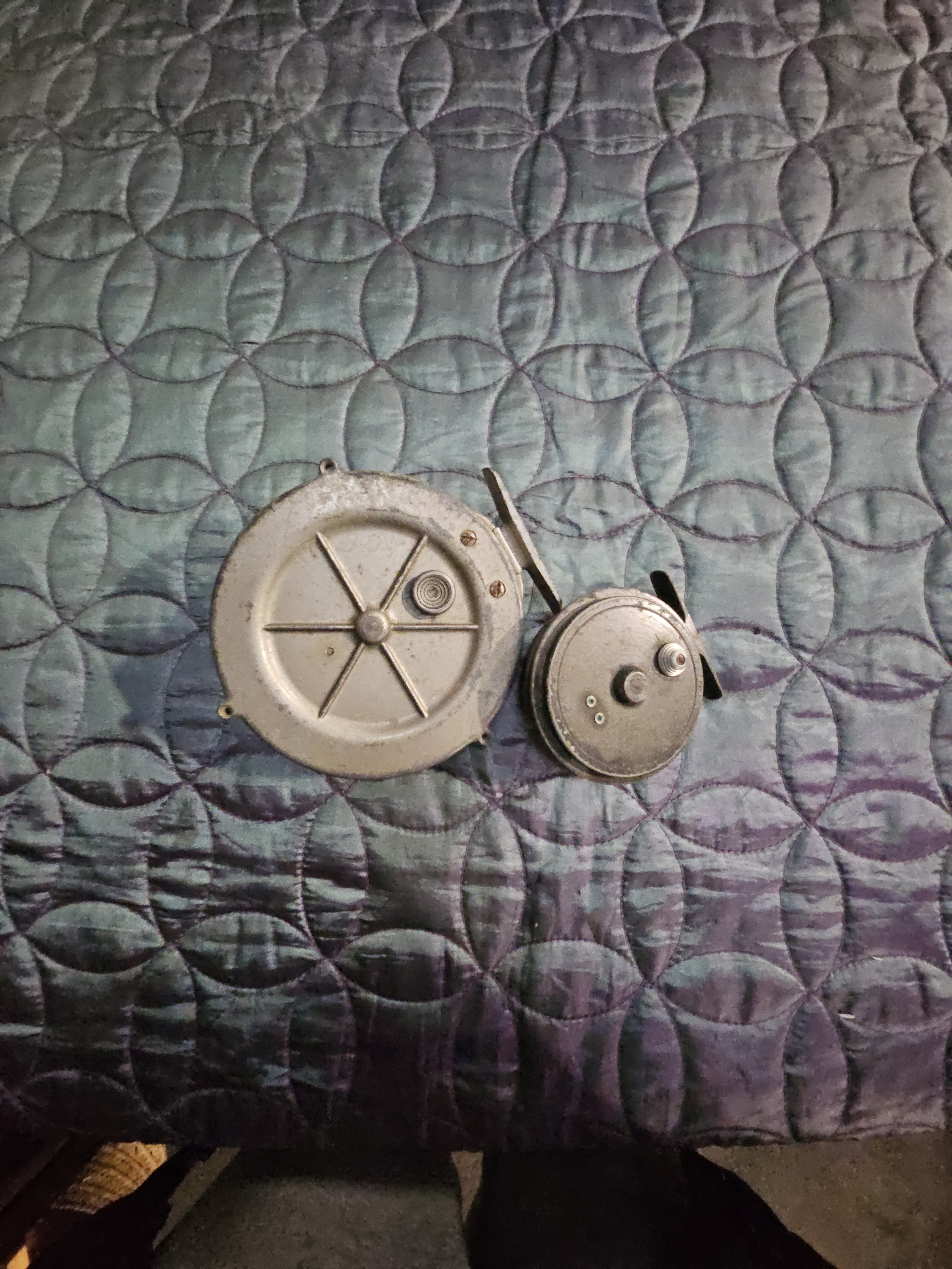 Both reels exhibit signs of age and extensive use. Surface oxidation, pitting to the metal, and wear to the original finish are visible on both items. There is a significant accumulation of grime and surface tarnish. The mechanical functionality of the reels has not been tested.