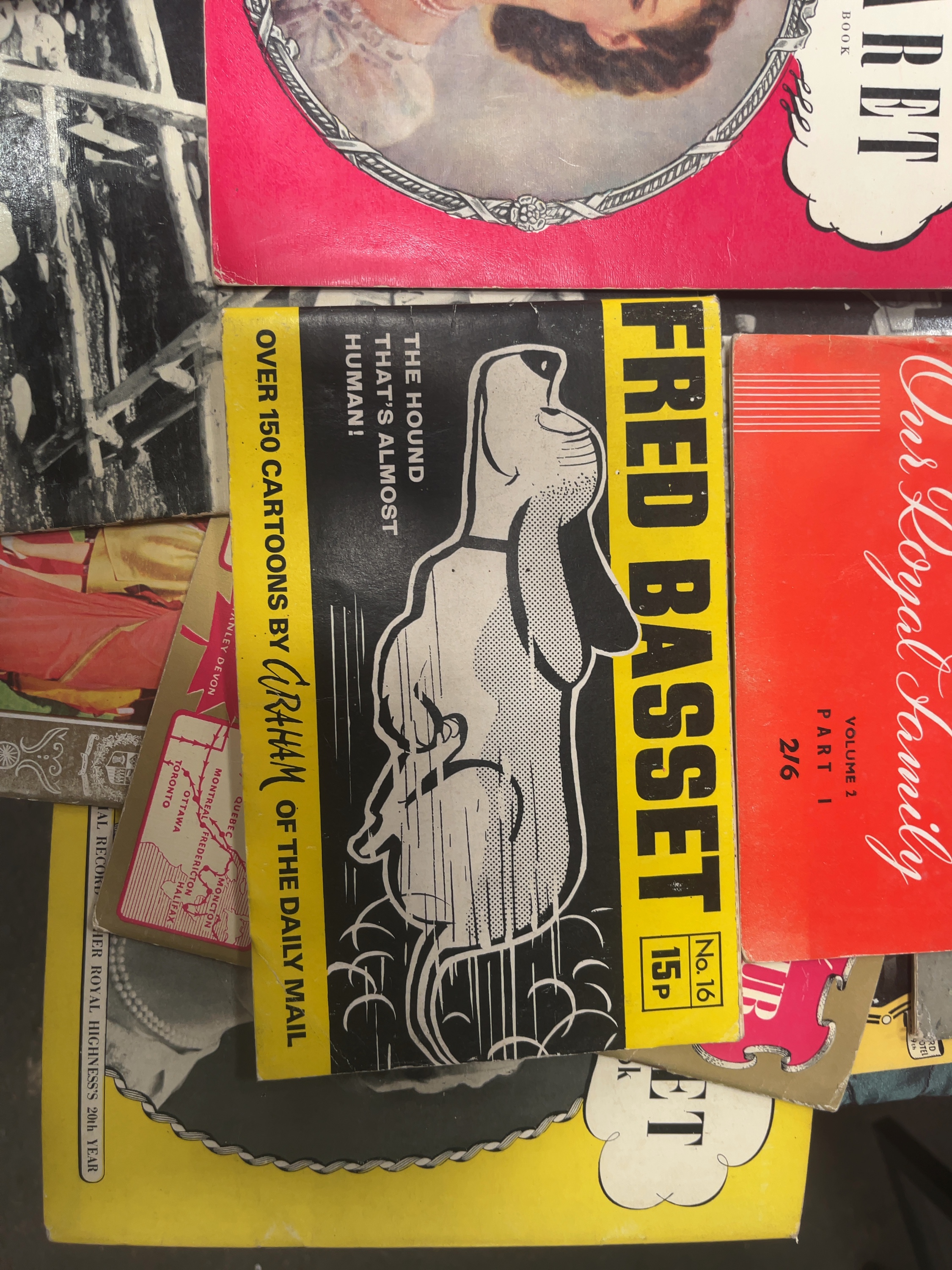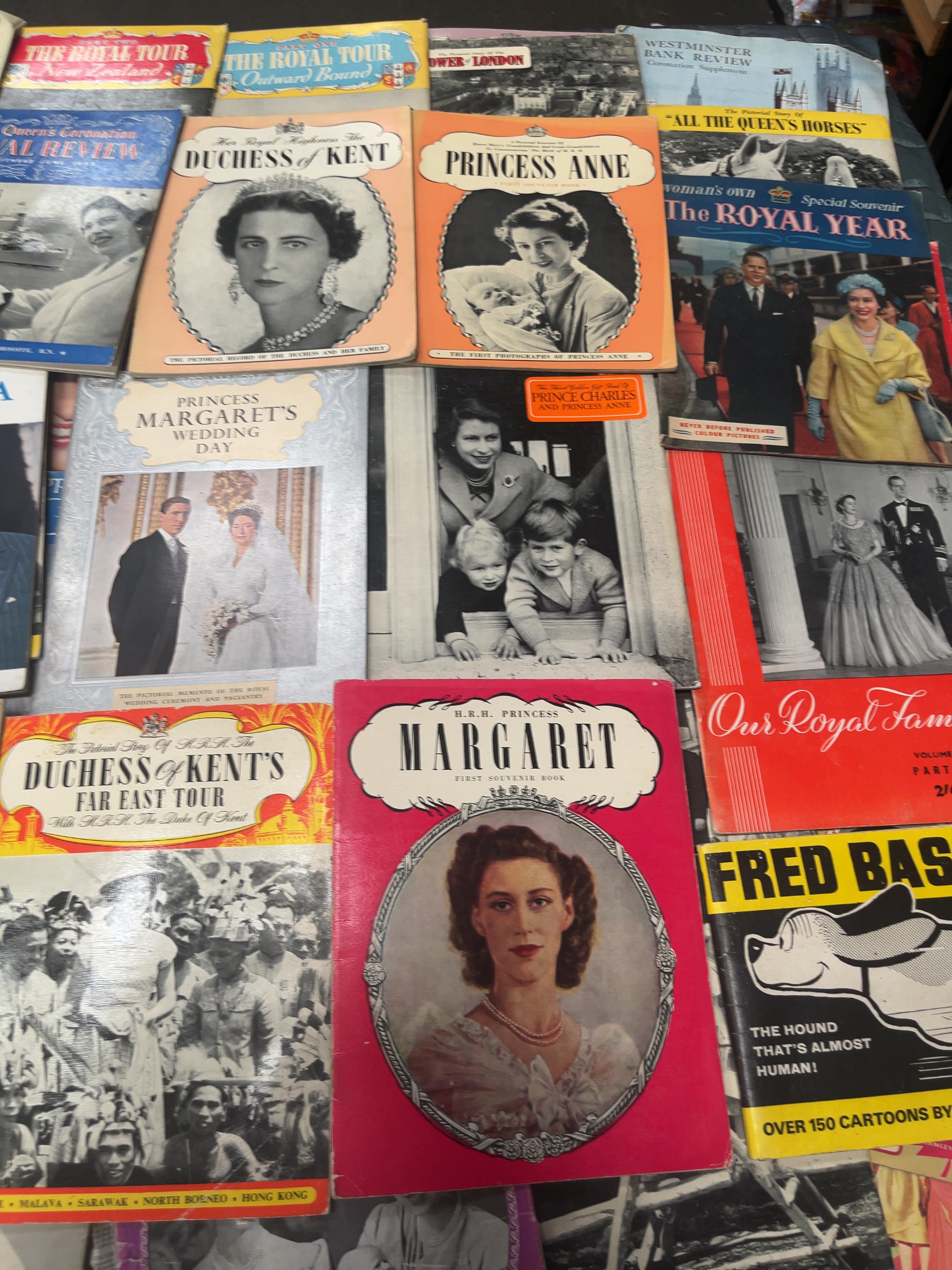 A substantial collection of approximately 40–50 vintage softcover souvenir books and pictorial magazines, primarily published by Pitkin Pictorials, The Daily Graphic, and Woman’s Own. The collection documents significant events and figures of the British Royal Family from the late 1940s to the early 1960s. Key subjects include the 1953 Coronation of Queen Elizabeth II, with titles such as The Historic Story of The Coronation and Ritual, The Queen’s Coronation Day, and The Queen’s Coronation Naval Review at Spithead. The lot contains an extensive series of Royal Tour publications covering New Zealand, Australia, Southern Rhodesia, India, Pakistan, Canada, and Kenya. Biographical and commemorative works include multiple books for Princess Margaret’s 19th, 20th, and 21st birthdays, alongside her wedding day souvenir. Other notable inclusions are Royal Sisters (Volumes Two and Three), The First and Second Golden Gift Books of Prince Charles and Princess Anne, and memorial publications for King George VI and Queen Mary. The collection also contains non-royal ephemera, including a Sound of Music theatre programme, a Fred Basset No. 16 cartoon collection, and a British Expresses 1898 locomotive magazine. The items are almost exclusively staple-bound with pictorial paper covers and contain various monochrome and colour photographic illustrations.