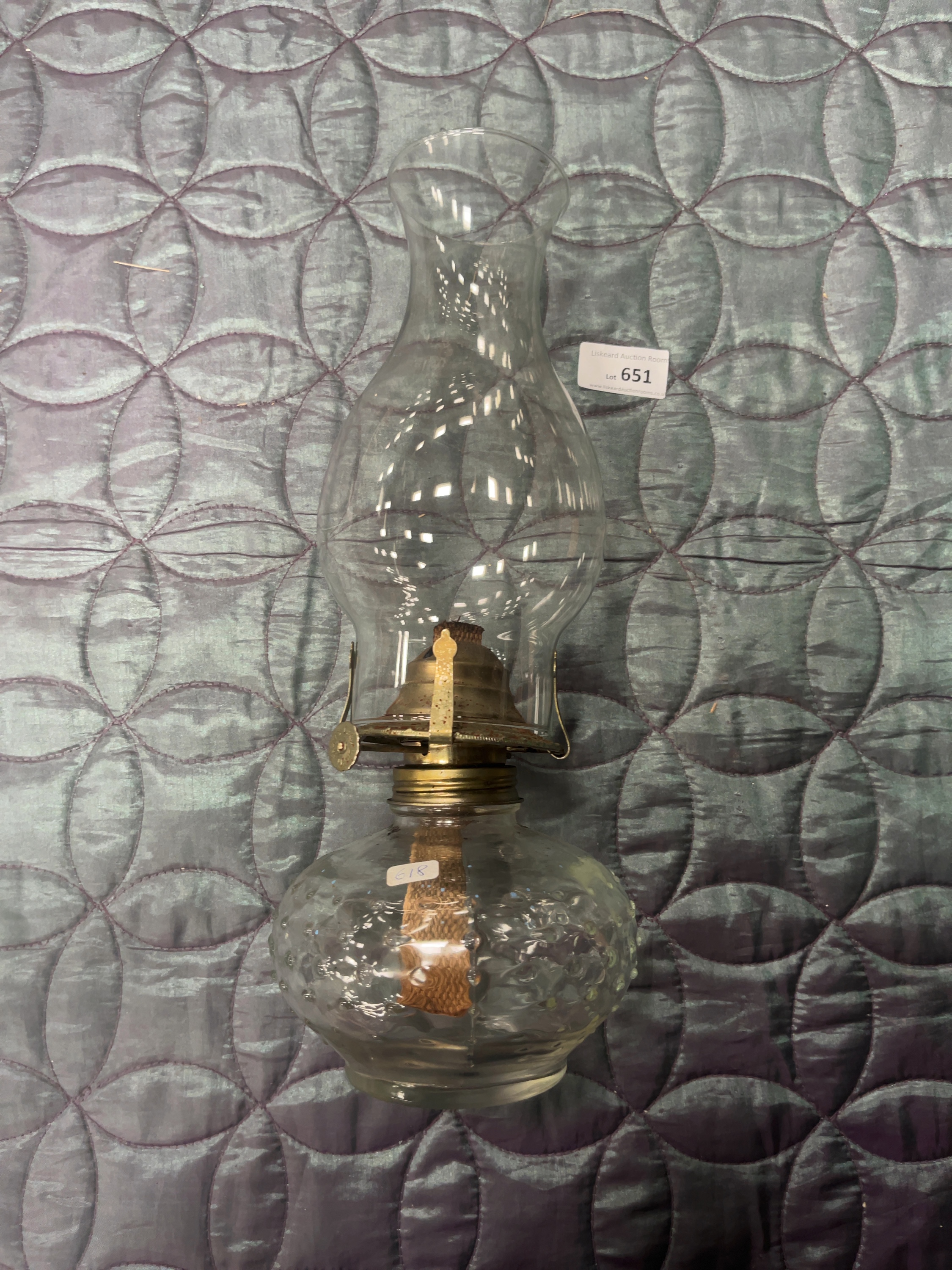 Lot 651: A clear glass paraffin table lamp with moulded hobnail pattern and brass burner