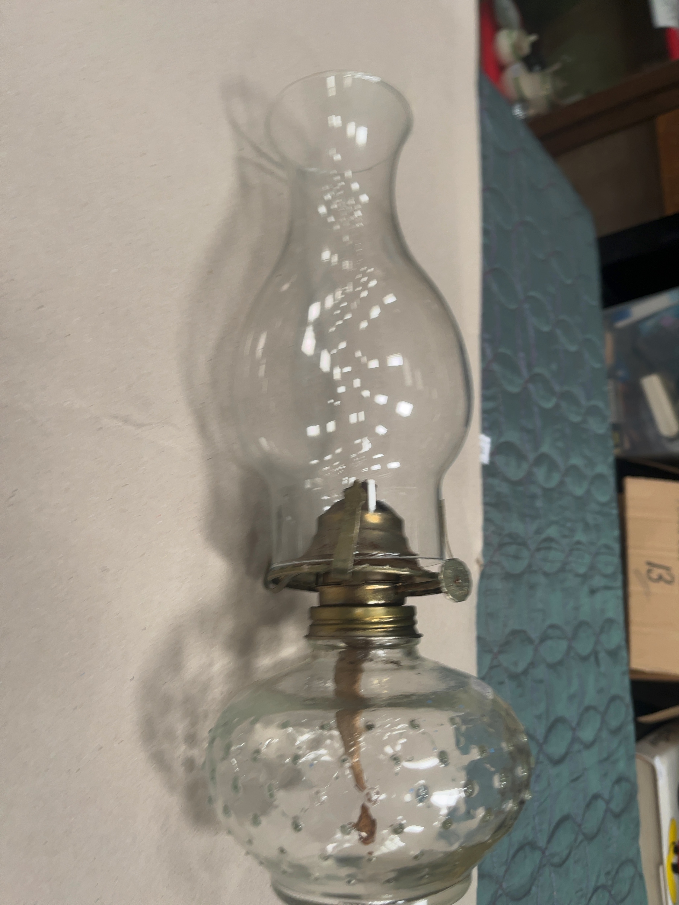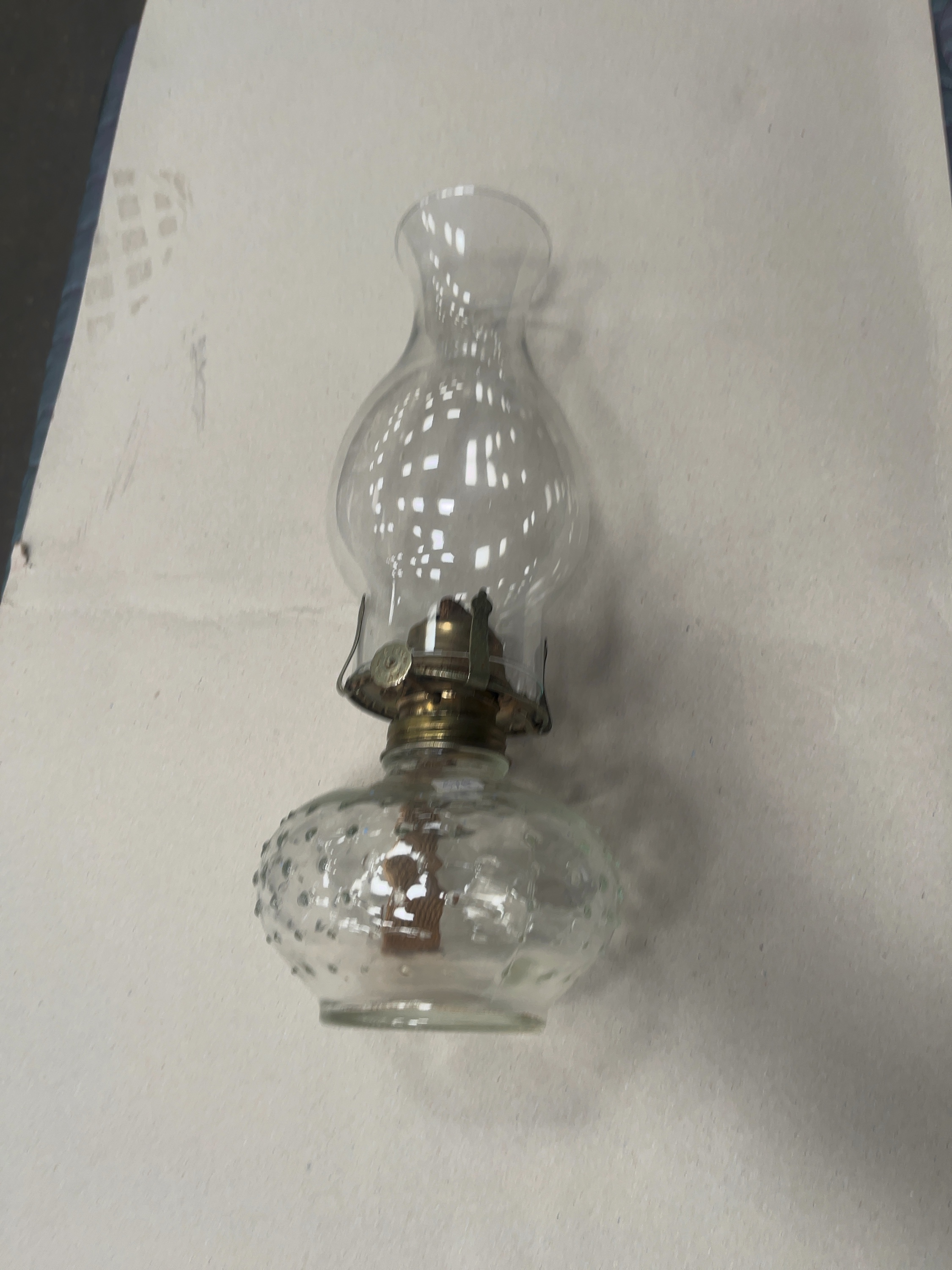 A traditional fuel-burning table lamp featuring a clear glass reservoir decorated with a moulded hobnail or beaded pattern. The lamp is equipped with a brass burner assembly and a wick adjustment wheel bearing indistinct markings. It is topped with a clear glass chimney of bulbous form tapering to a flared rim. A cotton wick remains present within the assembly.