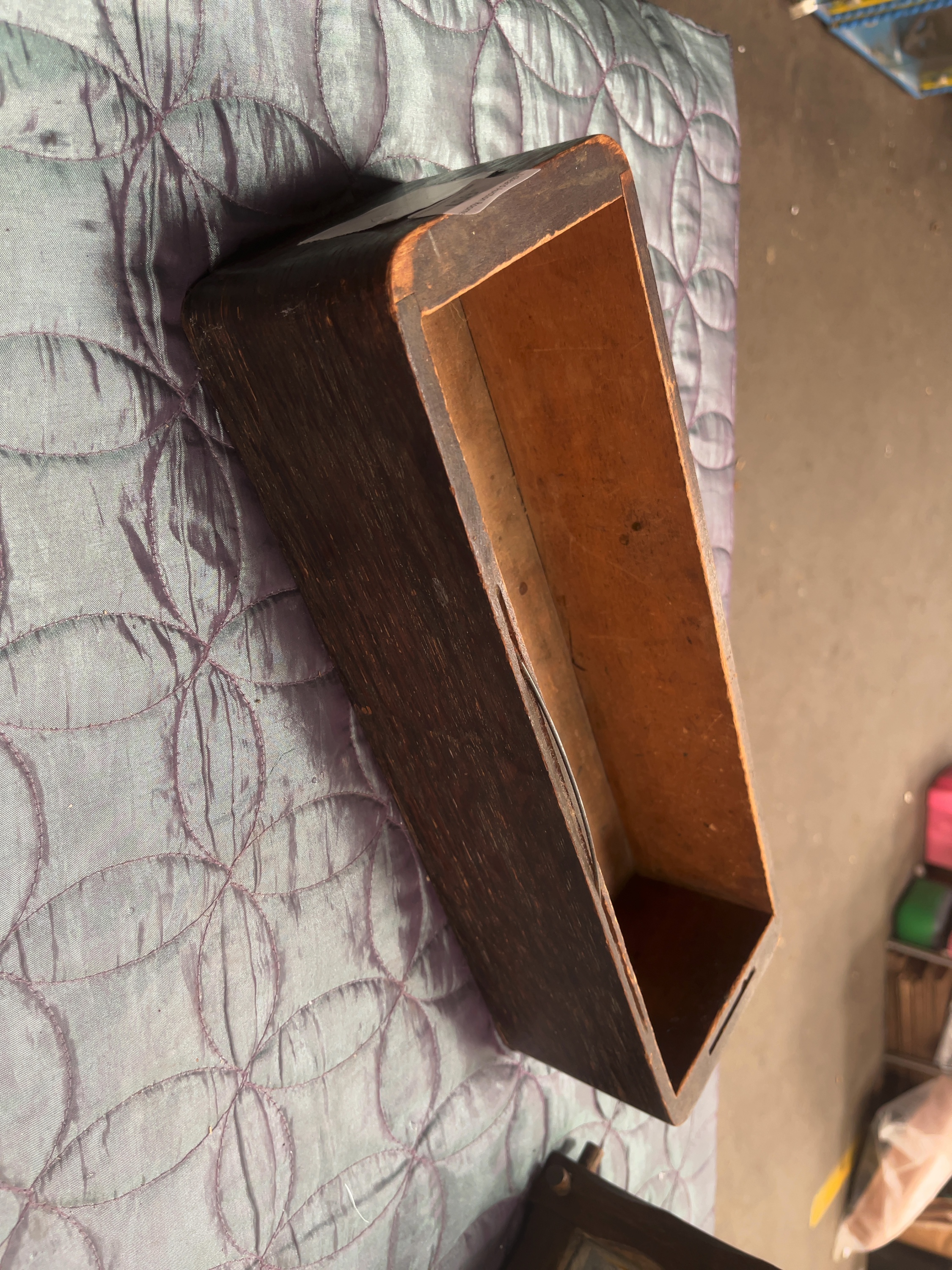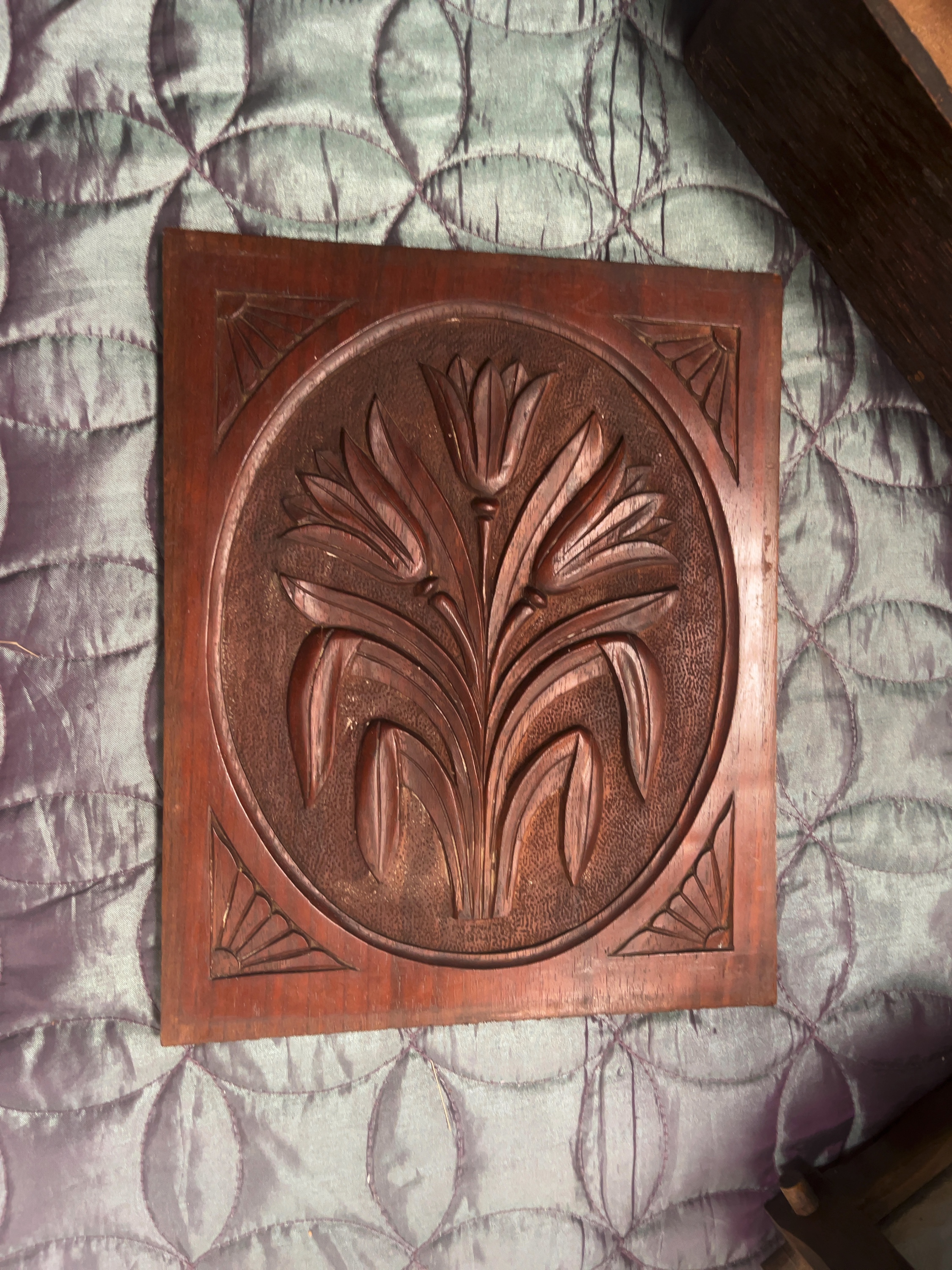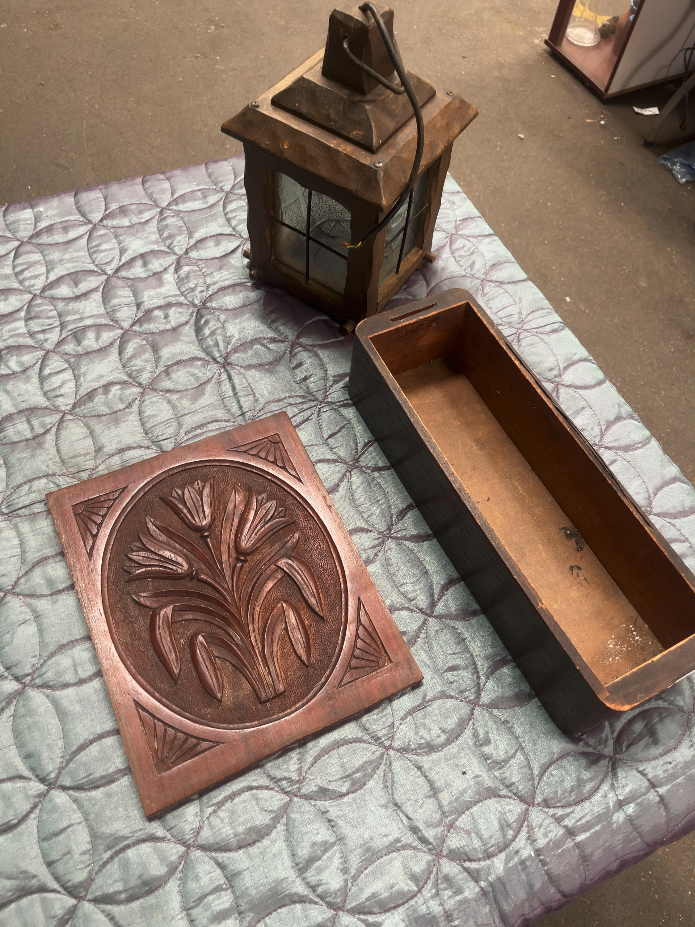 A trio of carved wooden items in the Arts and Crafts style. The group includes a lantern constructed from dark wood with a textured hammered effect to the pyramidal top and wavy-profiled corner supports. The lantern features glass panels set behind leaded glazing bars, with some glass panes showing etched decorative scrollwork. It is currently fitted with a cut electrical cable. The lot also contains a rectangular wooden panel, hand-carved in high relief with a central depiction of stylized tulips within an oval border on a stippled ground, with fanned motifs at the corners. Completing the group is a rectangular open box with a dark-stained exterior and a natural wood interior. No maker’s marks or signatures are visible on any of the pieces.