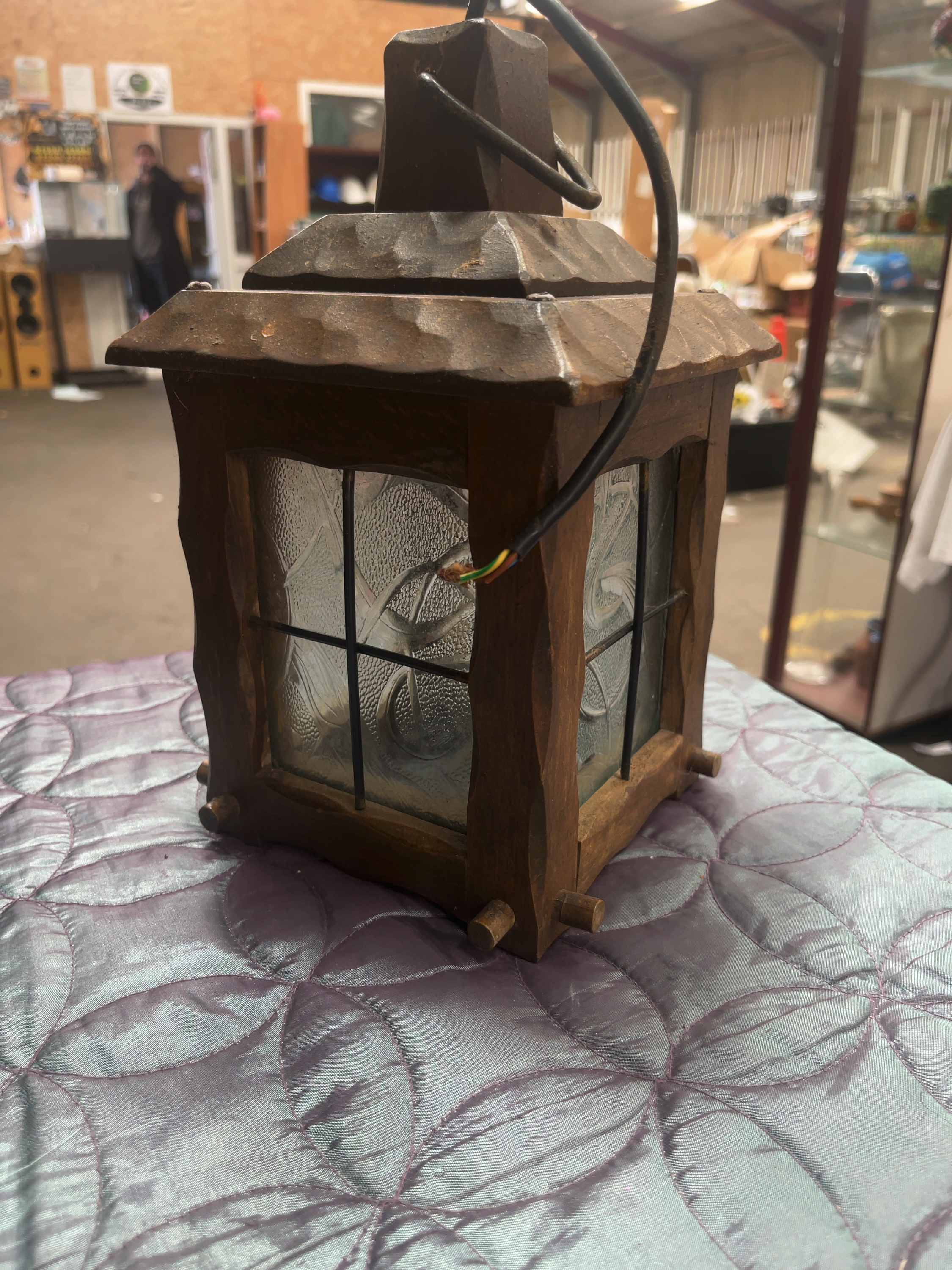 The lantern is fitted with a cut electrical cable which requires professional inspection and rewiring before use. The rectangular box shows visible surface scuffs and wear consistent with age. The carved panel and lantern show minor surface marks and wear consistent with age and use.