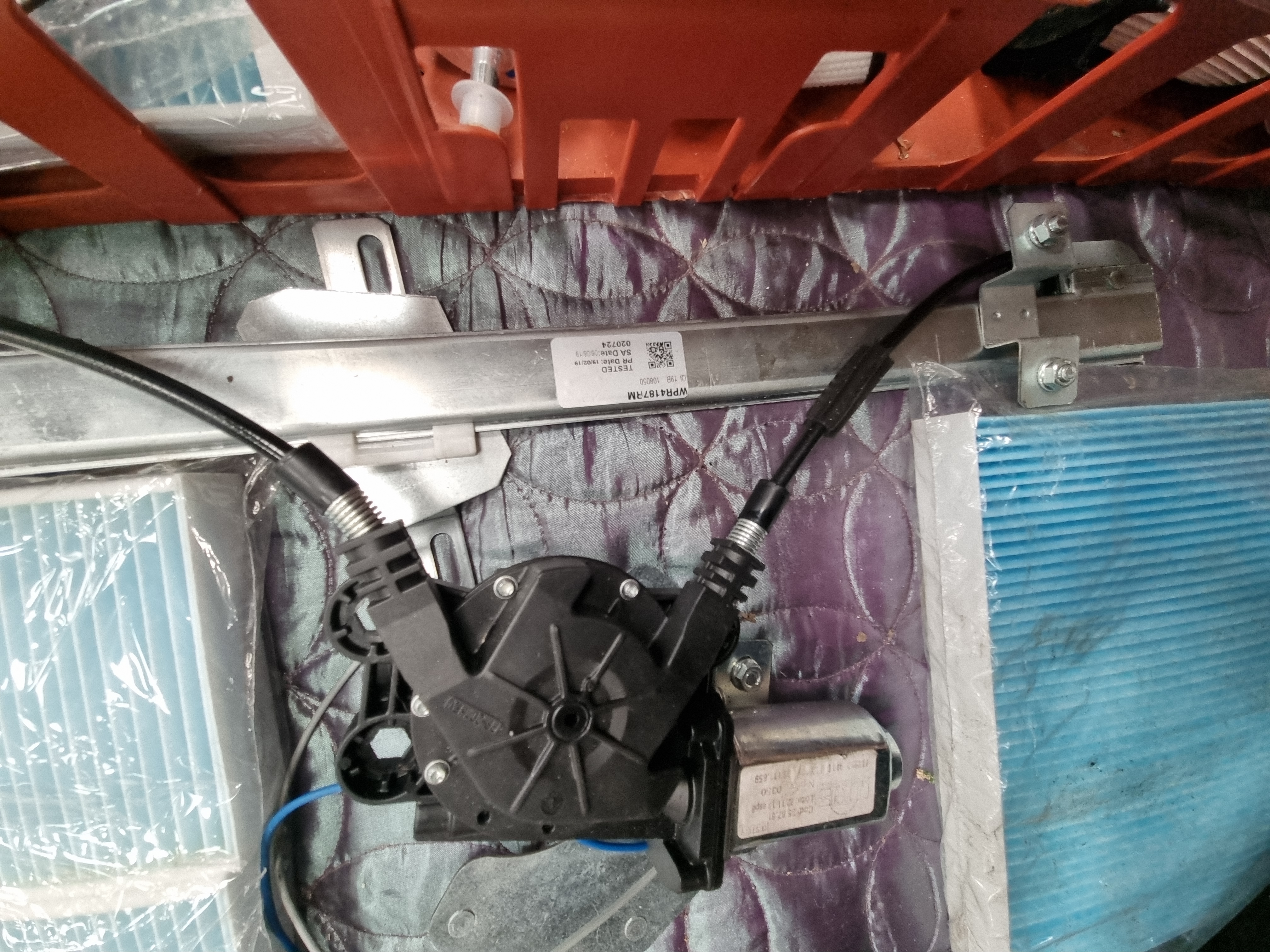 The items are in mixed condition. The majority of the components appear to be New Old Stock (NOS) housed in their original manufacturer packaging. The window regulator is marked as TESTED and appears to be a remanufactured or tested used unit. Some packaging exhibits visible shelf wear, including crushing and weathering to the cardboard boxes.