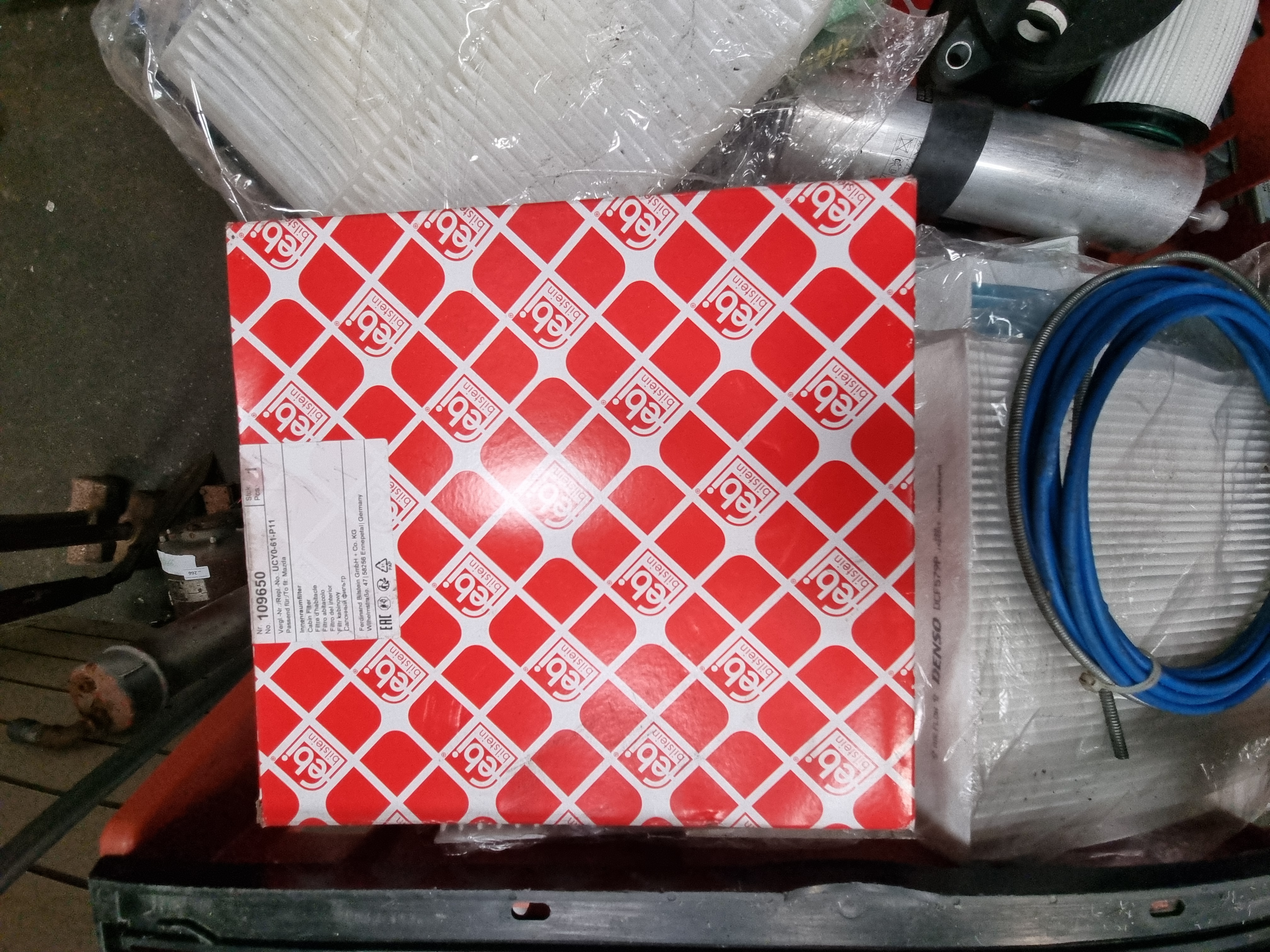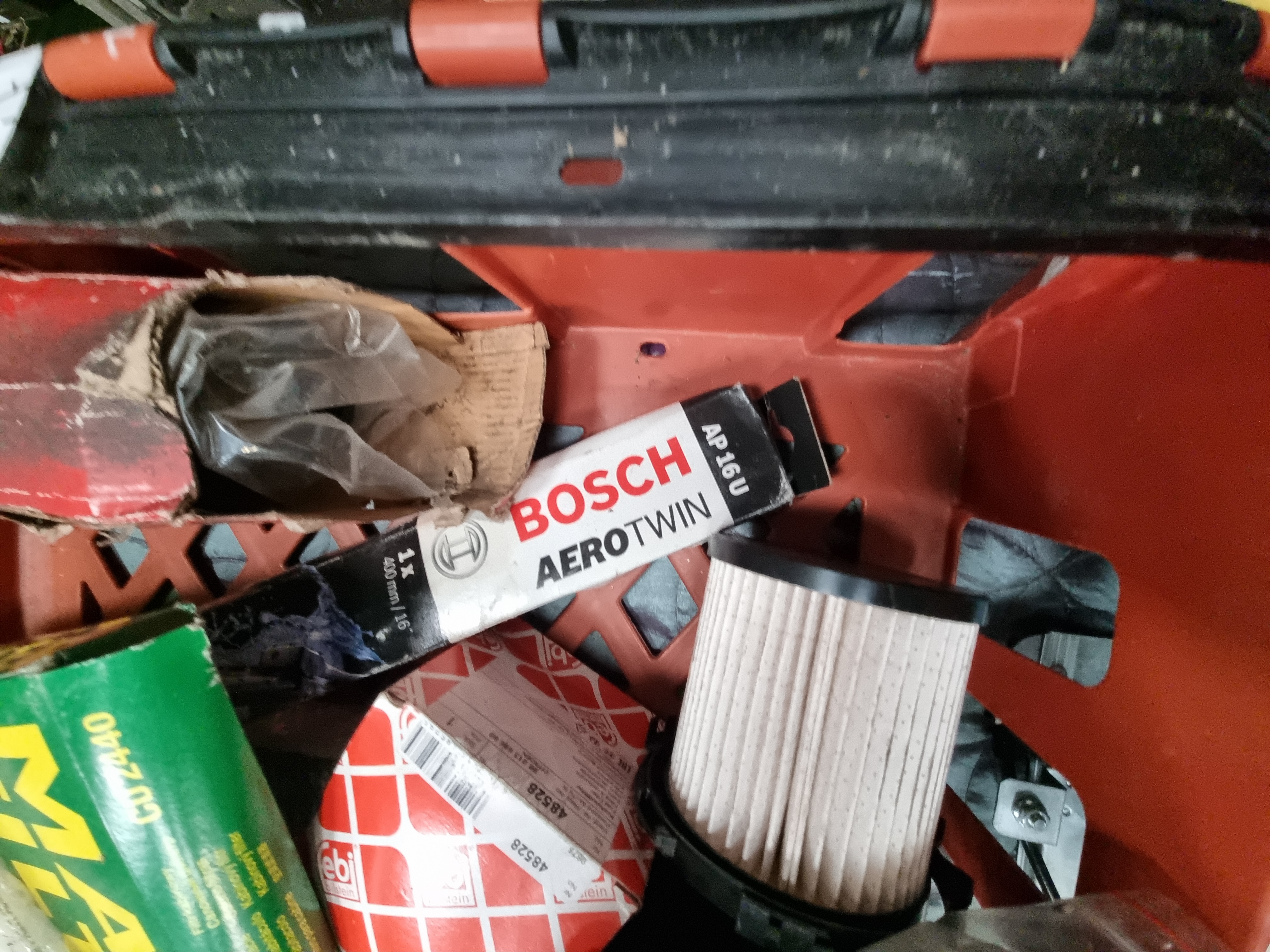 This lot comprises a collection of approximately 12–15 automotive service components and replacement parts. The assortment includes a Febi Bilstein cabin air filter, part number 109650, suitable for Mazda vehicles (replaces OEM part UCY0-61-P11); a MANN-FILTER cabin air filter, part number CU 2440; and a further Febi Bilstein component, part number 48528. Also present is a single Bosch AeroTwin wiper blade, part number AP 16 U, measuring 400mm (16 inches). The collection features an electric window regulator and motor assembly, part number WPR4187RM, and a pair of Denso cabin filter panels, part number DCF579P. Miscellaneous items within the lot include a black plastic fuel filter housing with red protective caps, several loose filter cartridges, a roll of blue flexible tubing, and an aluminium A/C receiver drier canister.