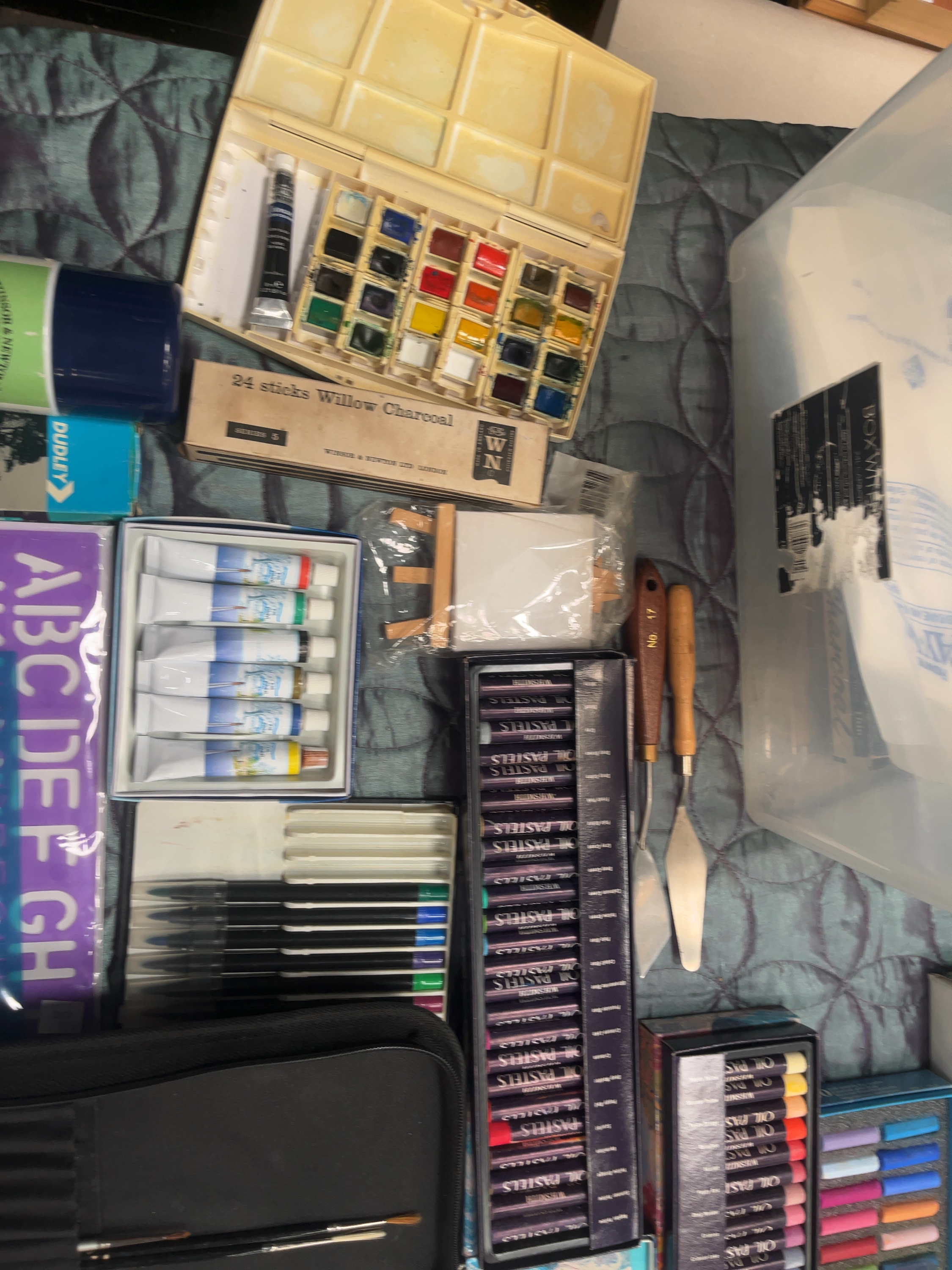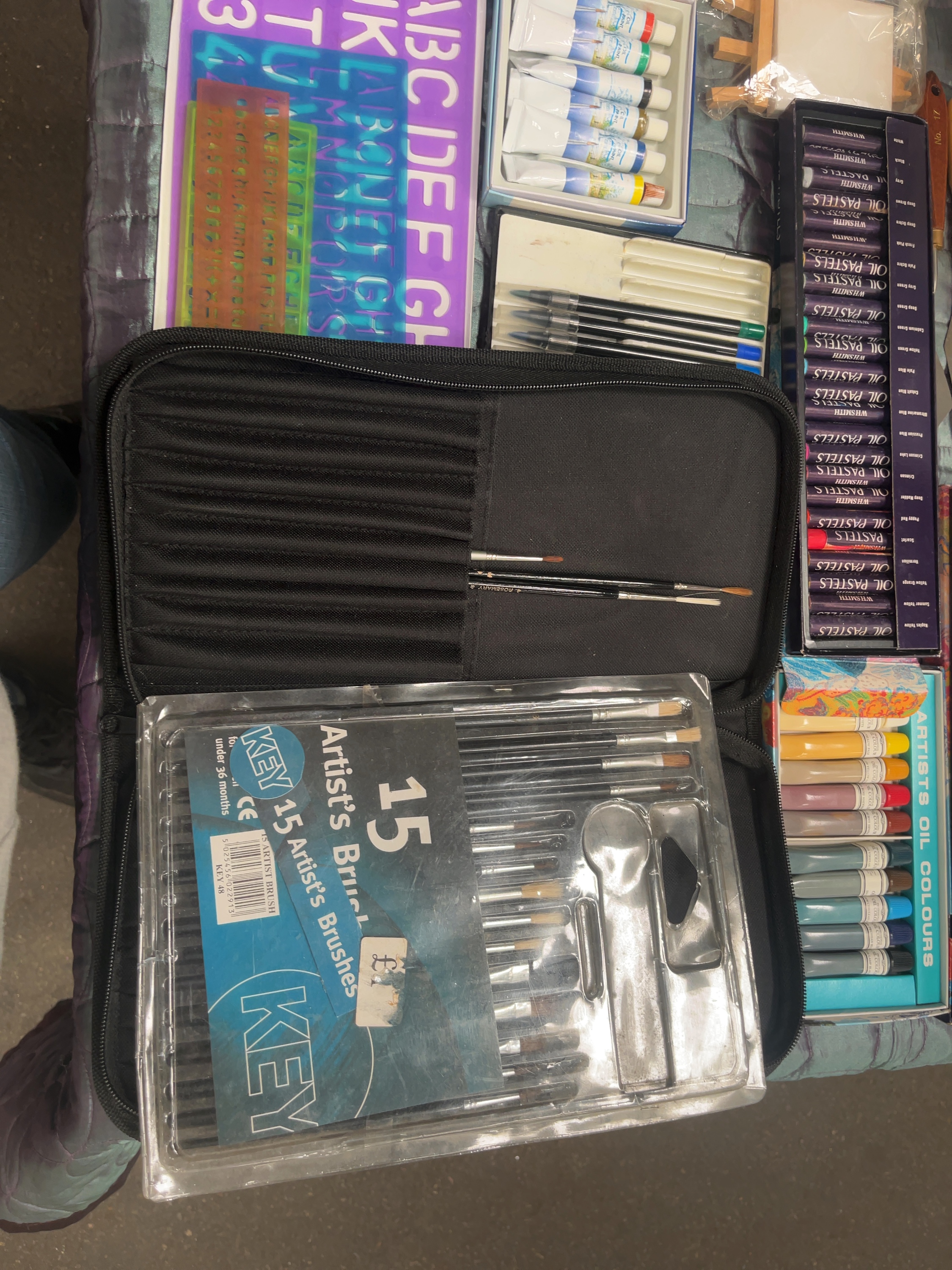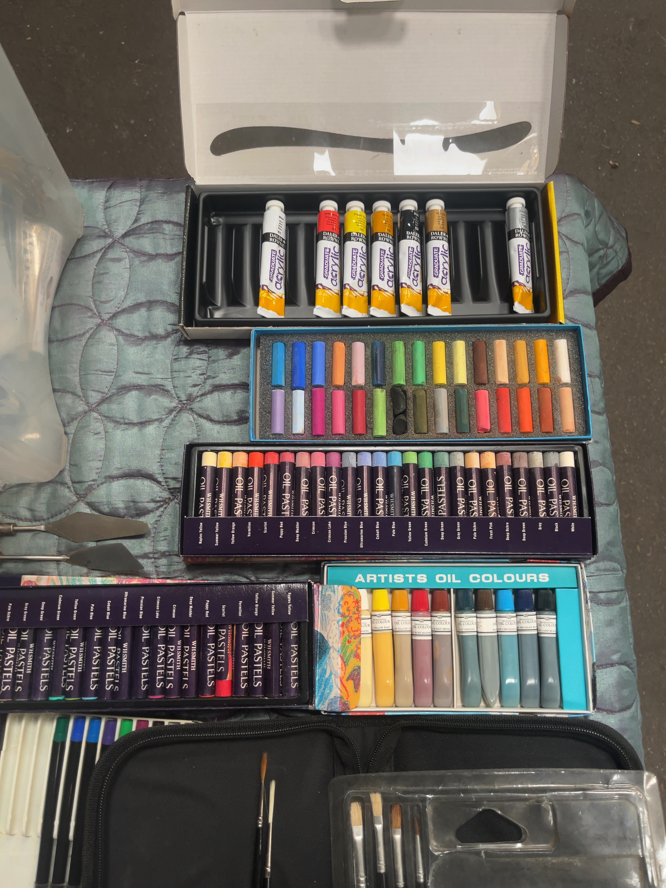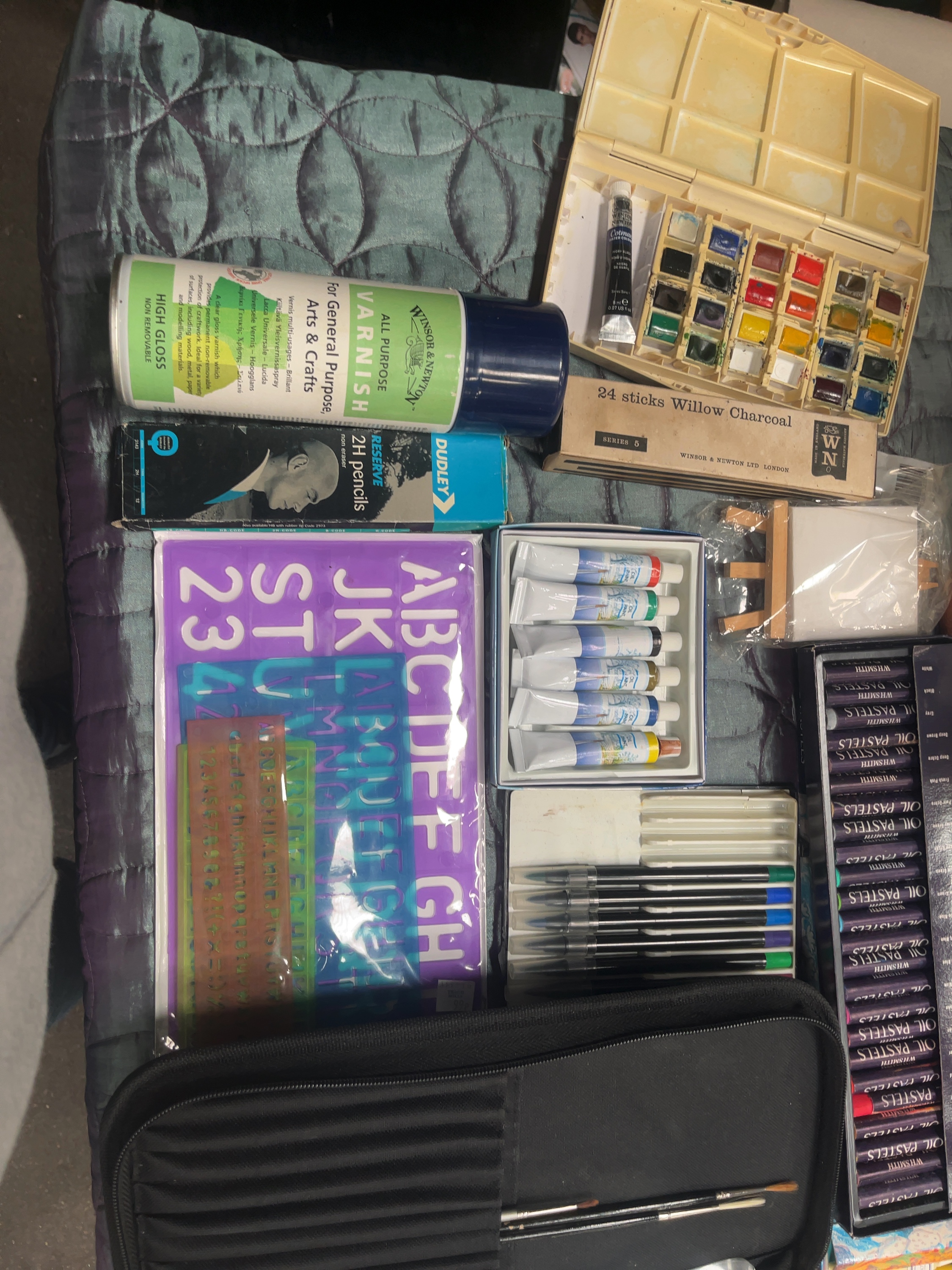 An assortment of artists’ materials and supplies from various manufacturers. The collection includes a set of Daler-Rowney Graduate acrylic paints in tubes, multiple boxed sets of WHSmith oil pastels, and a Winsor & Newton Cotman watercolour palette. Also present is a canister of Winsor & Newton all-purpose varnish, a box of Winsor & Newton willow charcoal, and a boxed set of artists’ oil colours. Supporting equipment comprises a Key 15-piece artist’s brush set in original packaging, a black fabric brush roll containing various brushes, and several palette knives with wooden handles. Additional items include a miniature wooden easel with a small canvas, various lettering and numbering stencils, a box of Dudley 2H pencils, and a clear plastic storage container holding miscellaneous craft accessories and materials.