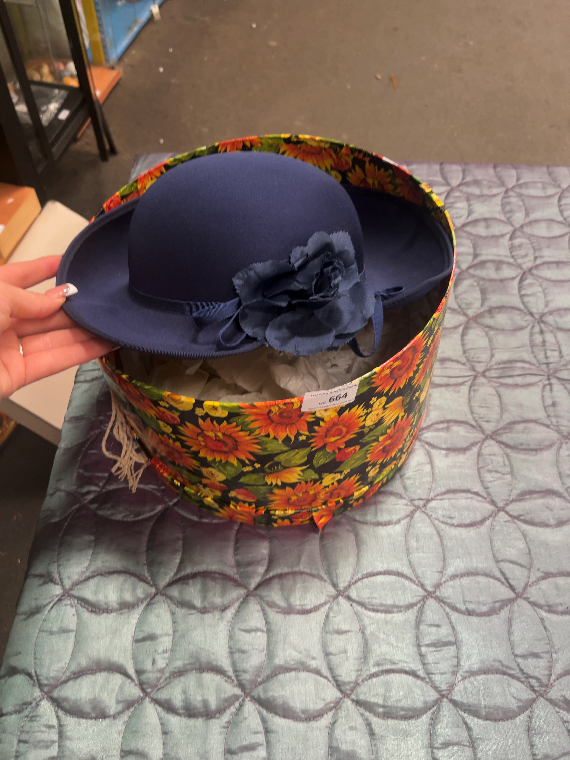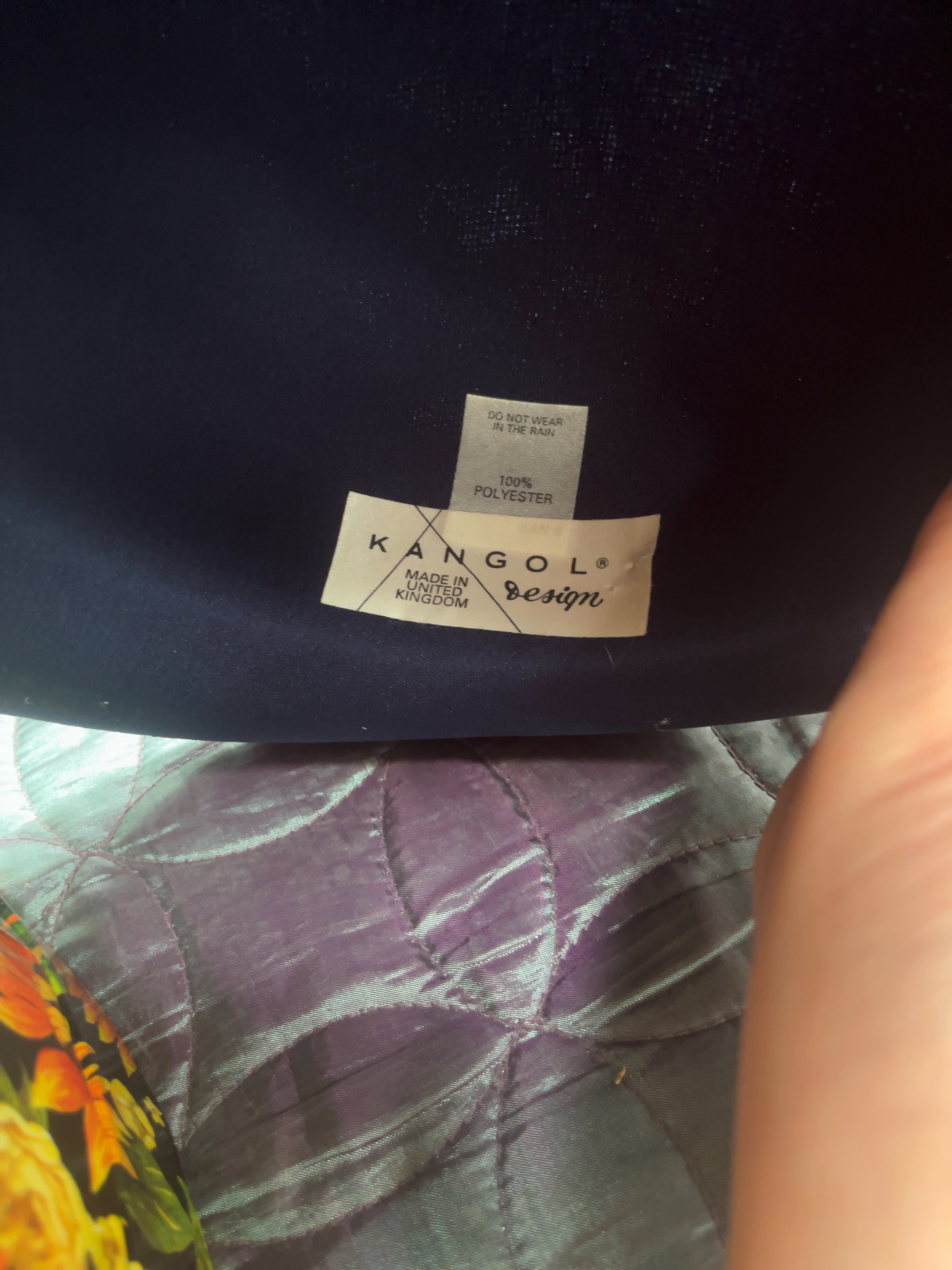 A lady’s wide-brimmed dress hat manufactured by Kangol in the United Kingdom, circa 1970s-1980s. The piece is constructed from navy blue 100% polyester with a smooth finish. The design features a rounded dome crown and a wide brim with a subtle upward curve. Decorative elements include a navy fabric flower and a grosgrain ribbon bow at the base of the crown. The brim edge is finished with a coordinating grosgrain-style binding. The interior contains two labels: a primary white fabric label with the transcription K A N G O L, MADE IN UNITED KINGDOM, and a stylised script word design; a secondary care label states DO NOT WEAR IN THE RAIN and 100% POLYESTER. The lot is accompanied by a circular hat box with a sunflower print and a lot tag from a previous sale.