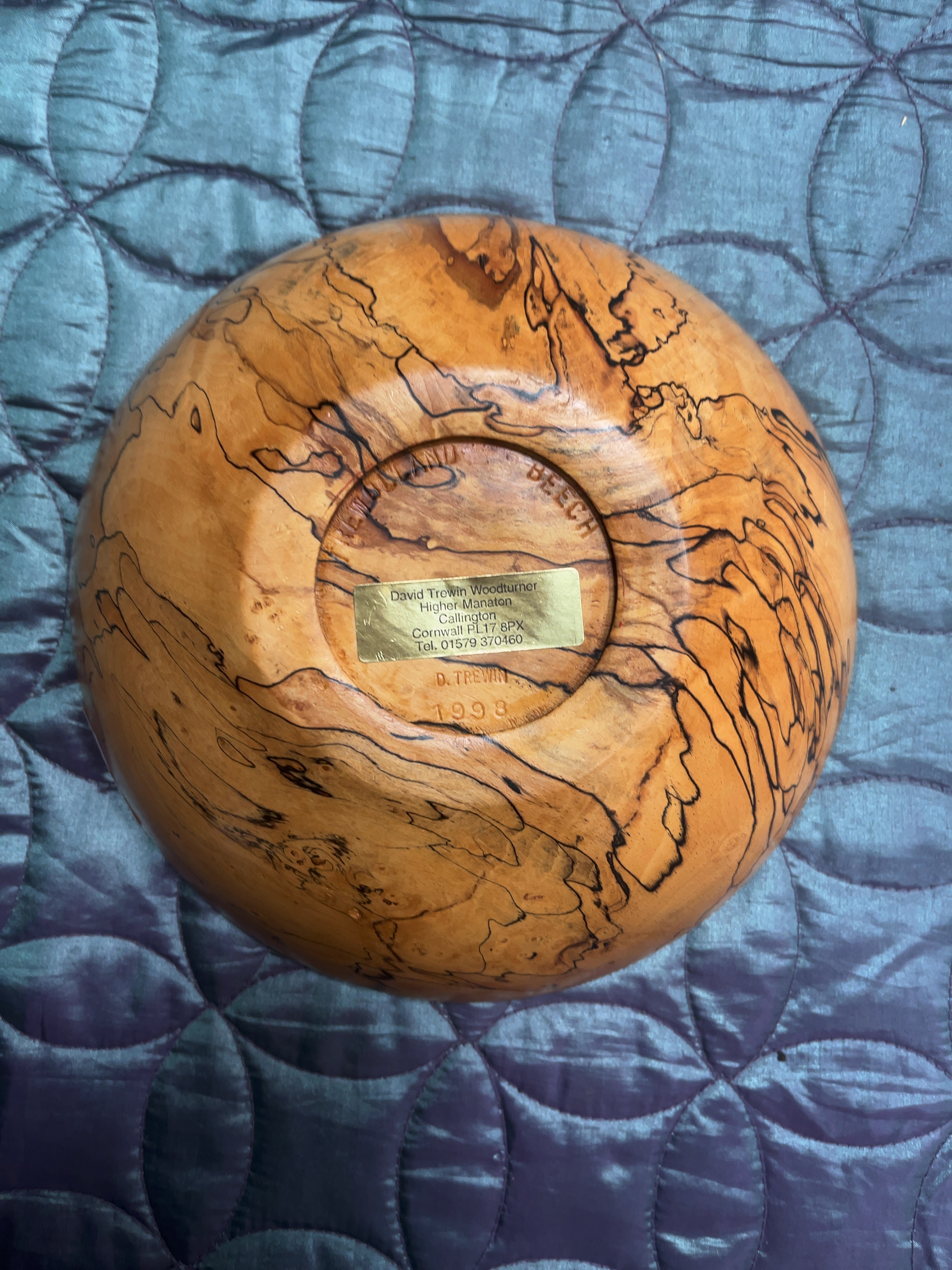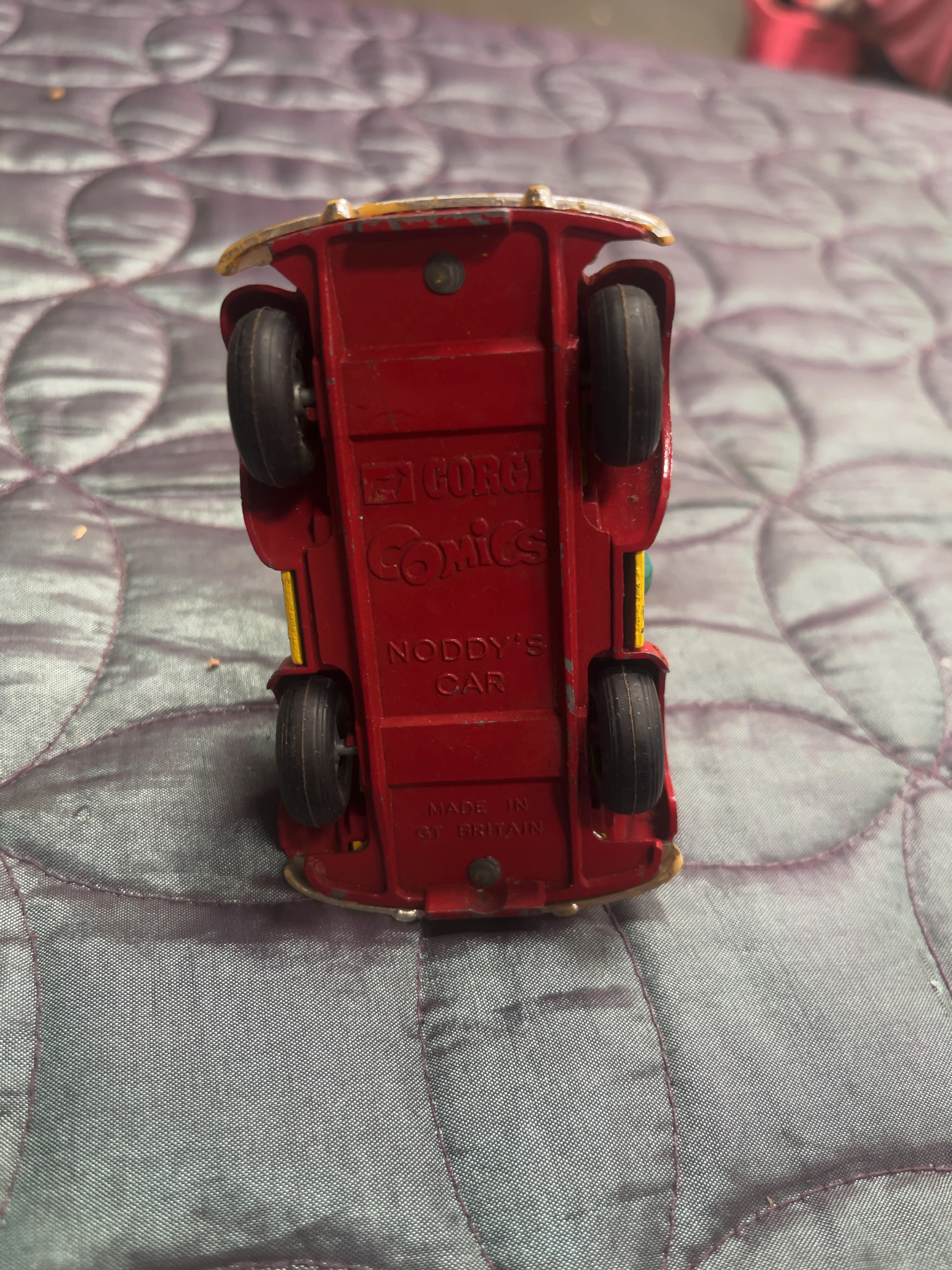 This lot comprises two distinct items: a character vehicle and a turned wood bowl. The first item is a Corgi Comics model of Noddys Car, identified as model number 804, featuring the characters Noddy and Big Ears seated in a yellow car with red wheel arches. The vehicle is constructed with a die-cast metal body, plastic figurines, and a plastic windshield, featuring a free-wheeling mechanism. The red-painted base is embossed with the Corgi dog logo, CORGI, Comics in stylized script, NODDYS CAR, and MADE IN GT. BRITAIN. The second item is a decorative bowl crafted from spalted beech, featuring natural black fungal line figuring through the grain. The base is incised with the material SPALTED BEECH, the maker D. TREWIN, and the date 1998. A rectangular gold-coloured label is also present on the base for David Trewin Woodturner, Higher Manaton, Callington, Cornwall.