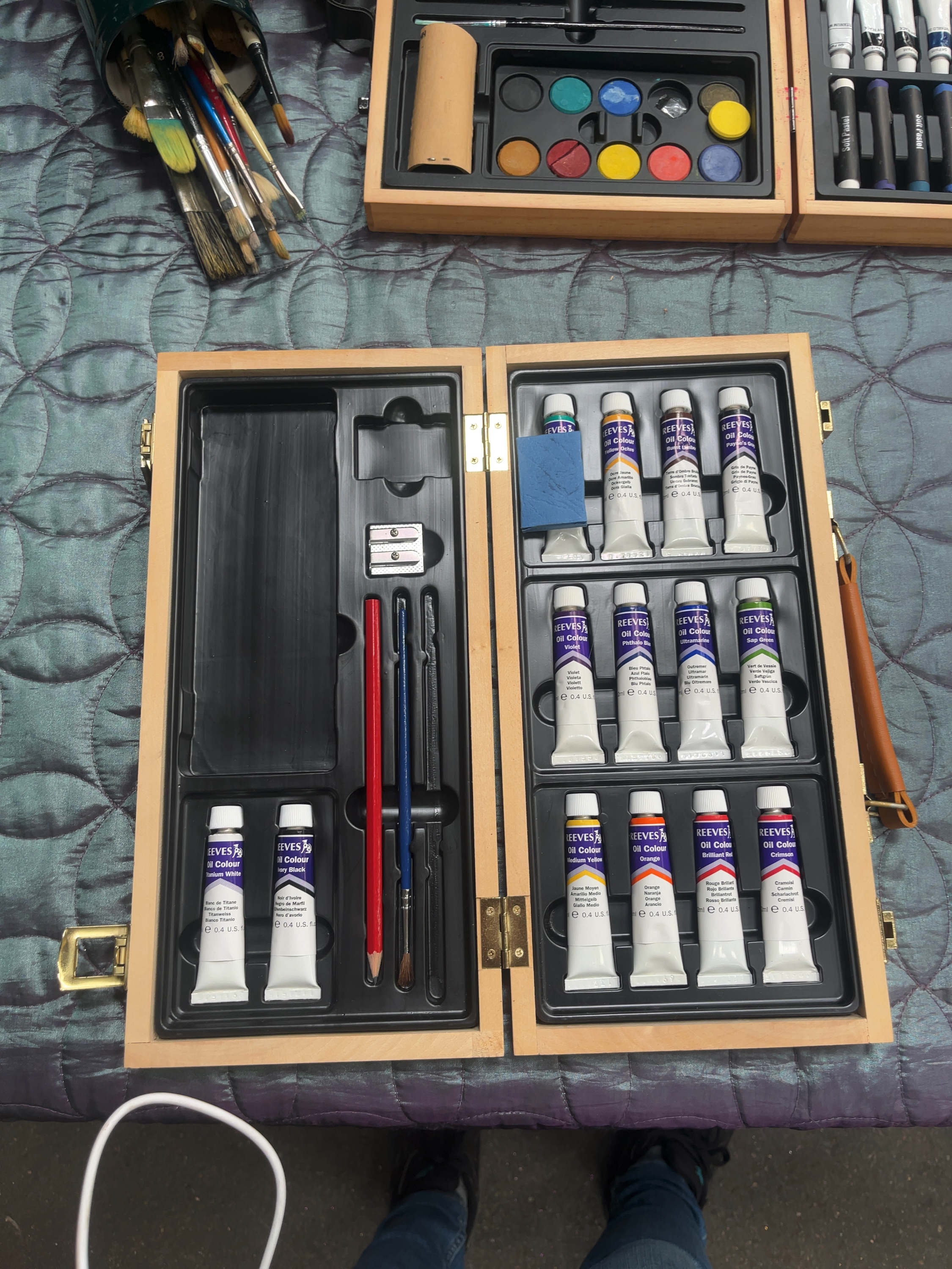 A collection of artist’s materials and equipment primarily contained within two hinged wooden carrying cases featuring black plastic internal dividers and brass-tone hardware. The contents include a set of Reeves oil paint tubes in various colours including Titanium White, Ivory Black, Crimson, and Yellow Ochre, alongside a selection of soft and oil pastels, water-soluble pencils, and watercolour pans. Drawing accessories include pencils, a sharpener, and a sponge. The lot also includes a repurposed Jameson Irish Whiskey cylindrical tin containing a group of artist’s brushes in various sizes and styles, including round, flat, and fan-shaped brushes.