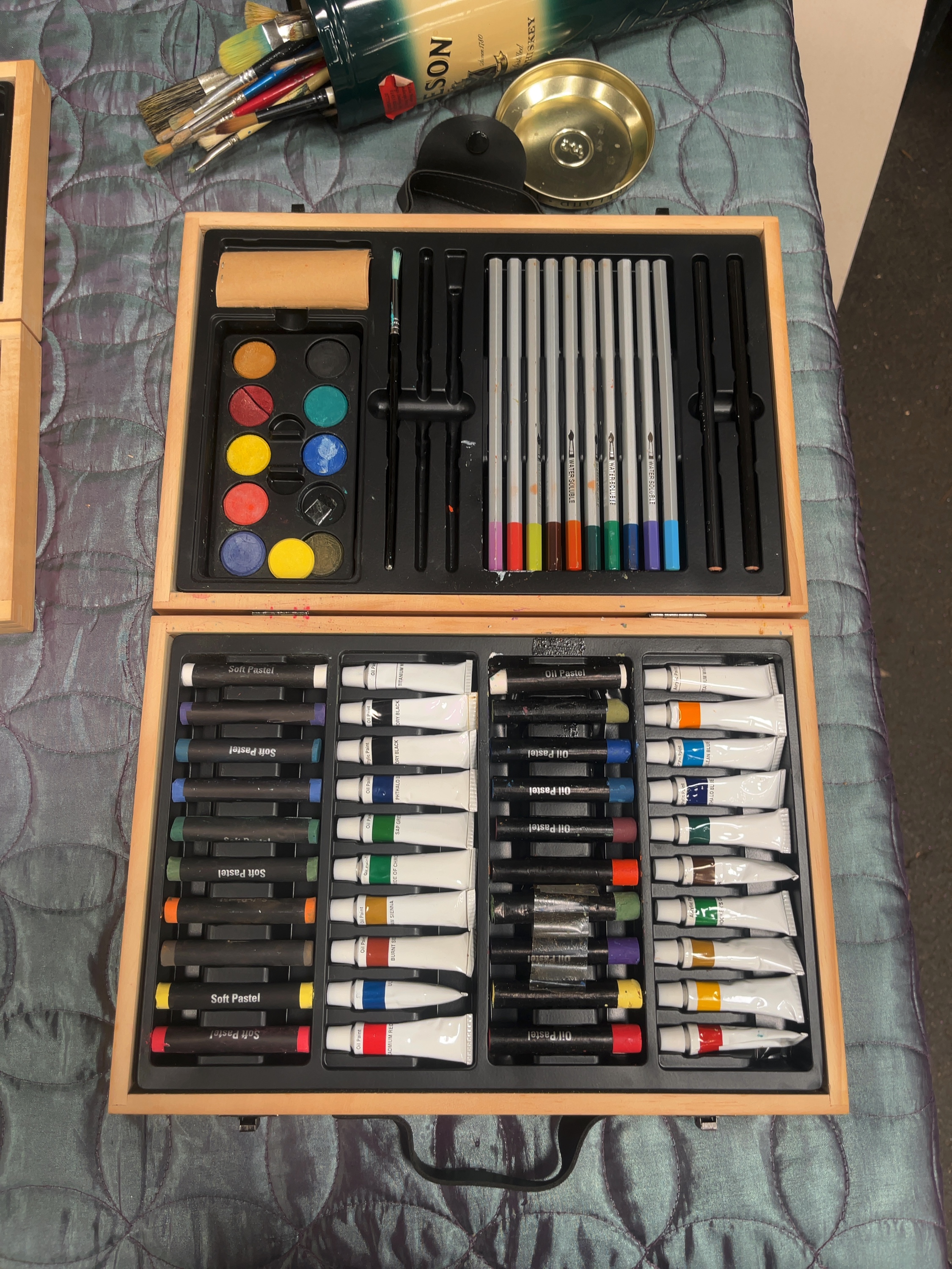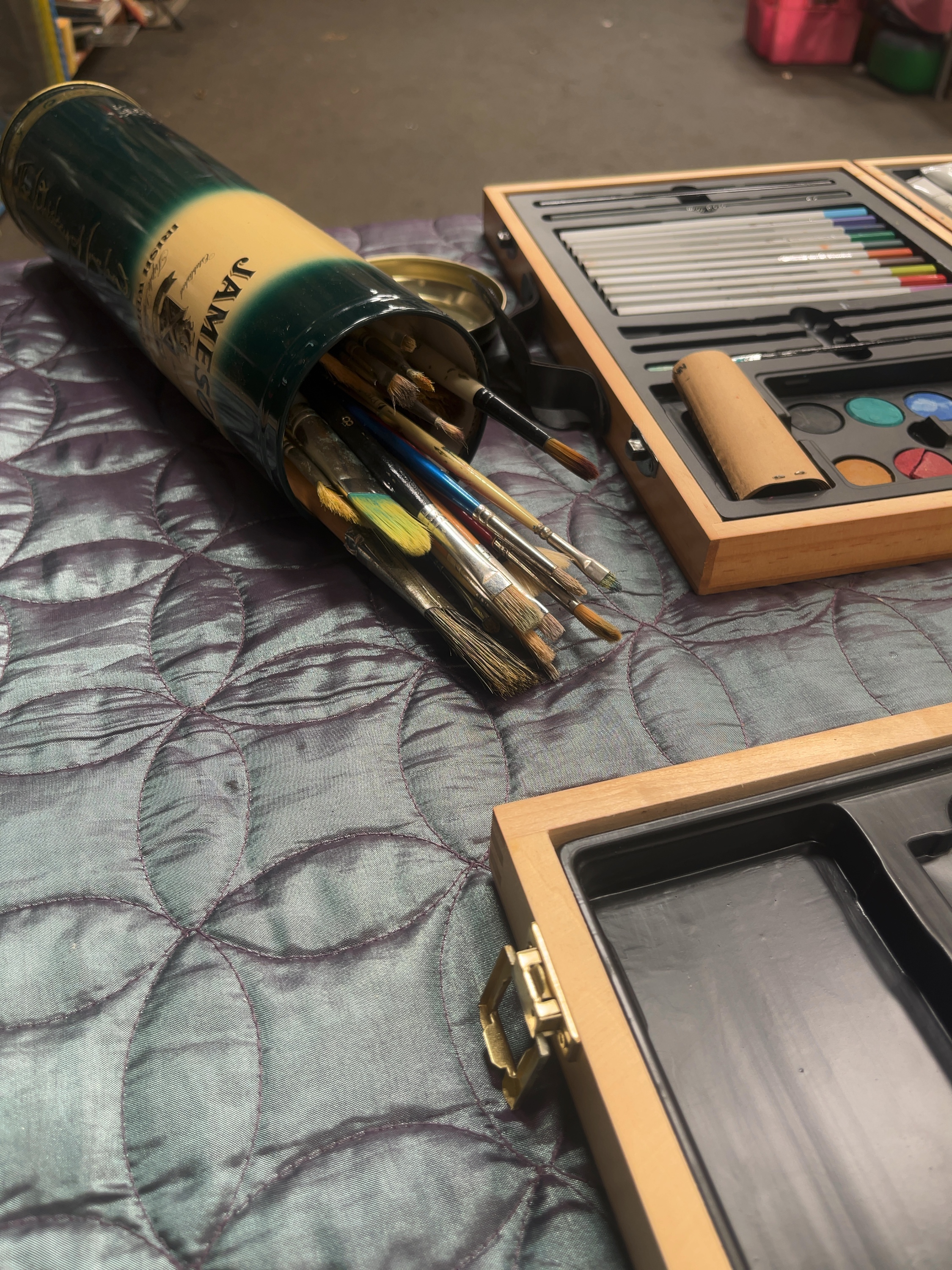 The collection shows signs of previous professional use. Paint residue is visible on the brushes and several paint tubes are partially used. The wooden cases and the whiskey tin show minor surface wear and abrasions consistent with age and utility.