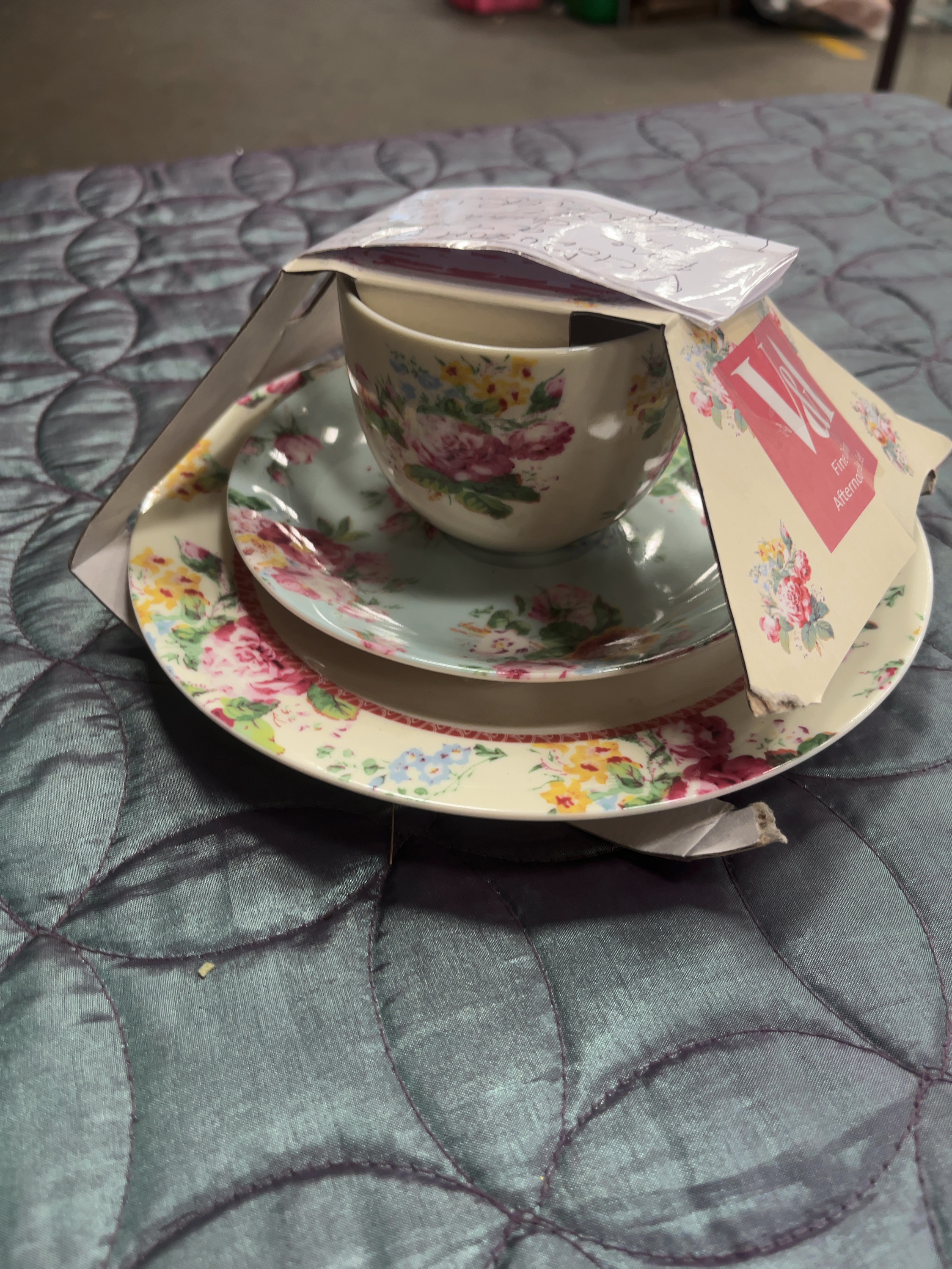 A three-piece tea set comprising a teacup, saucer, and side plate, produced for the Victoria and Albert Museum. The pieces are constructed from fine china and feature transfer-printed floral motifs including pink roses and yellow and blue flowers. The teacup and side plate are decorated on a cream ground, while the saucer features a pale blue ground. The teacup is designed with a footed base and a scrolled handle. The set is contained within its original branded cardboard packaging.