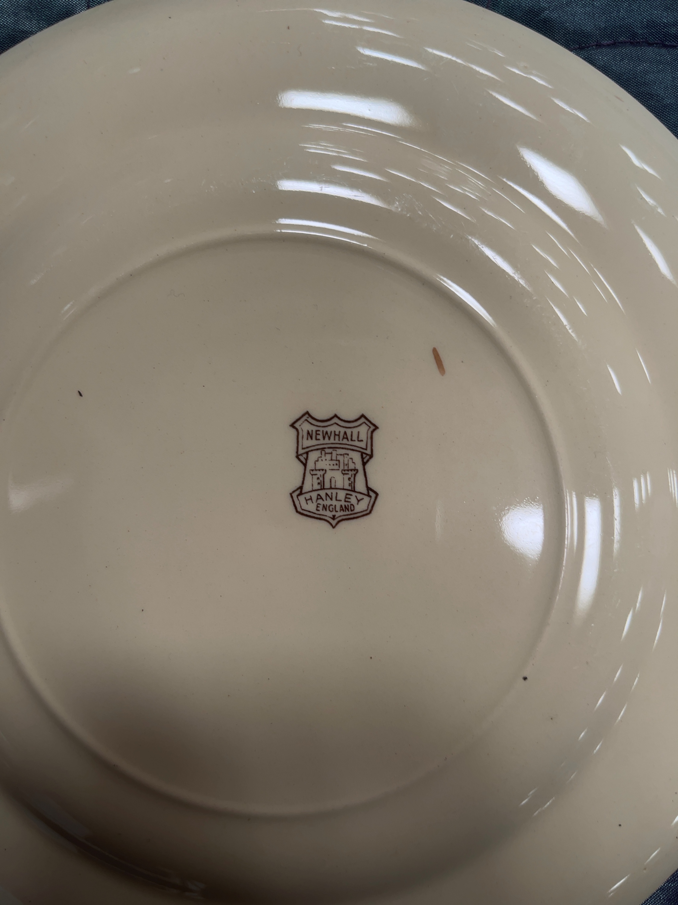 A collection of Newhall Pottery Co Ltd earthenware tablewares decorated in the Indian Tree pattern. The set comprises a circular twin-handled lidded tureen with a pedestal base and decorative finial, together with several dinner plates and side plates. The Chinoiserie-inspired decoration features a polychrome transfer-printed design of a gnarled flowering tree with pink blossoms and turquoise accents on a cream ground. The rims are finished with a brown geometric lattice border interspersed with floral sprays. Each piece bears the printed maker mark to the underside consisting of a shield-shaped cartouche containing the word NEWHALL above a stylised castle, with HANLEY and ENGLAND below. This mark was utilised by the factory during the mid-20th century.