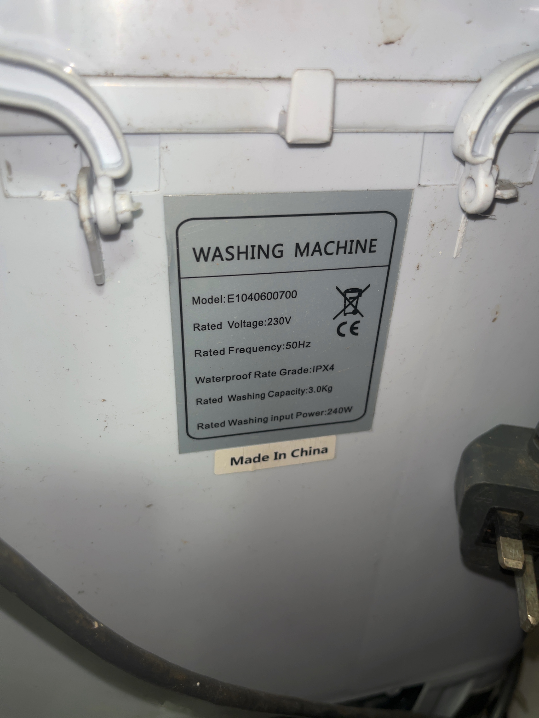 A COSVALVE portable top-loading washing machine, model number E1040600700. This compact appliance is constructed from white and turquoise plastic with a cream-coloured lid. It features a rated washing capacity of 3.0kg and operates on a 230V, 50Hz power supply with a rated input power of 240W. The interface consists of a mechanical control dial for setting wash times up to 10 minutes and spin times up to 3 minutes. The unit is fitted with a standard UK three-pin power cable. A drainage hose and internal clothes-spin basket are present. The manufacturer label indicates the unit was made in China.