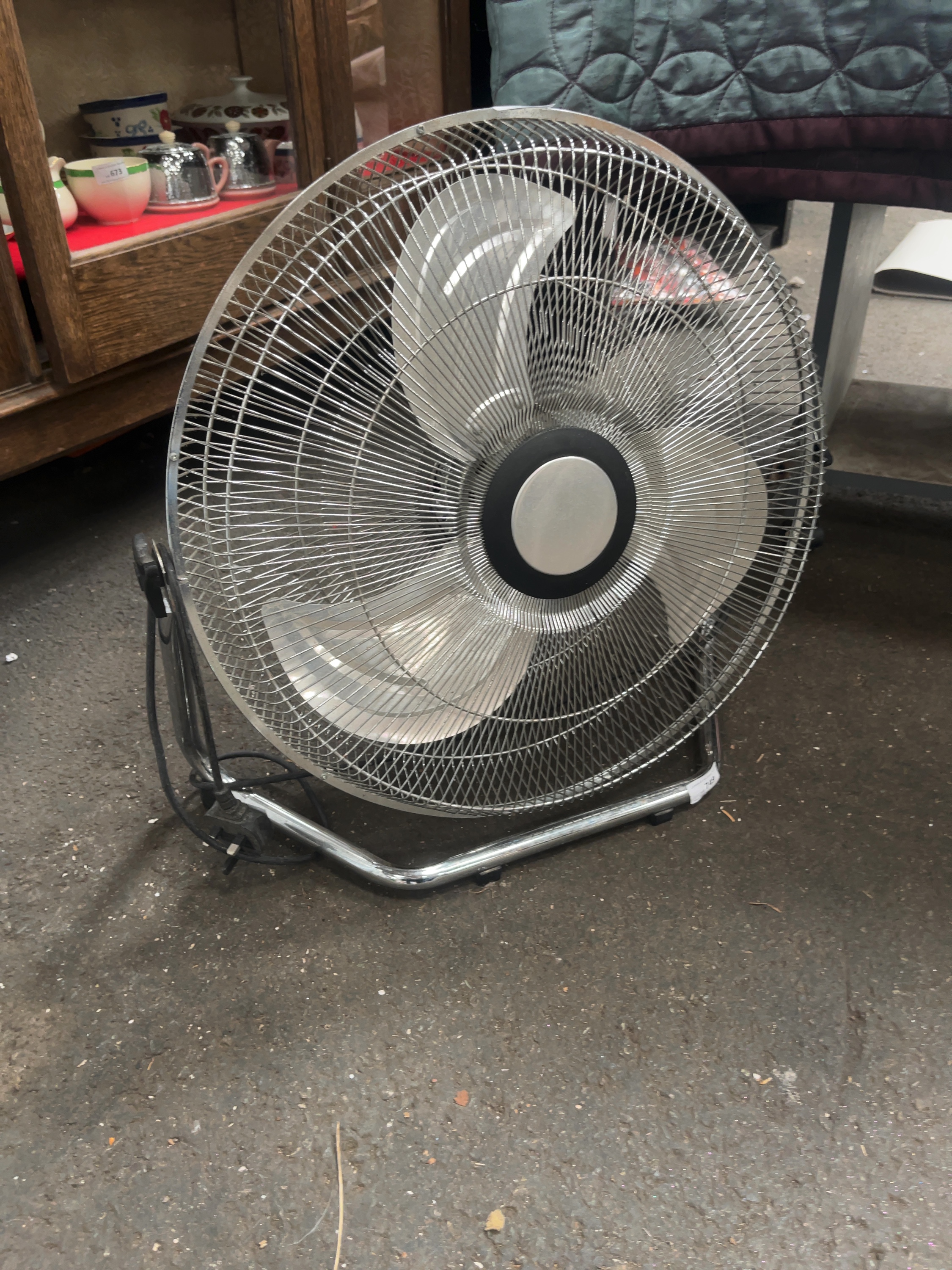 The fan is in used condition with accumulated dust visible on the blades and safety grill. There are signs of minor surface wear and light oxidisation to the metal frame and pivoting brackets. Electrical components are untested.