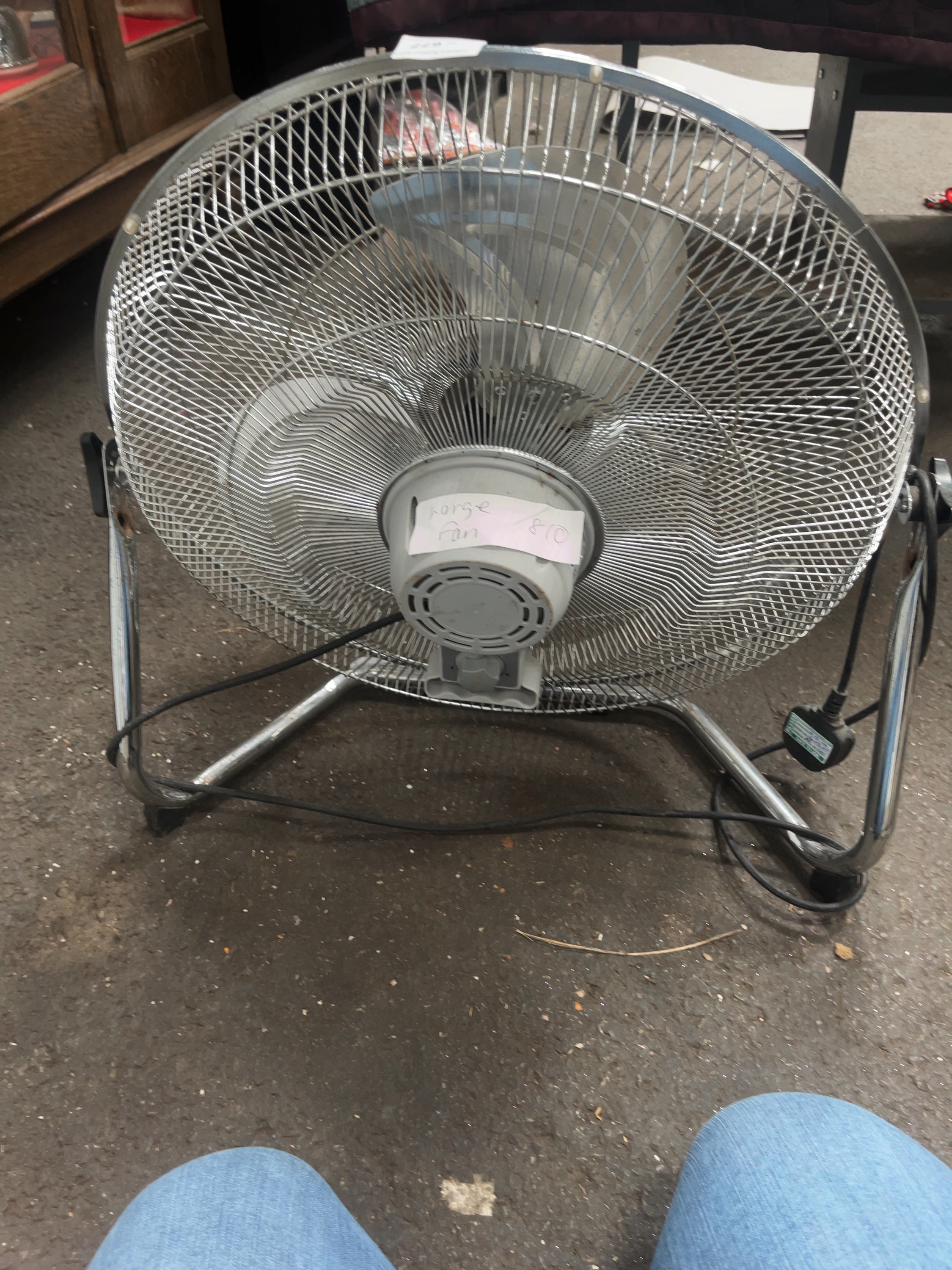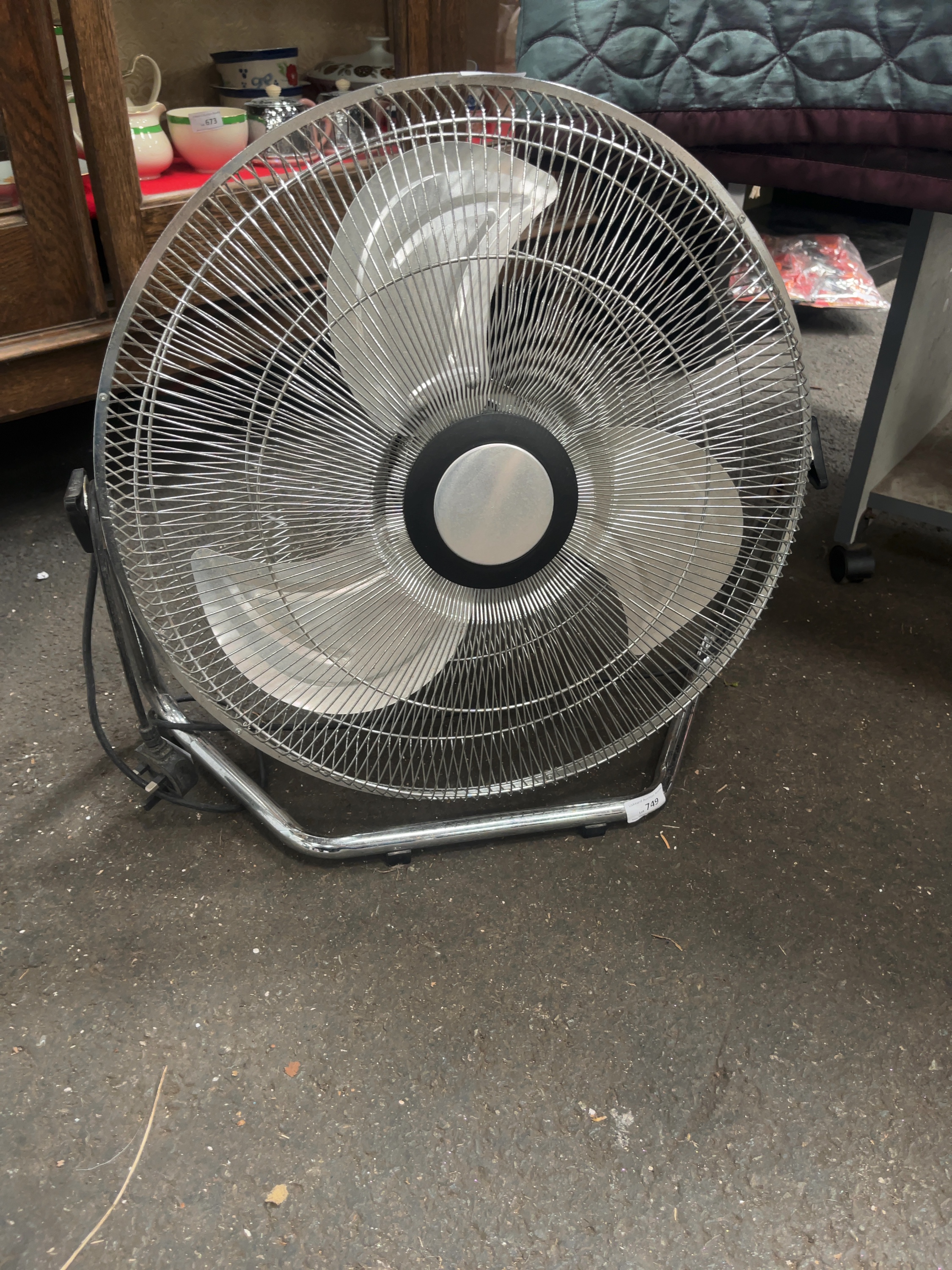 A high-velocity floor fan of contemporary industrial design, featuring a chrome-plated tubular metal frame and a circular wire safety grill. The unit houses three silver-toned metal blades and is mounted on a pivoting U-shaped frame, allowing for tilt adjustment via black plastic tension knobs. A handwritten sticker on the rear motor housing reads Large fan £10, and a small adhesive label on the base displays the number 749. The fan is fitted with a black power cable and a standard UK three-pin plug.