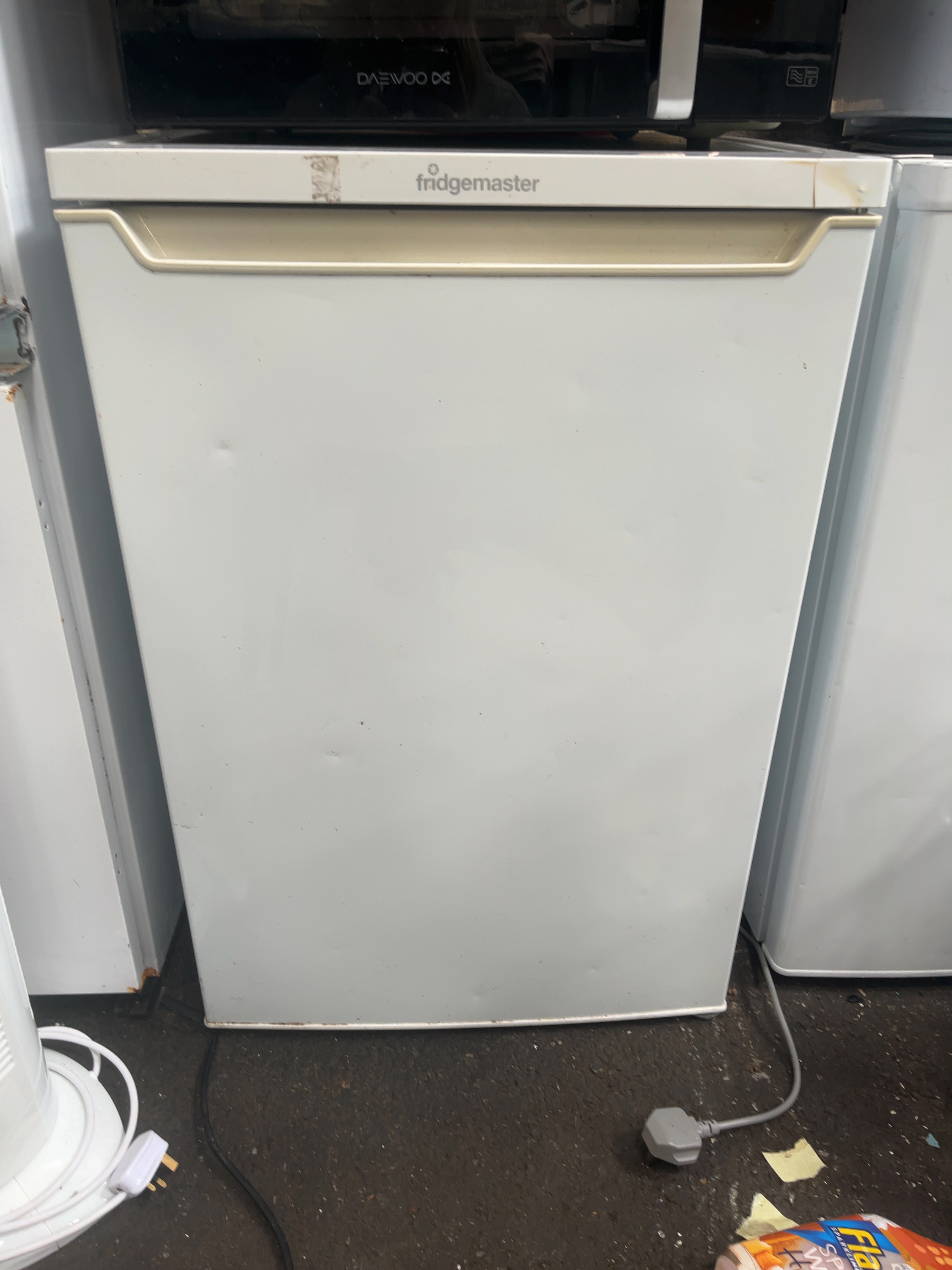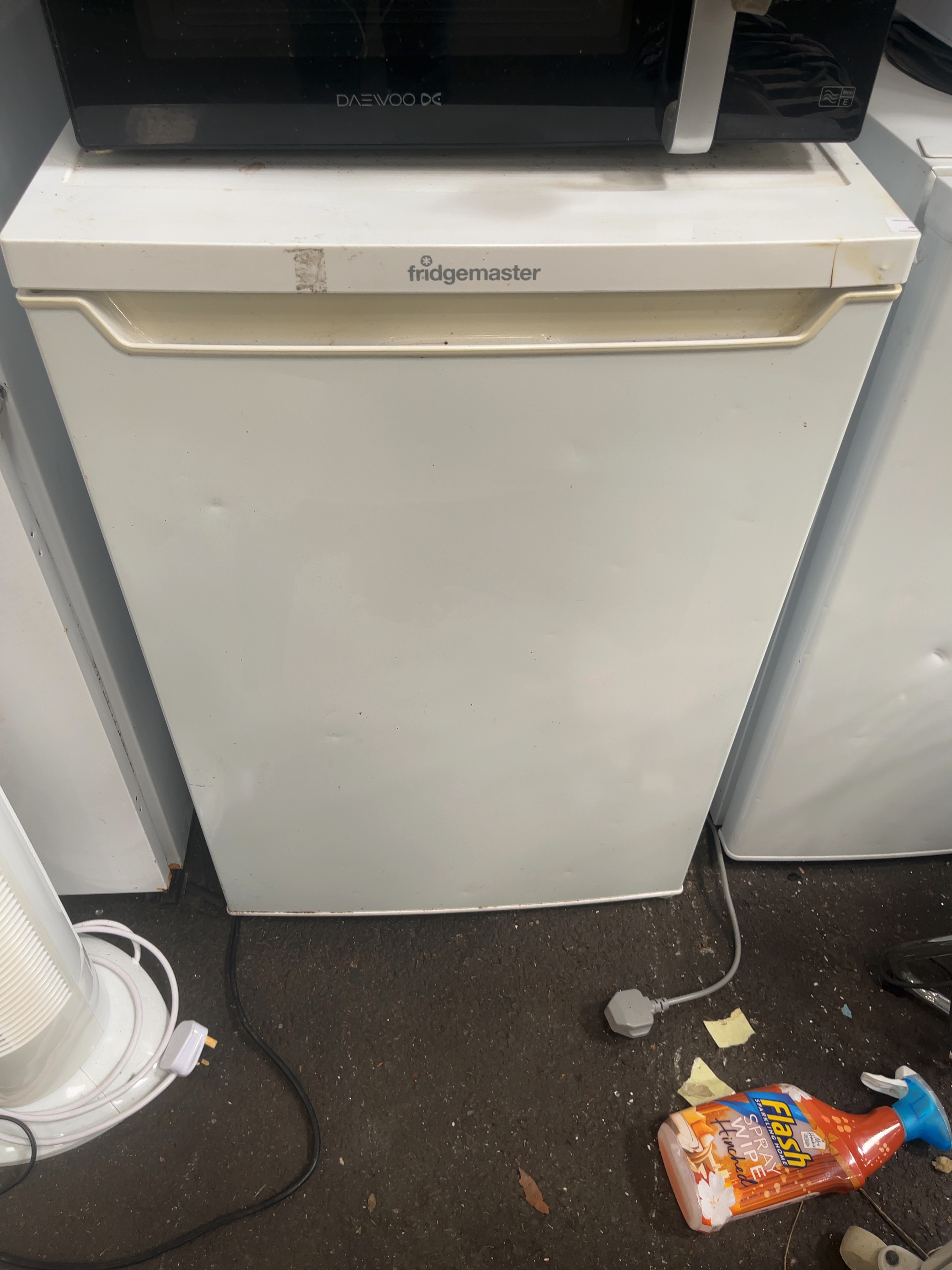 A lot consisting of two kitchen appliances: a Fridgemaster under-counter refrigerator and a Daewoo microwave. The refrigerator is finished in white and features the manufacturer’s mark in grey lowercase lettering on the front upper trim. It is designed with a recessed handle and includes a grey power cable with a standard UK three-pin plug. The microwave is finished in black and is situated on top of the refrigerator unit. No model numbers, serial numbers, capacity specifications, or energy ratings are visible on the exterior of either item.