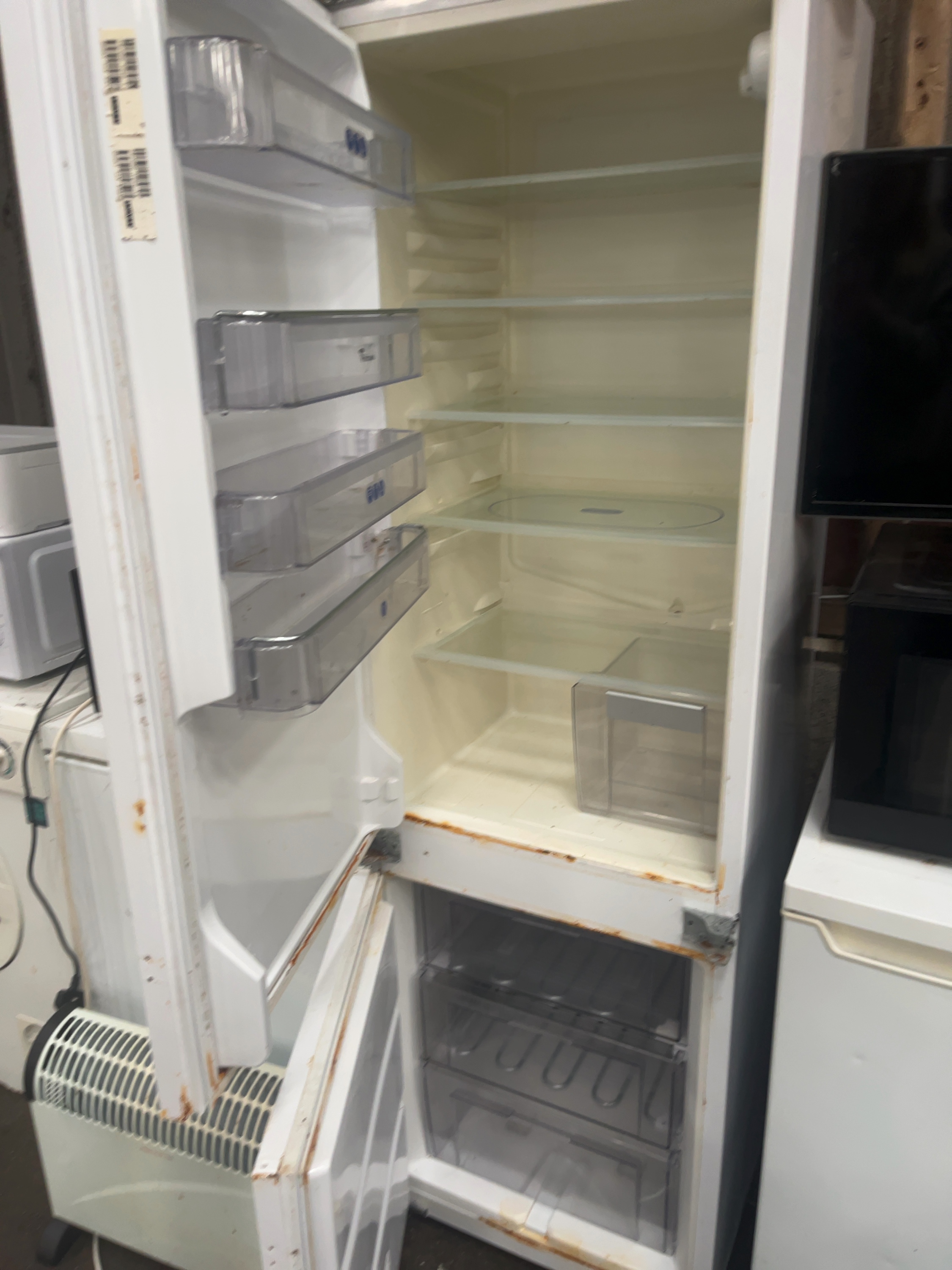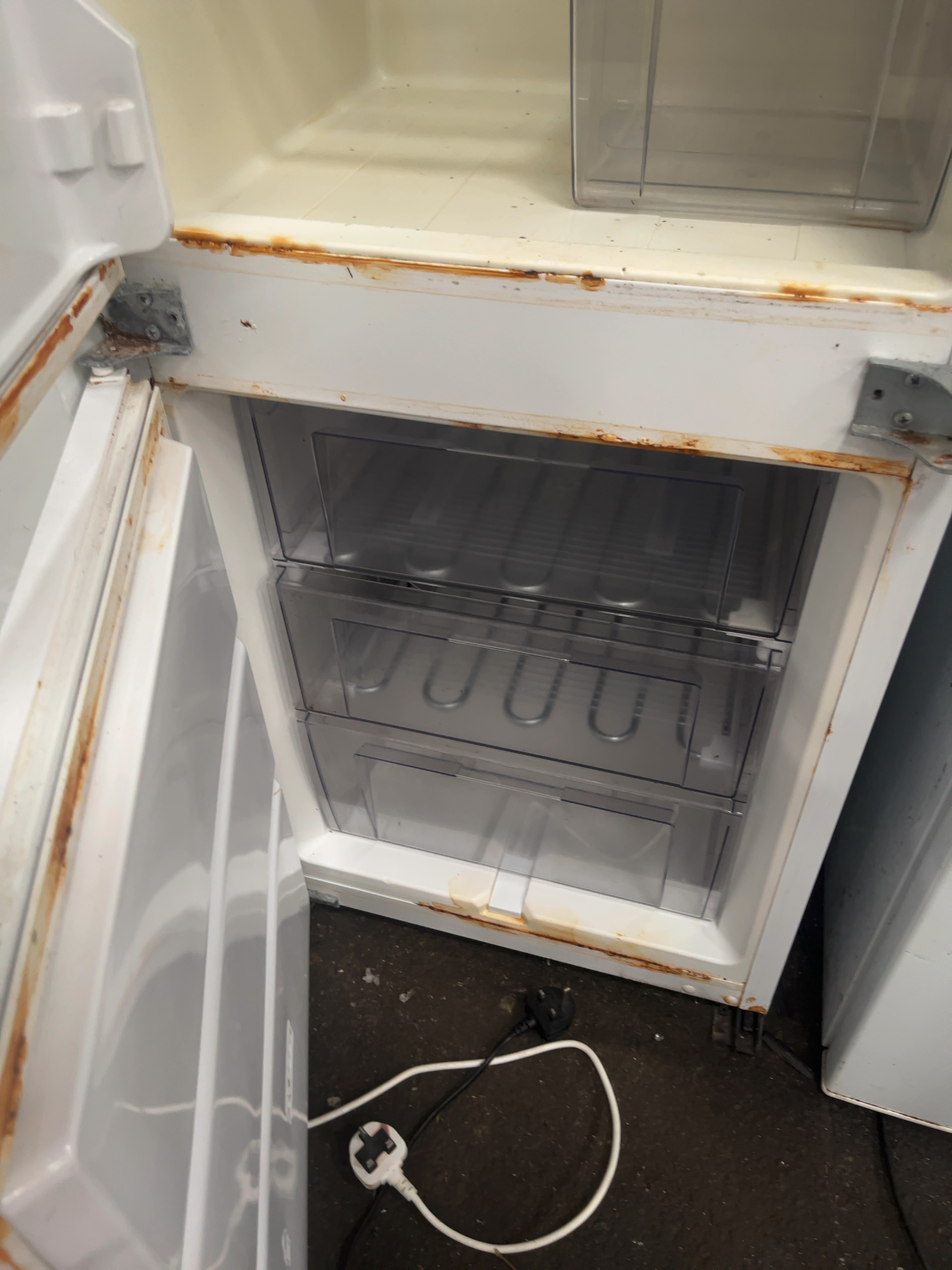 The unit is in fair to poor condition. Significant rust and orange staining are present around the door seals, hinges, and the central horizontal frame separating the compartments. The interior plastic shows signs of yellowing. The item is offered unpowered and the operational status is unknown.