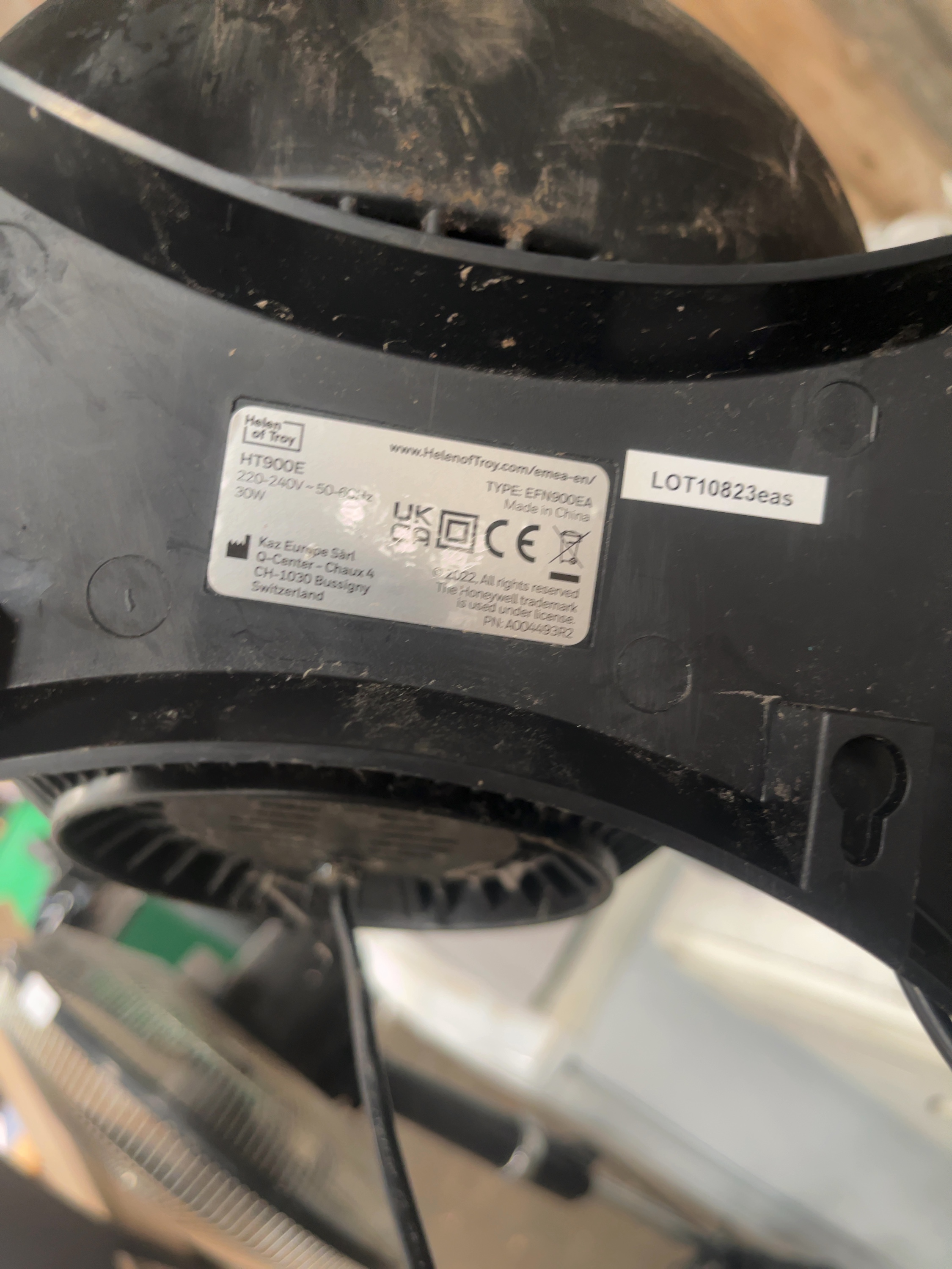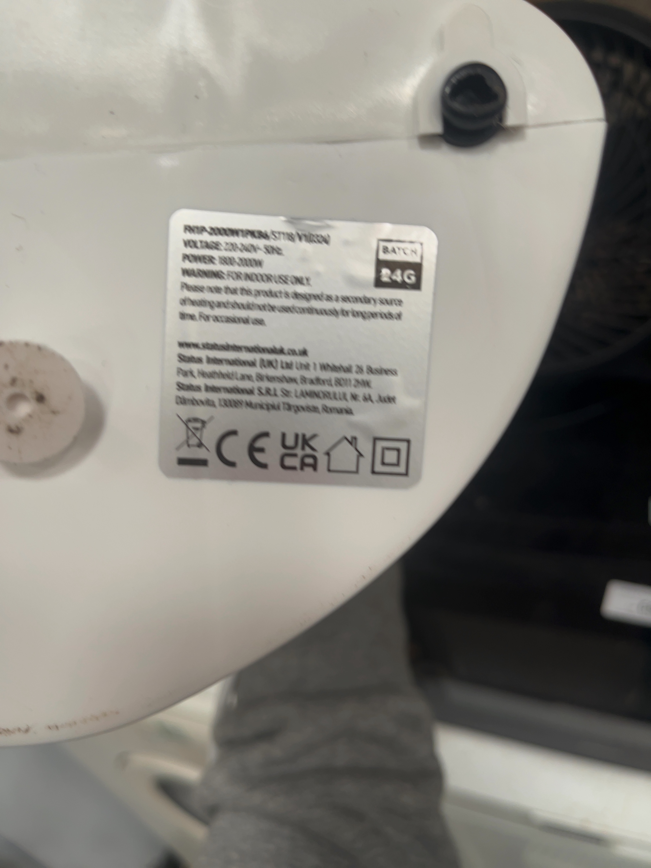 A group of two portable domestic electrical appliances. The first is a Honeywell TurboForce air circulator cooling fan, model HT900E (Type EFN900EA), constructed from black moulded plastic. It is rated at 220-240V, 50-60Hz, and 30W. The second is a Status portable fan heater, model FN1P-2000W1PKB6/S7118/V1(0324), constructed from white moulded plastic. It features an integrated carry handle and dual front-mounted control dials for thermostat and power settings, with a power rating of 1800-2000W. Both items retain their original manufacturer labels and technical specifications.