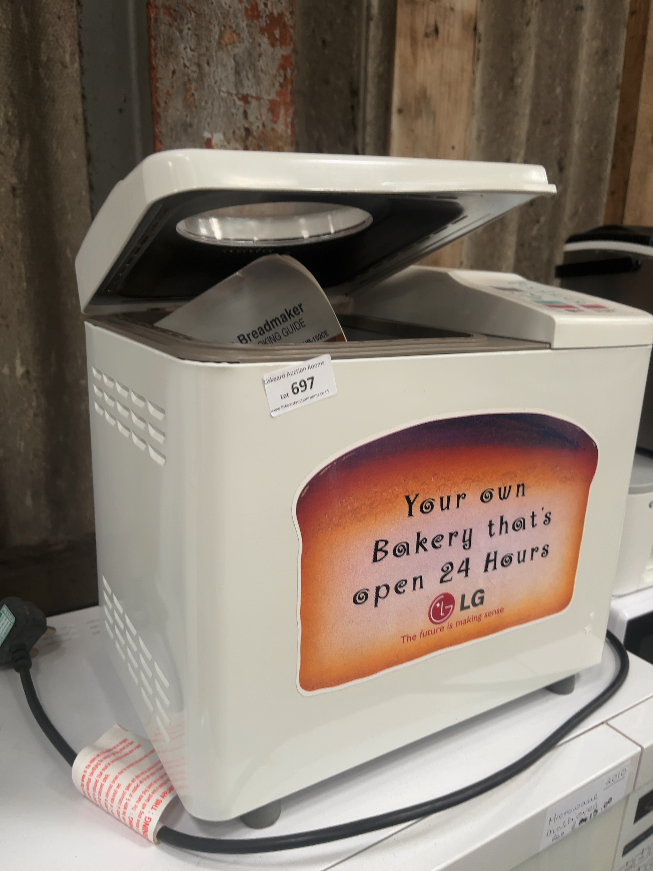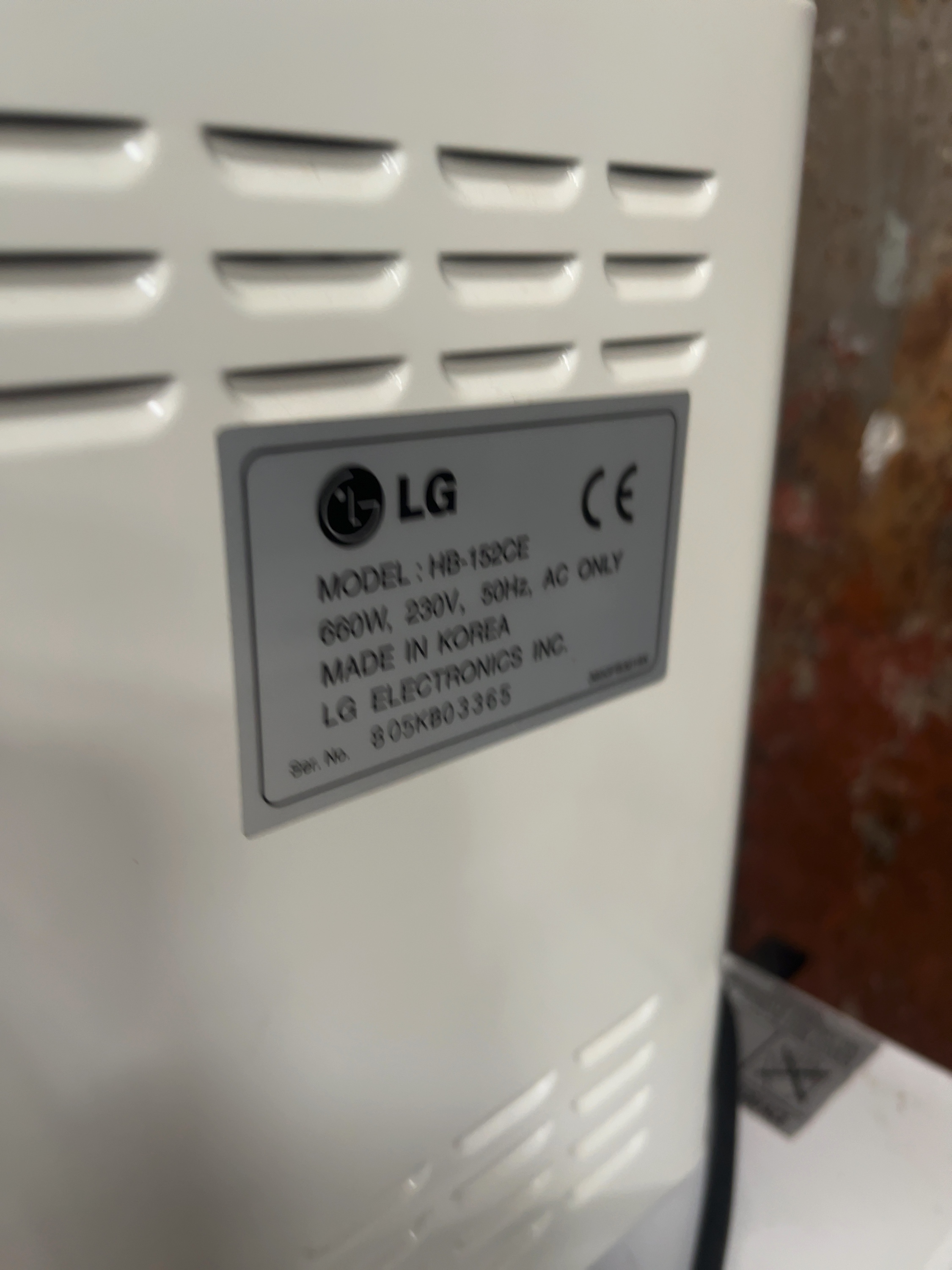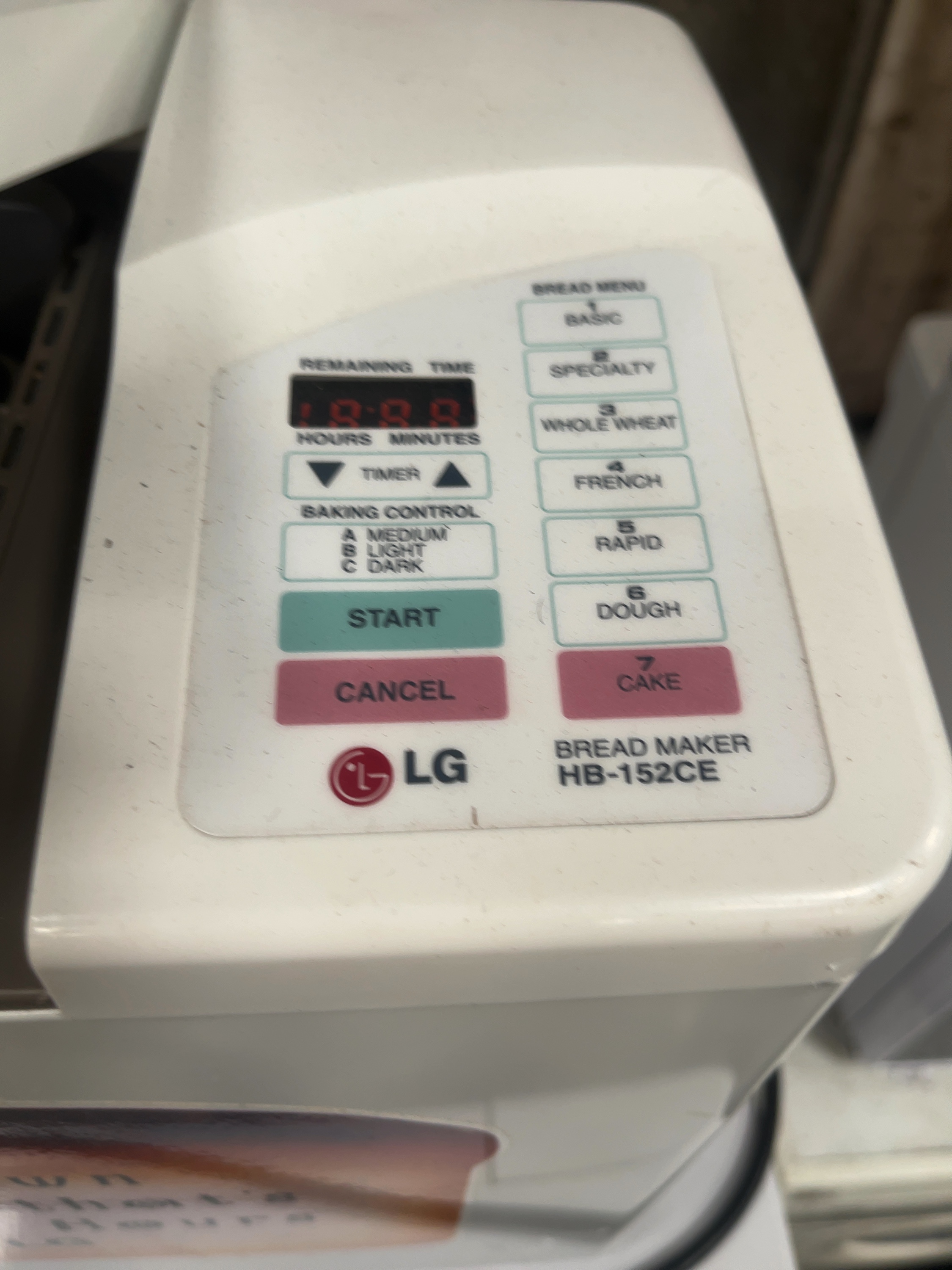 An LG breadmaker, model HB-152CE (serial no. 805KB03365), manufactured in Korea. The appliance is constructed with a white plastic housing featuring a decorative decal to the front reading Your own Bakery that is open 24 Hours. It is rated at 660W and features a digital control panel with a red LED display. The unit offers seven preset programmes: Basic, Specialty, Whole Wheat, French, Rapid, Dough, and Cake. It includes adjustable controls for crust colour (light, medium, and dark) and an integrated timer. The hinged lid is fitted with a circular viewing window. The appliance is equipped with an integrated power cord and a UK three-pin plug. A printed Breadmaker Cooking Guide instruction manual is included.