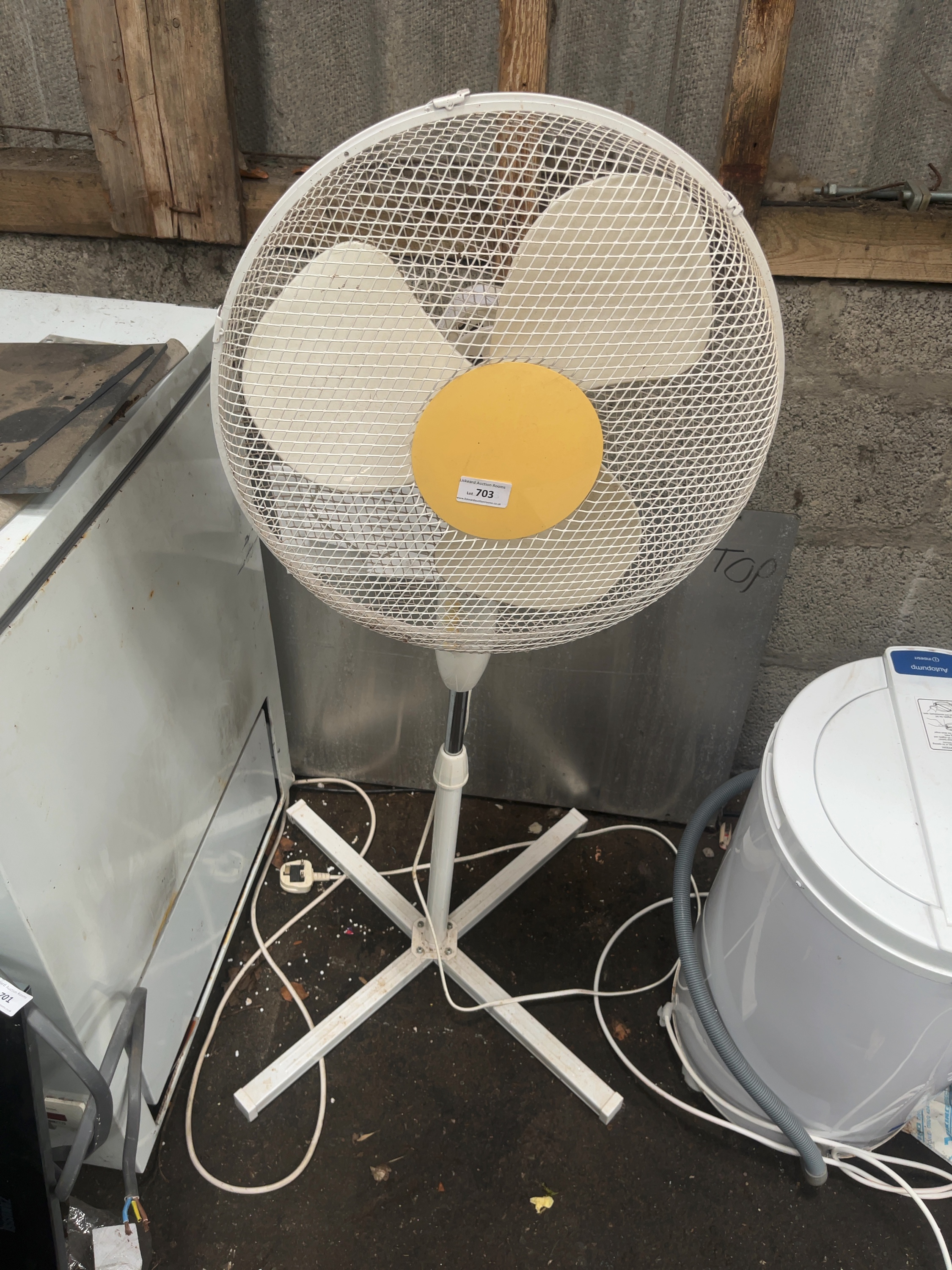 An electric pedestal cooling fan, attributed to Windmere based on design consensus. The unit features a white mesh cage housing three blades and a central yellow hub. It is mounted on a height-adjustable white pedestal supported by a four-point cross-shaped base. The fan is fitted with a white power lead and a standard UK 3-pin plug. No manufacturer brand or model number is clearly visible on the front of the unit; a temporary auction lot sticker for Liskeard Auction Rooms is applied to the central hub.