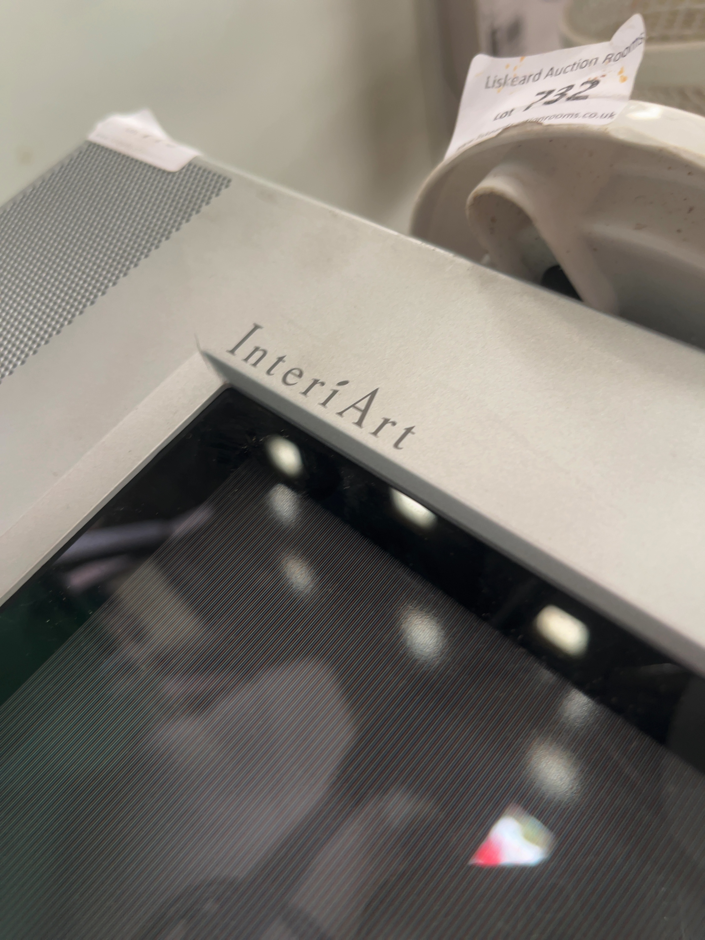 A JVC InteriArt series cathode ray tube (CRT) television featuring a silver-tone plastic housing and a large-format flat-screen glass display. The unit incorporates integrated stereo speakers positioned below the screen, branded with BBE sound enhancement technology. The front interface consists of a power button, an infrared sensor, and indicator lamps for power and eco modes. The television is fitted with a fixed power lead and a standard UK three-pin plug. This is a standard definition analogue unit with no smart features. The item bears an auction lot tag from Liskeard Auction Rooms.