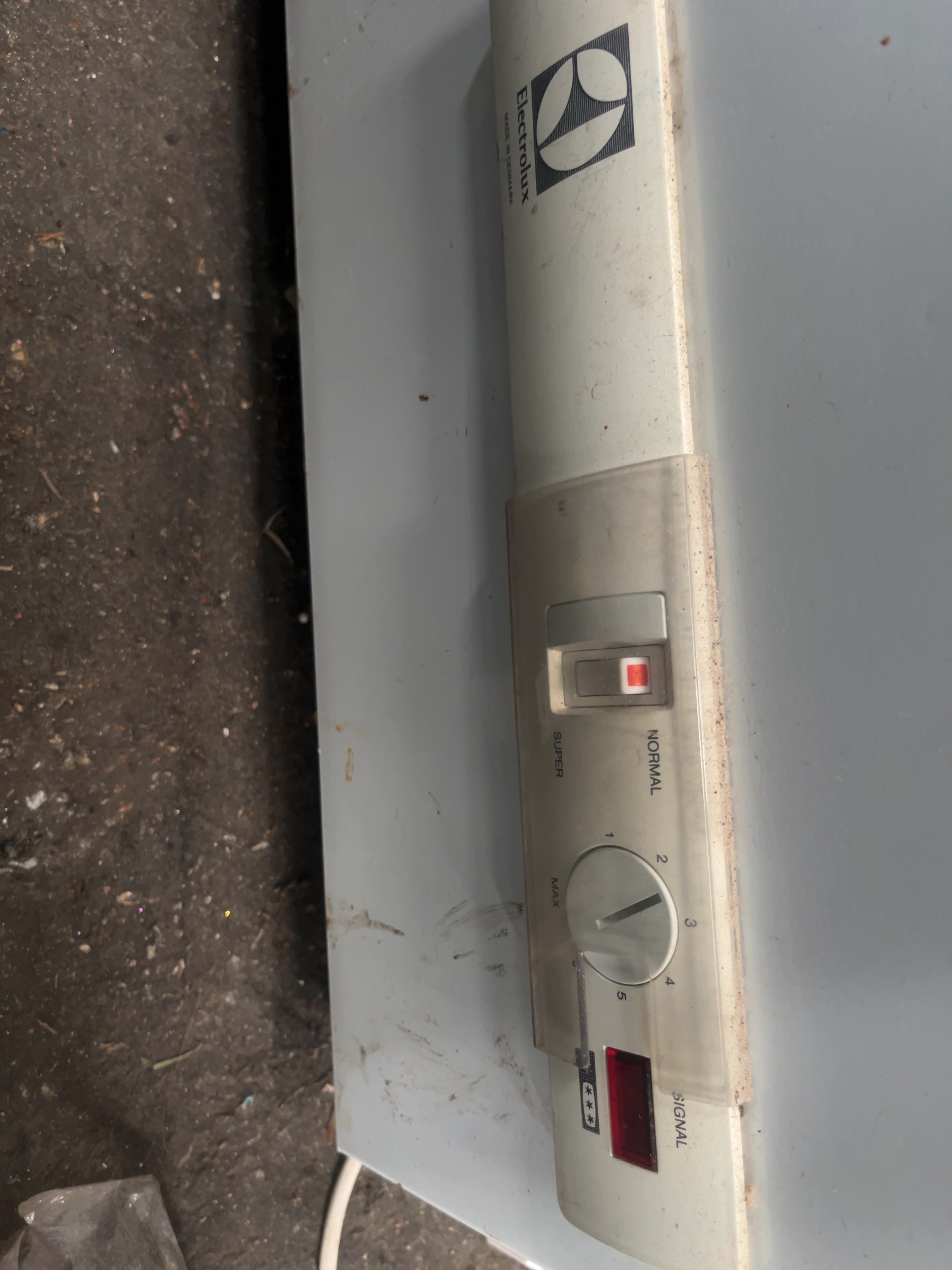 An Electrolux TC 1510 chest freezer, manufactured in Denmark. The appliance is finished in white and features a top-loading lid with a plastic handle. The front-mounted control fascia includes a rotary temperature dial with settings from 1 to 5 and MAX, a toggle switch for SUPER and NORMAL operation modes, and a red SIGNAL indicator light. The unit displays a three-star freezer rating symbol. It is equipped with a power cable and a standard UK three-pin plug. Several auction lot stickers are present on the exterior.