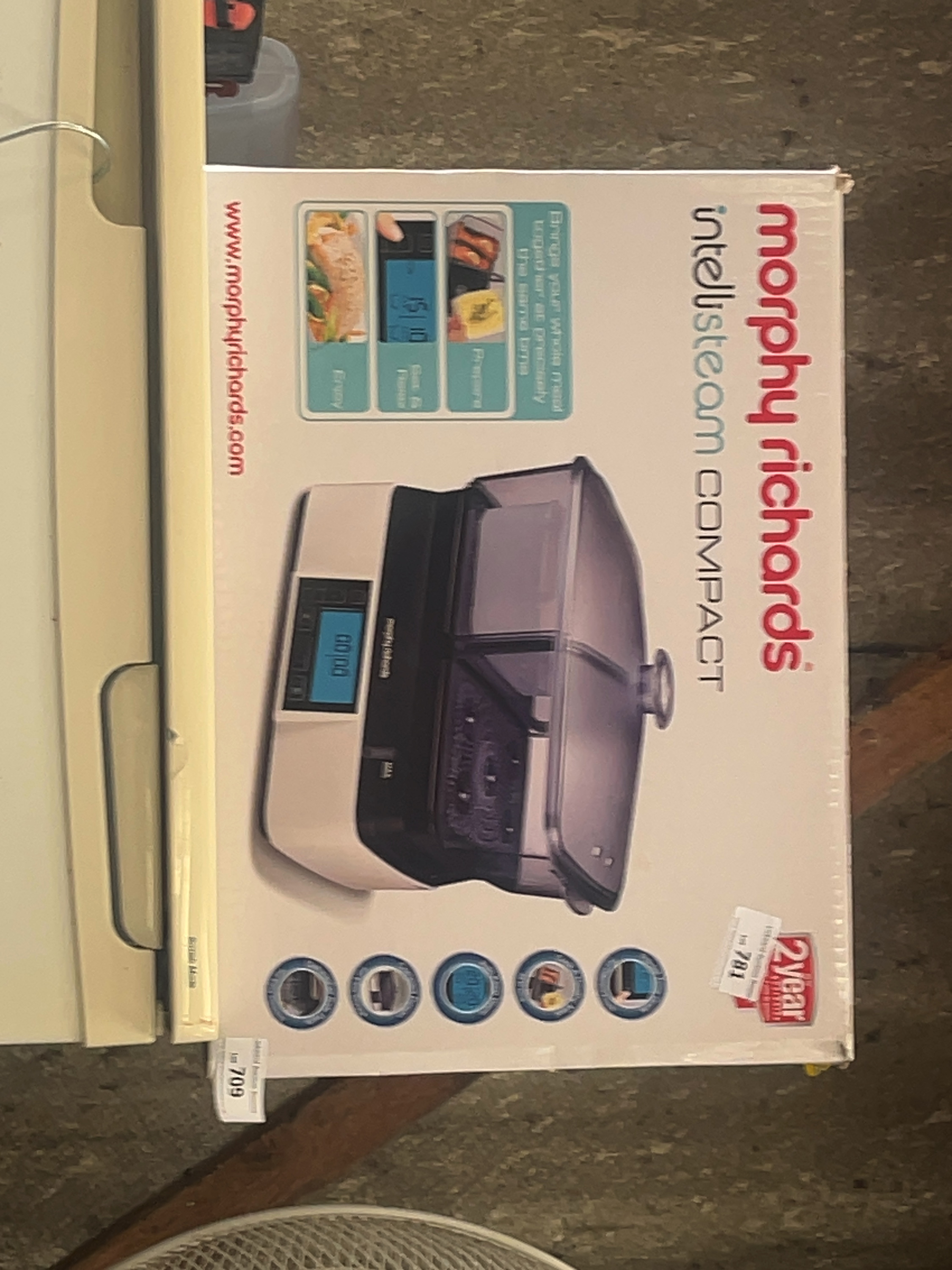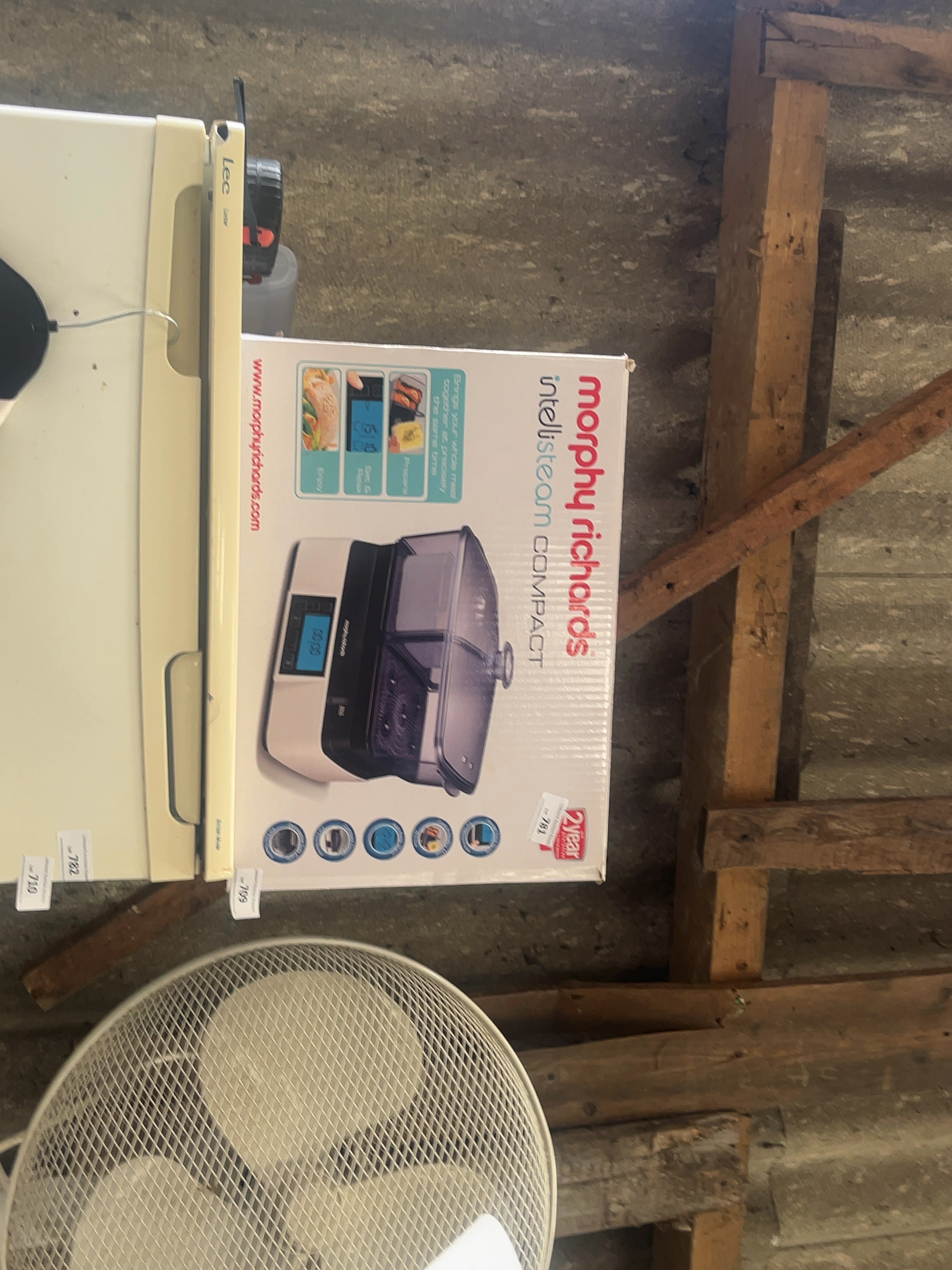 A collection of domestic electrical appliances. The group features a Morphy Richards Intellisteam Compact food steamer, 6L capacity, contained in its original retail box. The packaging indicates features including a digital display and synchronised cooking compartments for meal preparation. Also included is a cream-coloured Lec brand domestic appliance, appearing to be a refrigerator or freezer, and a white pedestal-style electric fan with a mesh grille. The items have several auction lot labels numbered 709, 781, 782, and 710 affixed to the packaging and appliance bodies.