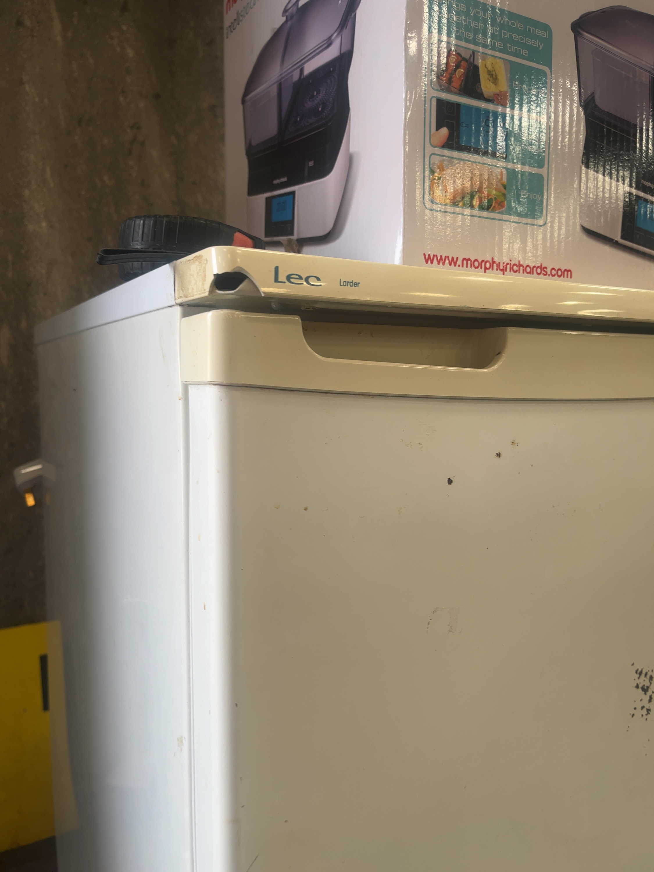 Poor condition. The plastic components exhibit heavy yellowing and discolouration. There are numerous dark scuffs, scratches, and marks to the front door and side panels. A significant piece of plastic is missing from the front left corner of the top trim. The appliance is untested for working order.