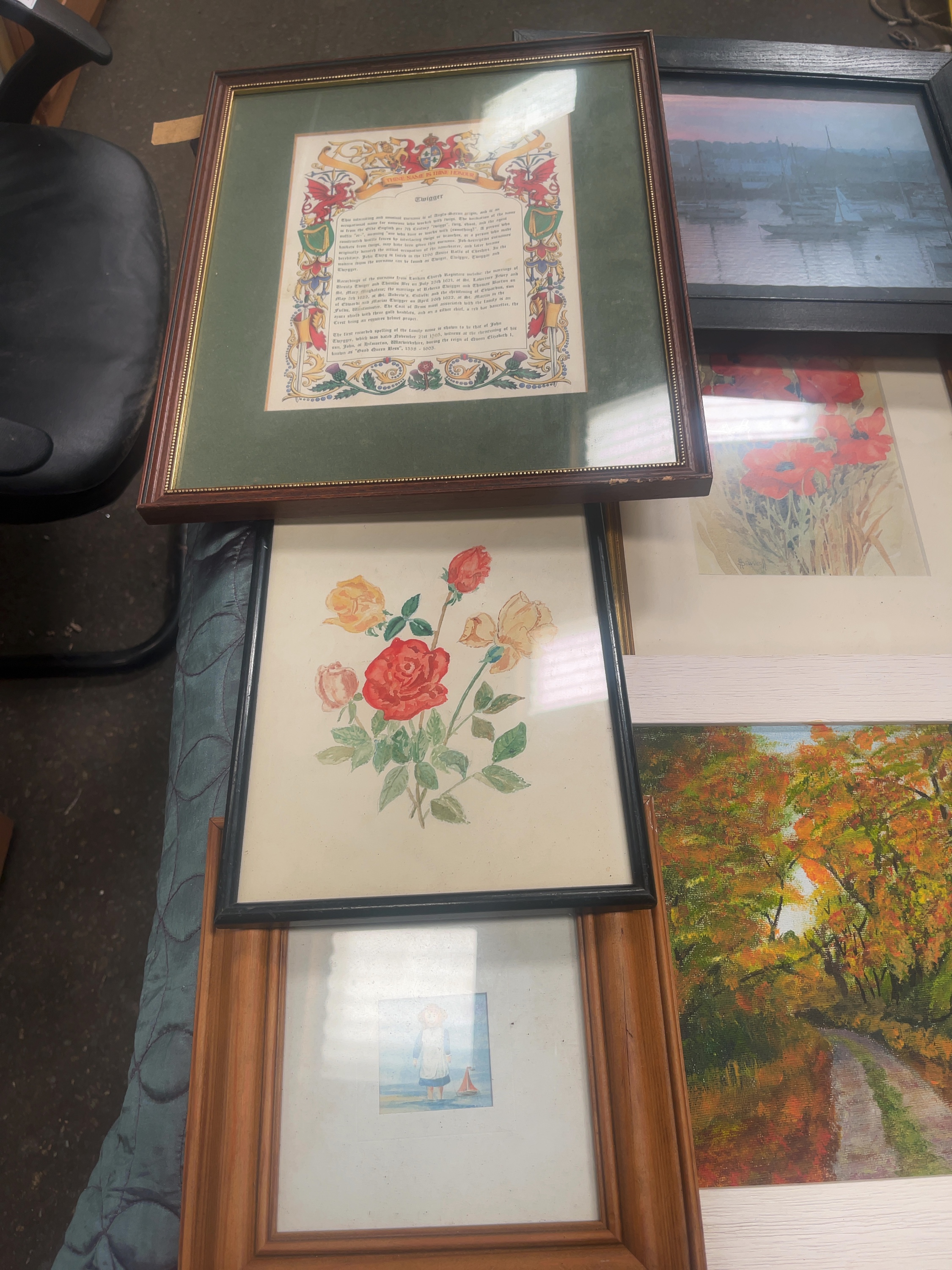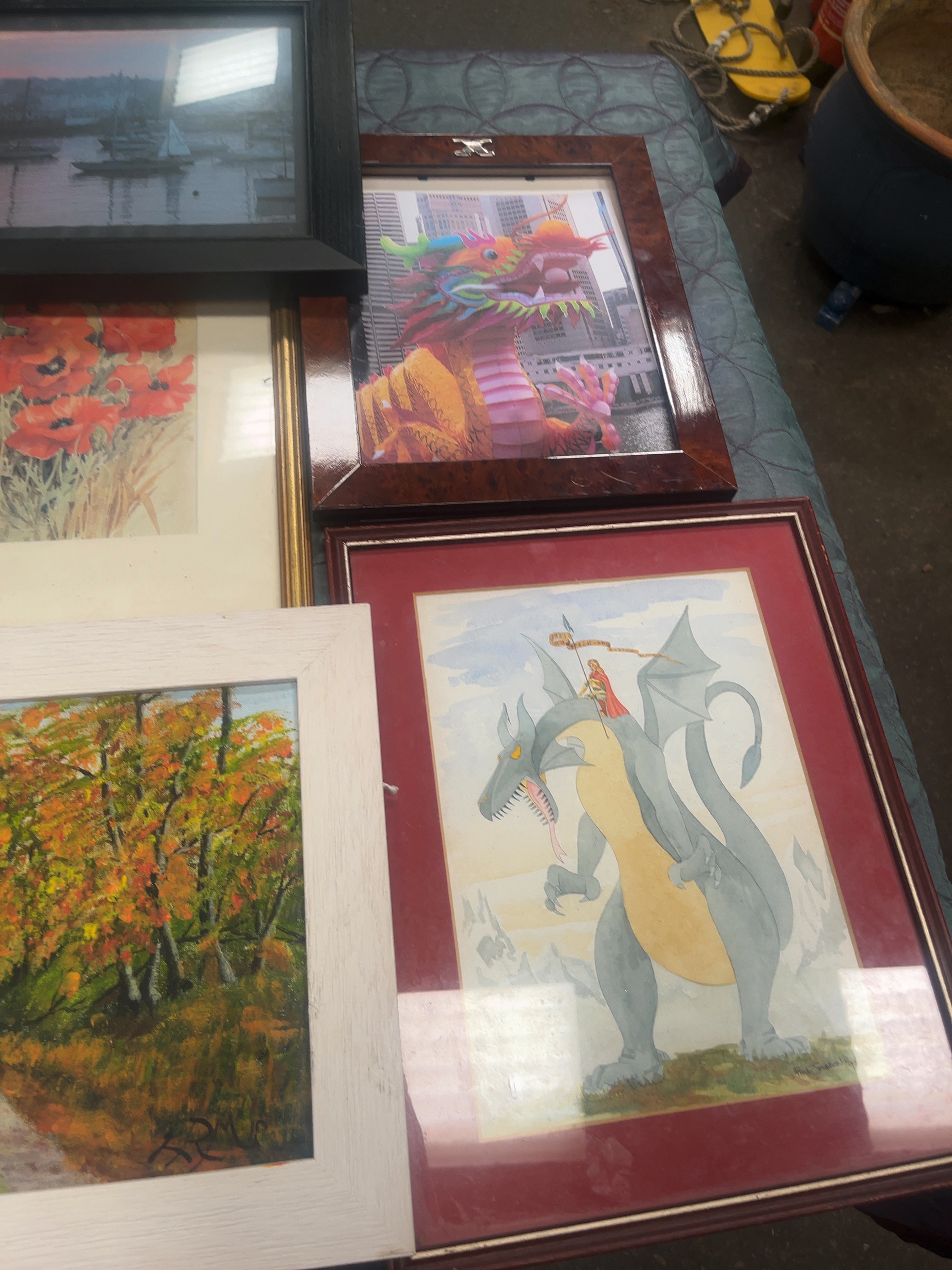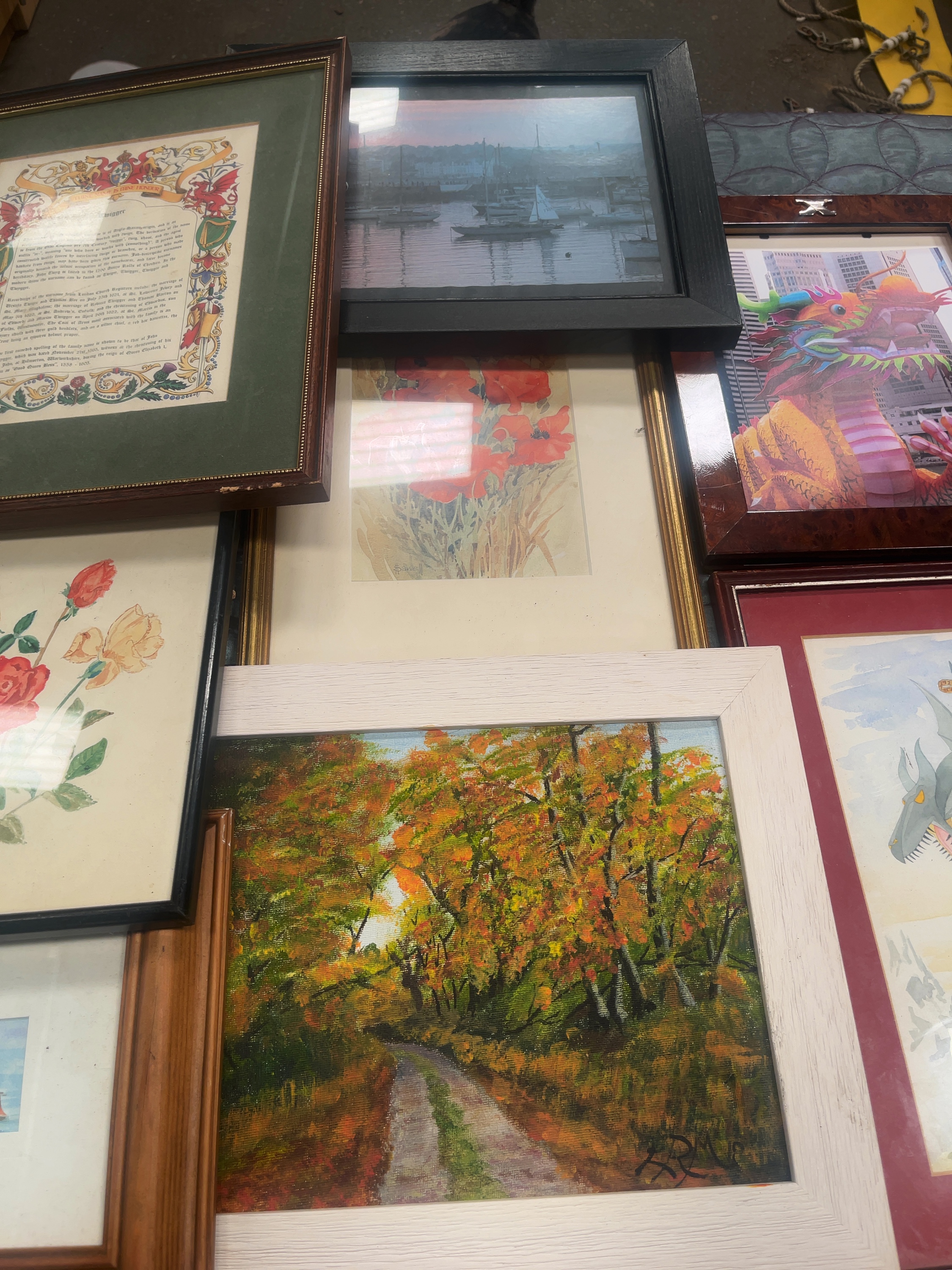 A collection of assorted framed artworks comprising various mediums and subjects. The group includes an oil or acrylic painting on board or canvas depicting an autumnal woodland path, signed with the monogram RM to the lower right. Also included is a heraldic print detailing the history of the Twigger family name with a decorative coat of arms and border. The botanical subjects feature a watercolour study of poppies, a print of roses, and a large-format photographic print of a succulent. The collection further contains fantasy-themed illustrations including a watercolour of a knight mounted upon a dragon and a print of a colourful dragon against a city backdrop. Additional pieces include a twilight harbour scene and a small figurative study of a child on a beach with a toy boat. The works are presented in a variety of wooden, black, and white frames, many featuring decorative card mounts.