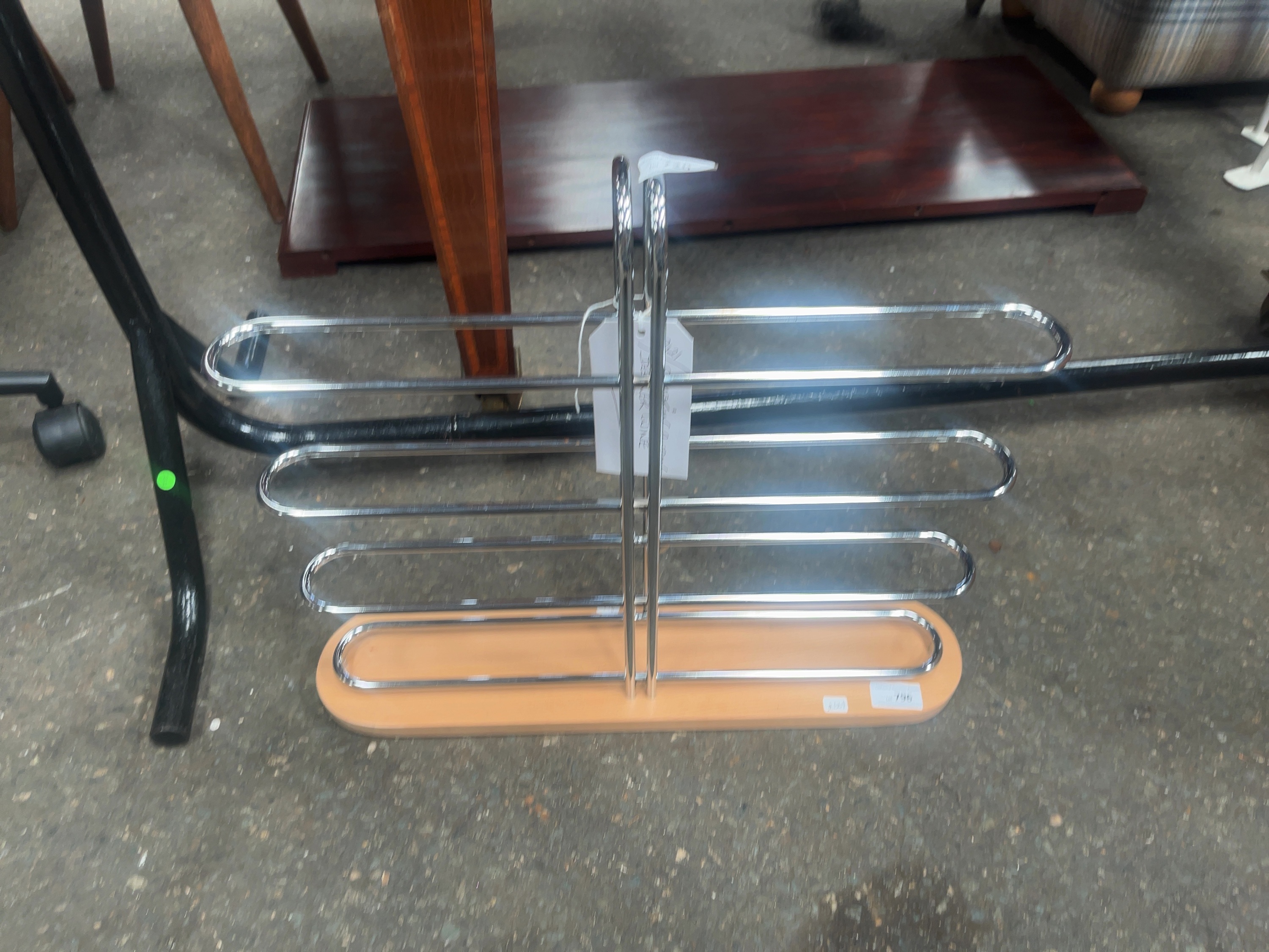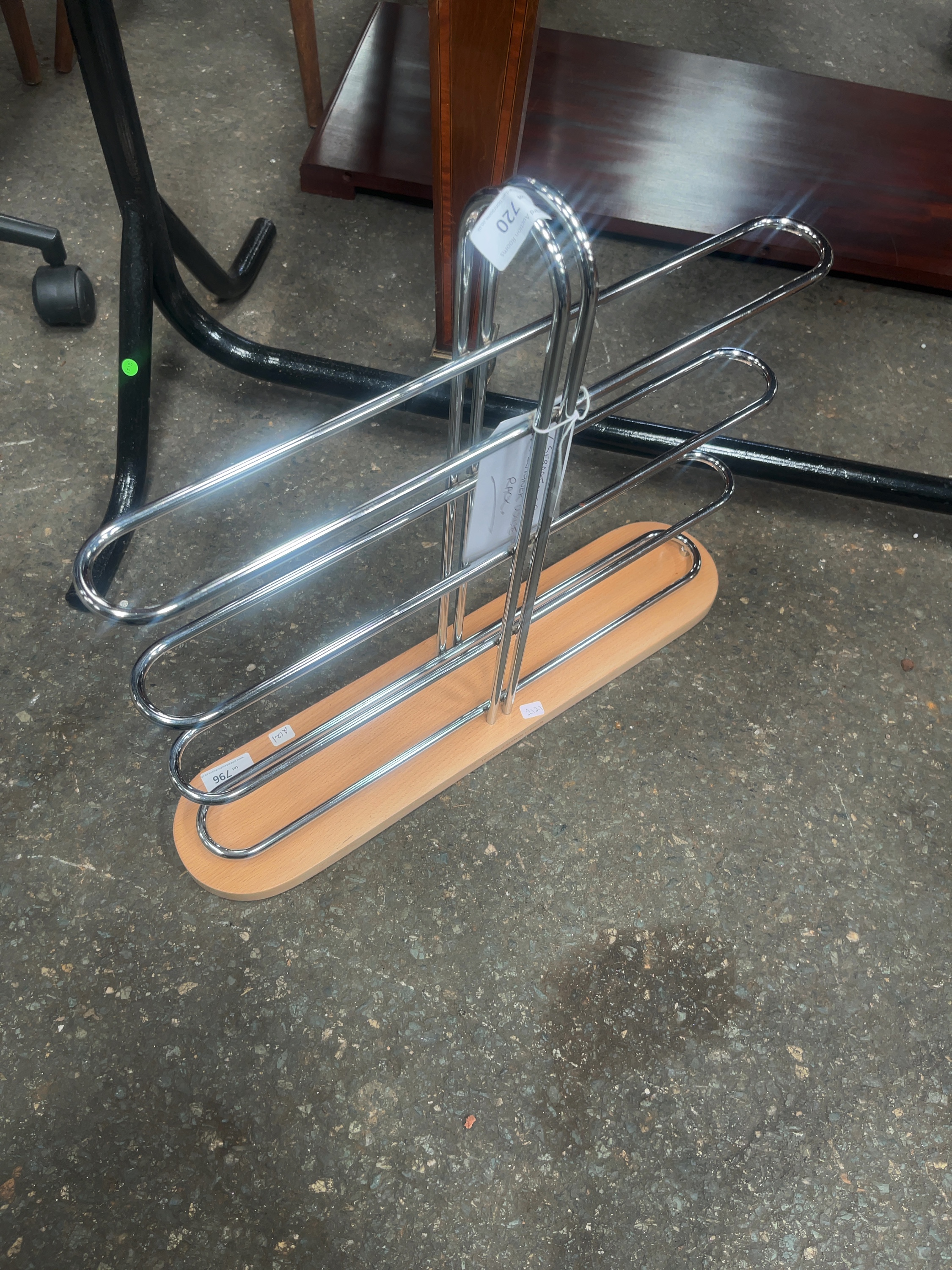 The rack is in good condition. The chrome-plated finish is bright and reflective, showing no significant signs of oxidation or pitting. The wooden base exhibits minor surface wear and light scuffing consistent with handling and age.