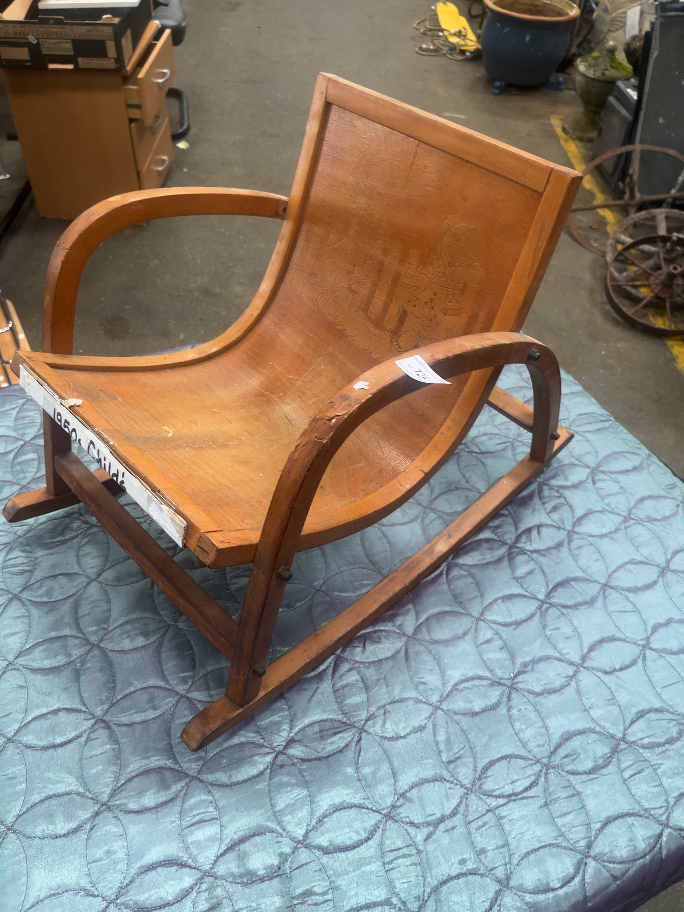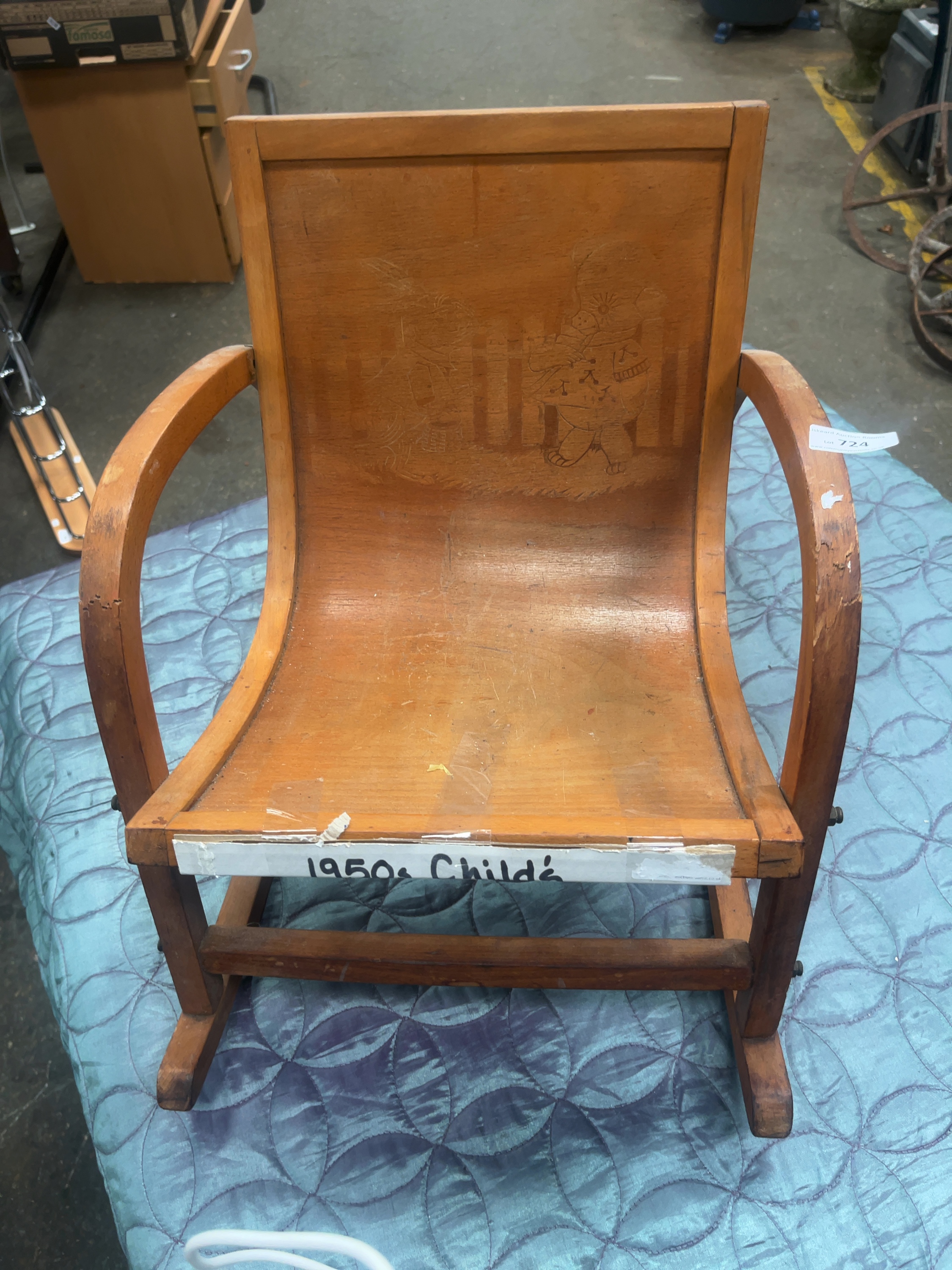A mid-century modern child’s rocking armchair, circa 1950s, designed in the Bauhaus style. The chair is constructed with a single-piece moulded plywood seat and backrest mounted to a bentwood frame, likely composed of beech or birch. The backrest is decorated with an incised nursery illustration depicting a bear in a hat and coat and a rabbit figure standing beside a picket fence. The construction features curved bentwood arms and a frame secured with exposed metal bolt and screw joinery. This form is frequently attributed to German manufacture from the mid-20th century. A modern paper label is adhered to the front rail and an auction tag is attached to the right arm.