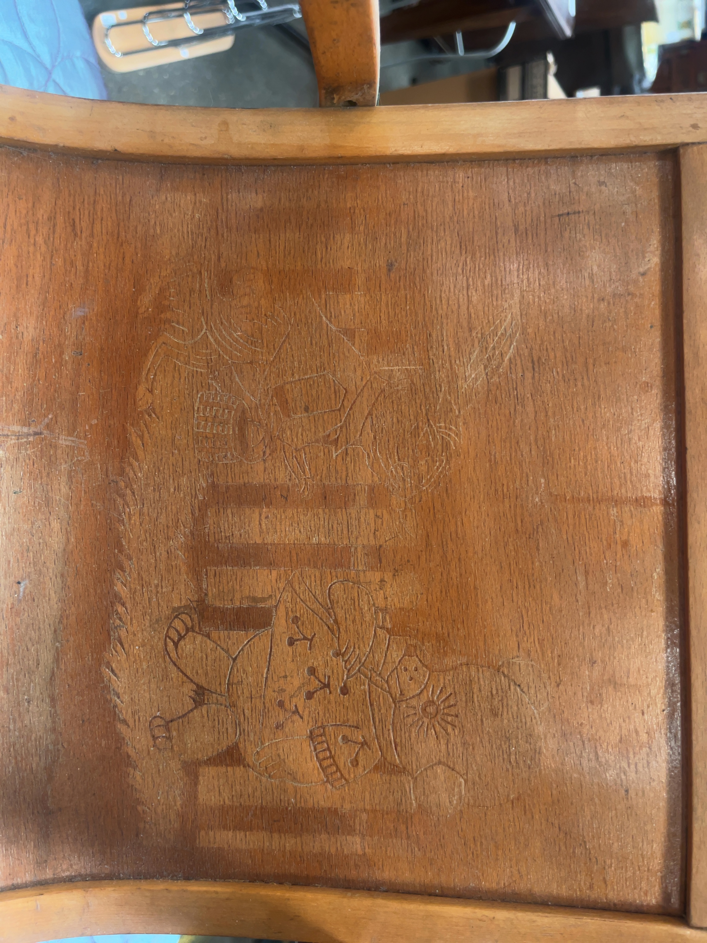 The chair is in well-used condition, showing significant wear to the finish throughout. There are visible scuffs and minor losses to the wood along the tops of the arms. The seat and backrest exhibit surface scratching and wear to the decorative illustration. A modern paper label and adhesive tape residue are present on the front seat rail. The structure remains sound with all joinery intact.
