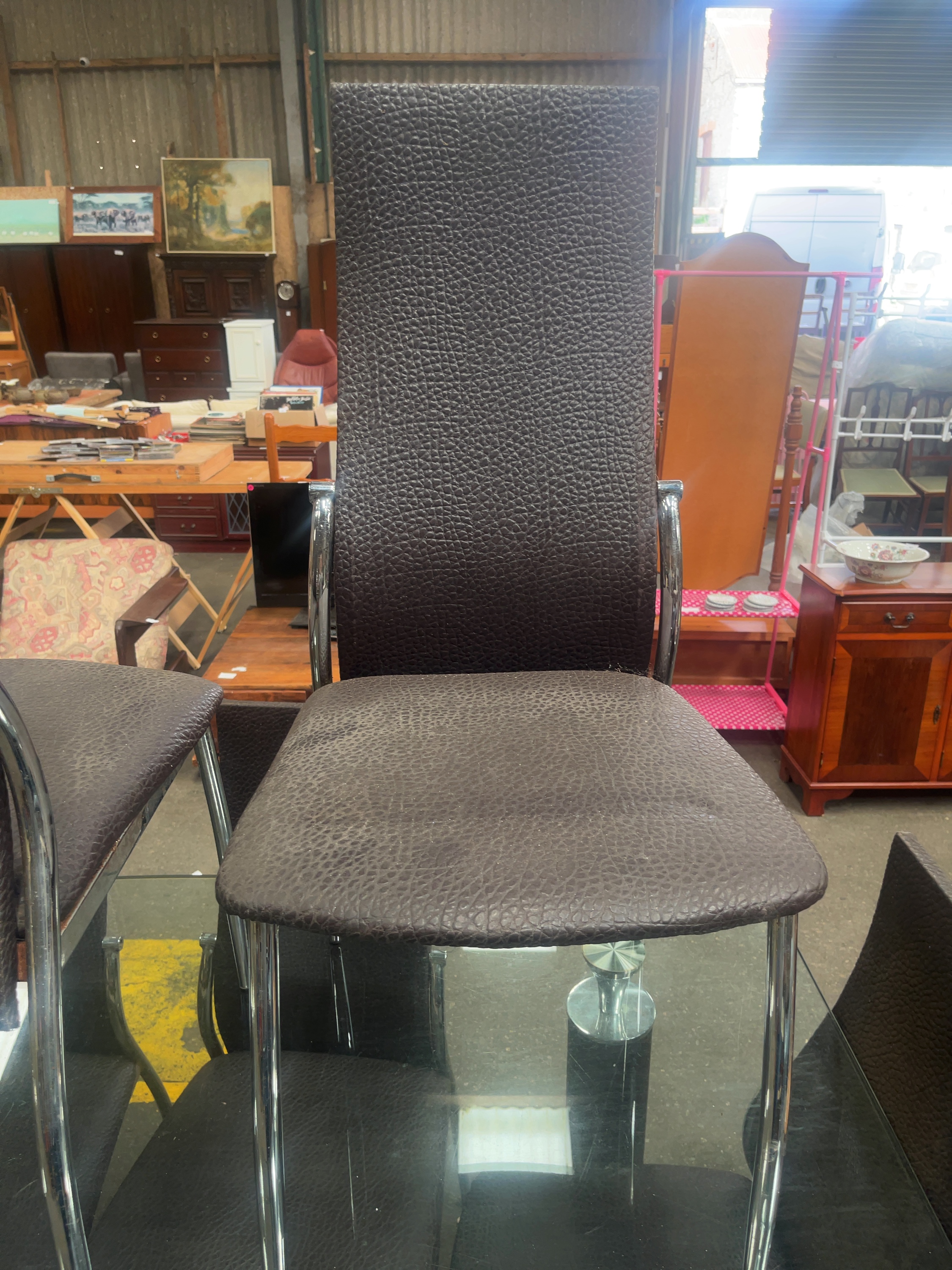 The set is in fair used condition. There is visible surface dust and light marking to the glass top and upholstery consistent with domestic use; professional cleaning is recommended. The chrome-plated elements are generally bright, with minor surface oxidation and pitting present upon close inspection.