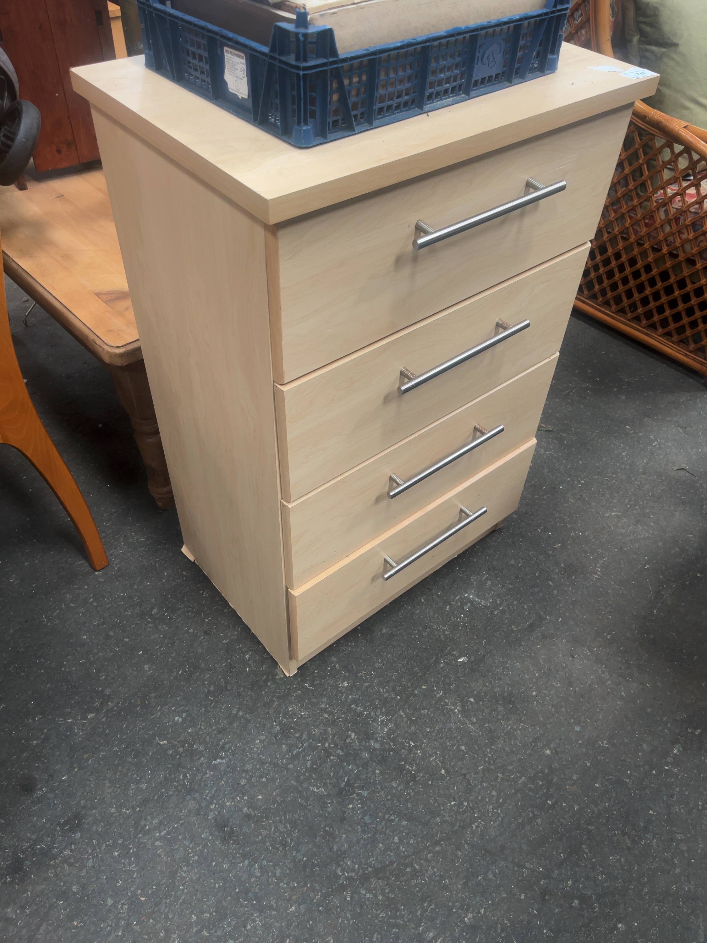 A modern chest of four drawers of contemporary design. The piece is constructed from composite wood with a light wood-effect laminate finish, resembling maple or light oak in appearance. The chest features a simple rectangular form with four full-width drawers, each fitted with a modern, horizontal brushed-metal tubular bar handle. The unit stands on a simple plinth base. Internal drawer construction is not visible, though the external design is consistent with modern mass-produced furniture using mechanical fasteners. No maker’s marks, stamps, or labels indicating a manufacturer are visible on the exterior of the item.