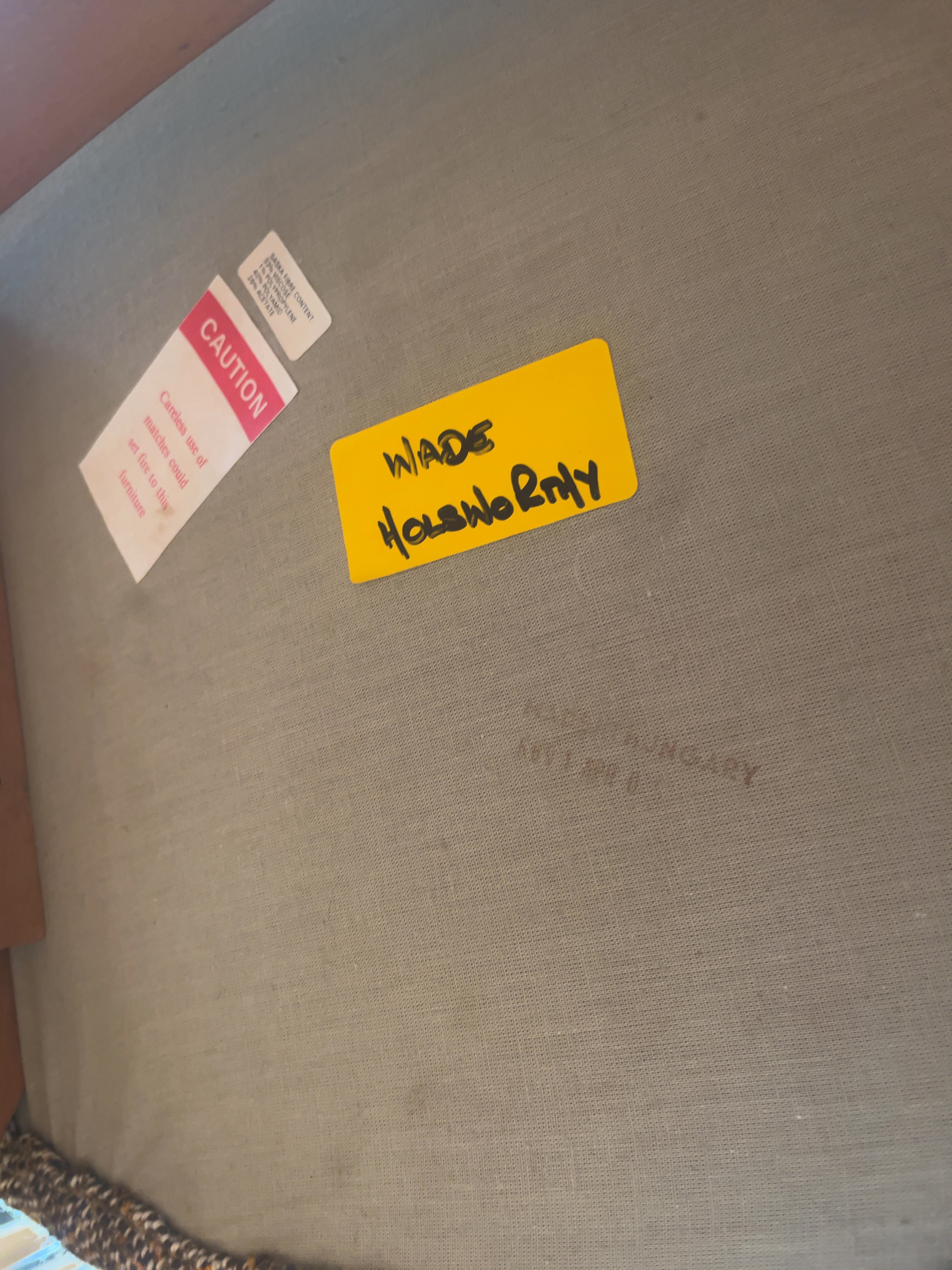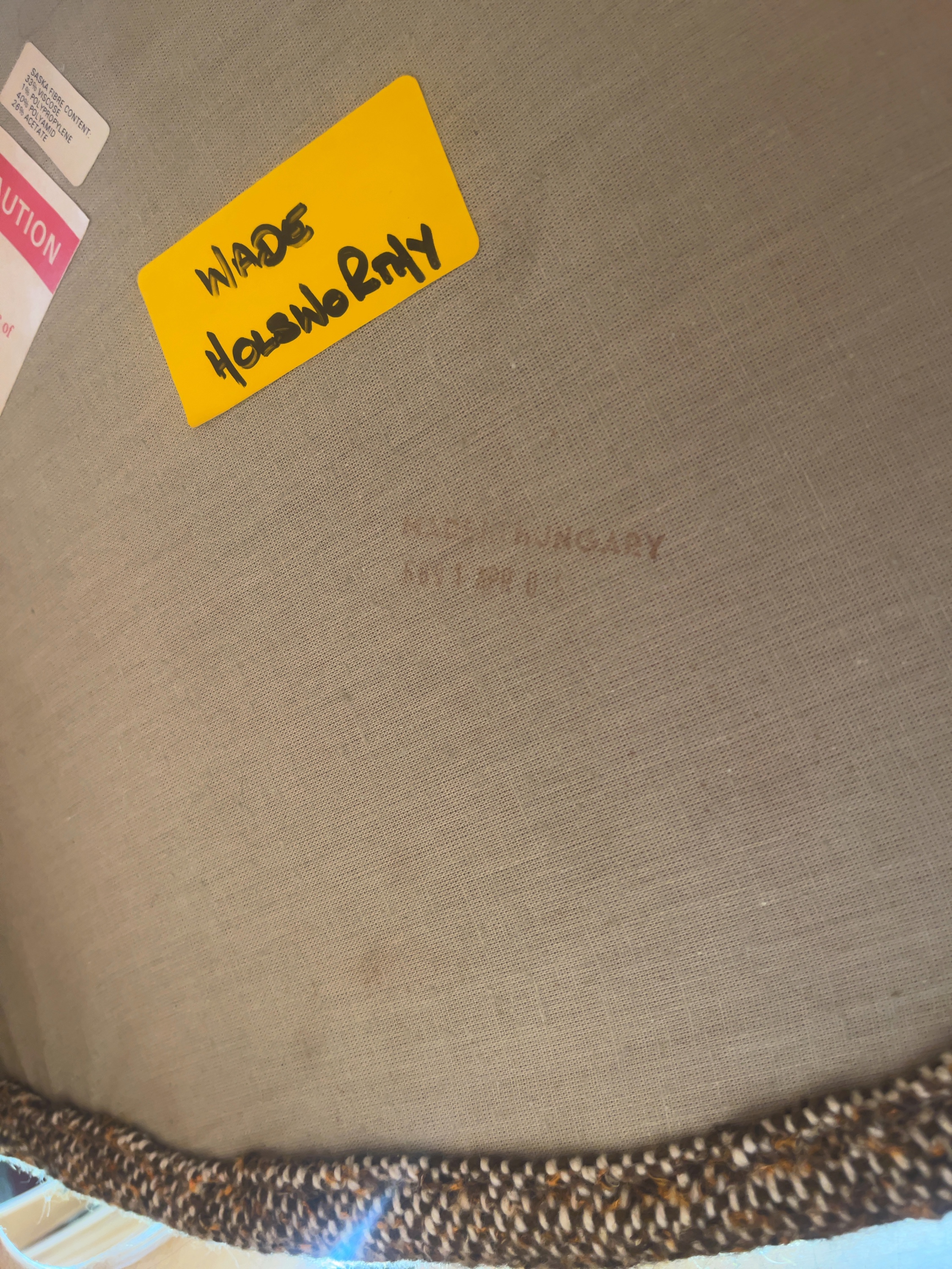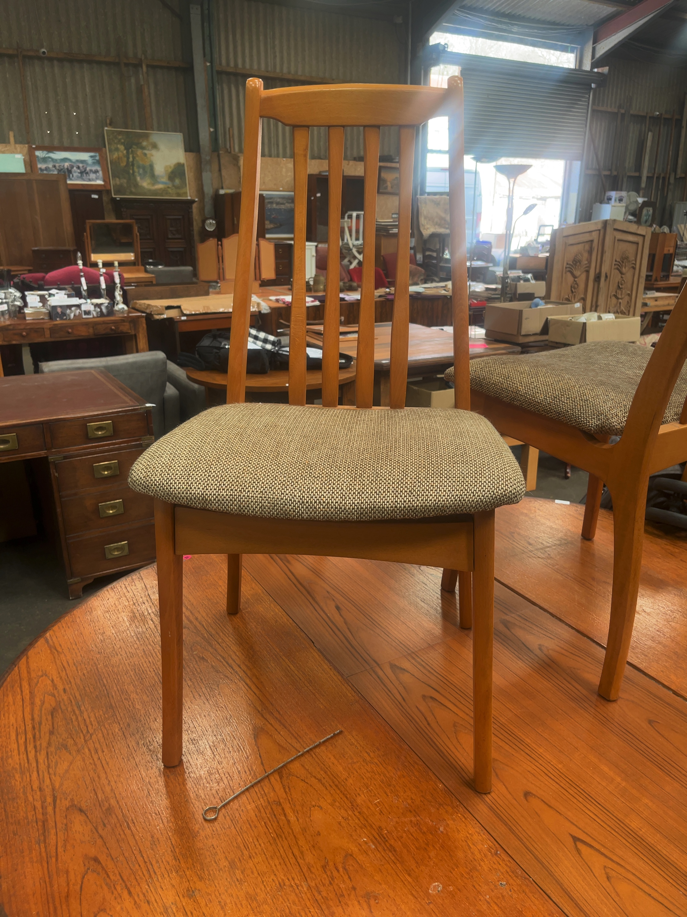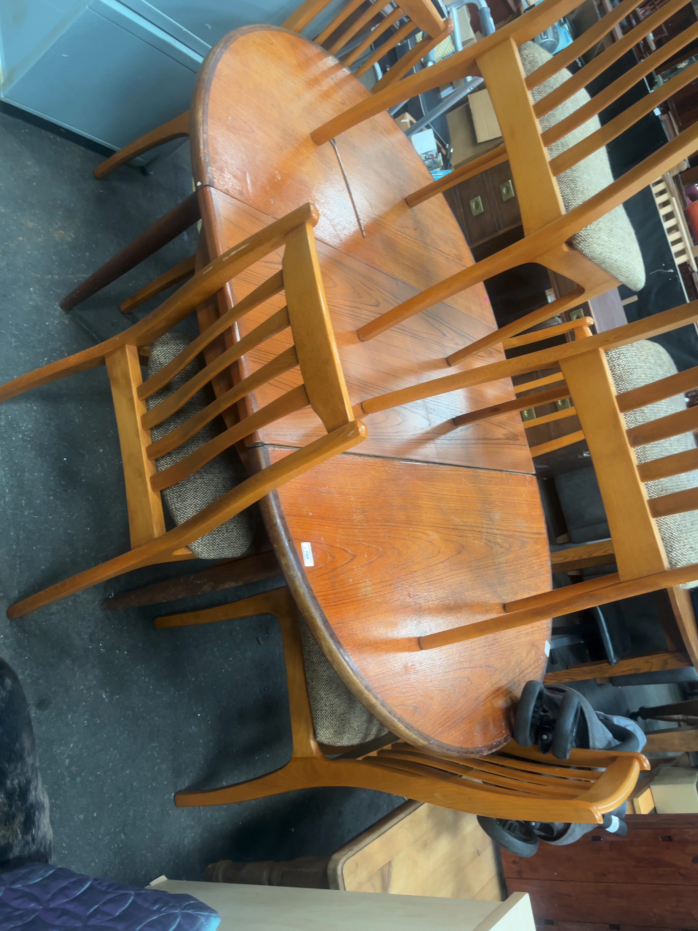 A dining suite consisting of an oval extending dining table and a matching set of high-back chairs. The table is constructed with a teak-veneered top and features a central stowaway butterfly extension leaf. The structure is supported by four tapered circular-section legs. The chairs feature solid wood frames stained to a teak finish, with backs composed of four vertical laths. The padded seats are upholstered in a multi-tone neutral fabric. The underside of the chairs is stamped in brown ink with MADE IN HUNGARY and additional faded numerical characters. A yellow adhesive label is present with the handwritten text WADE HOLSWORTHY. Modern fire safety labels are attached to the upholstery.
