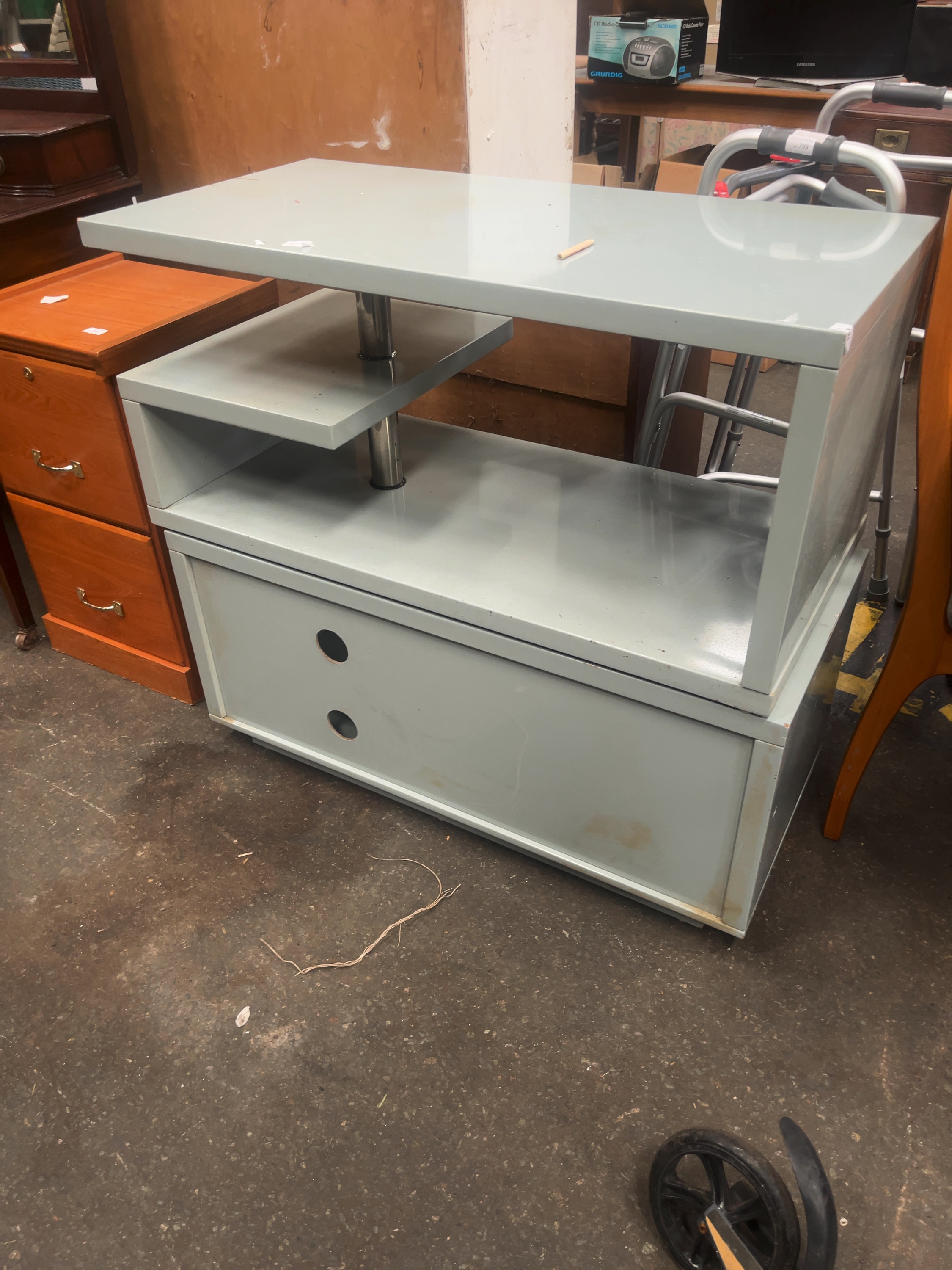 A contemporary multi-tier media console finished in a pale grey-blue lacquer. The asymmetric design features a wide rectangular top positioned above an offset intermediate shelf, which is supported by a single cylindrical chrome-effect post. The lower section consists of an open shelf area situated above a base storage compartment. The front panel of the base unit is detailed with two circular cut-outs, designed for cable management or to serve as finger pulls. The piece is constructed from a painted composite material. No maker’s marks or labels are visible.