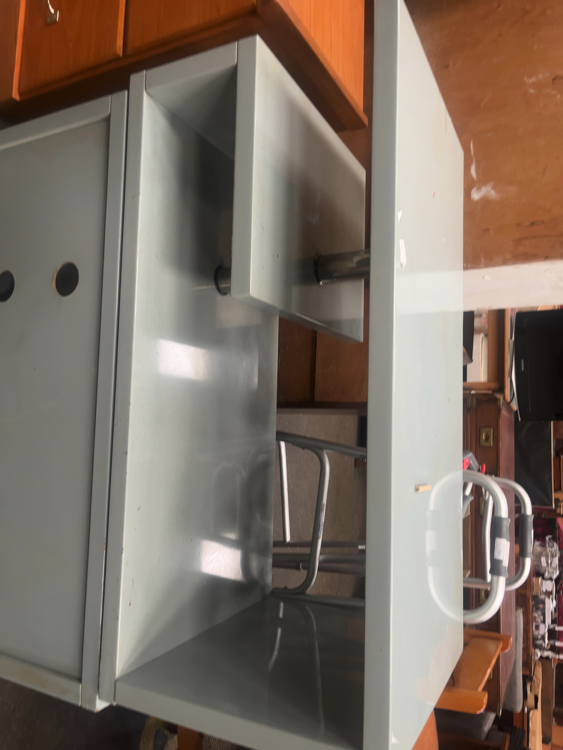 The item shows signs of use consistent with an auction environment. There are visible surface scuffs and marks throughout the finish. Notable areas of discoloration and staining are present on the lower front panel of the base compartment.