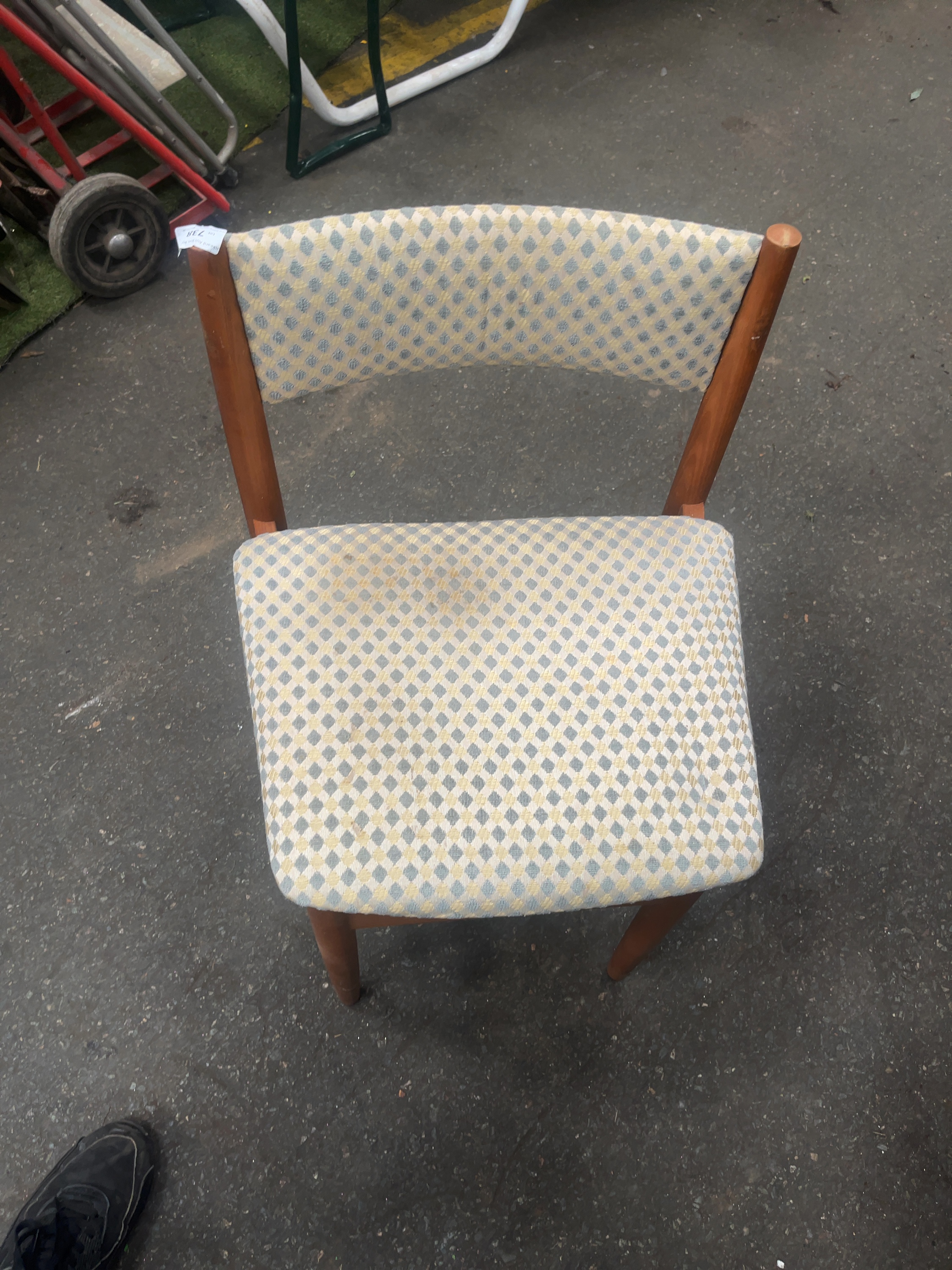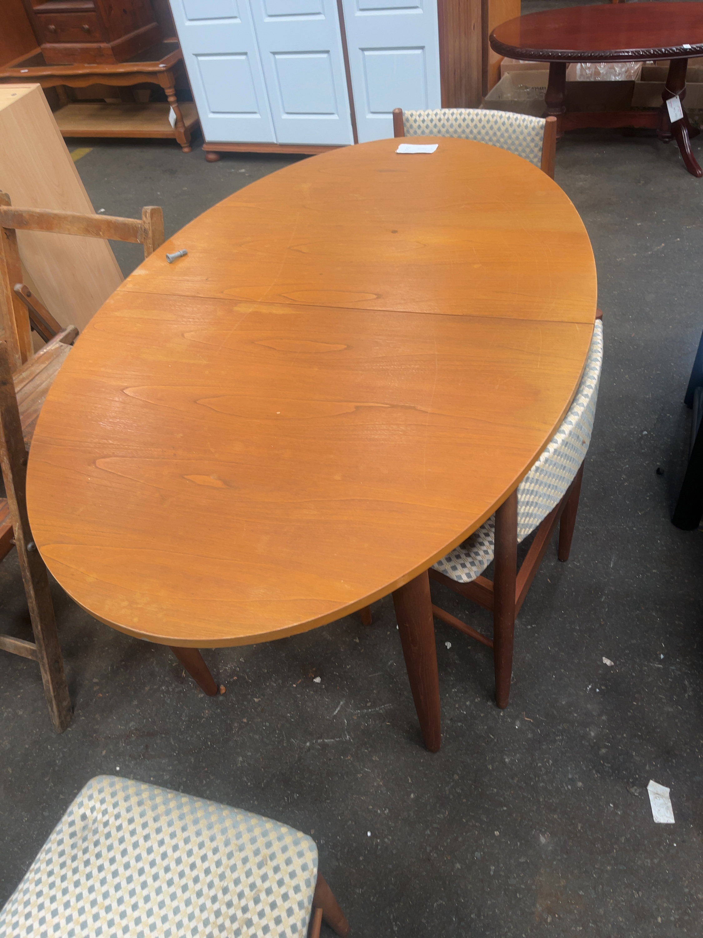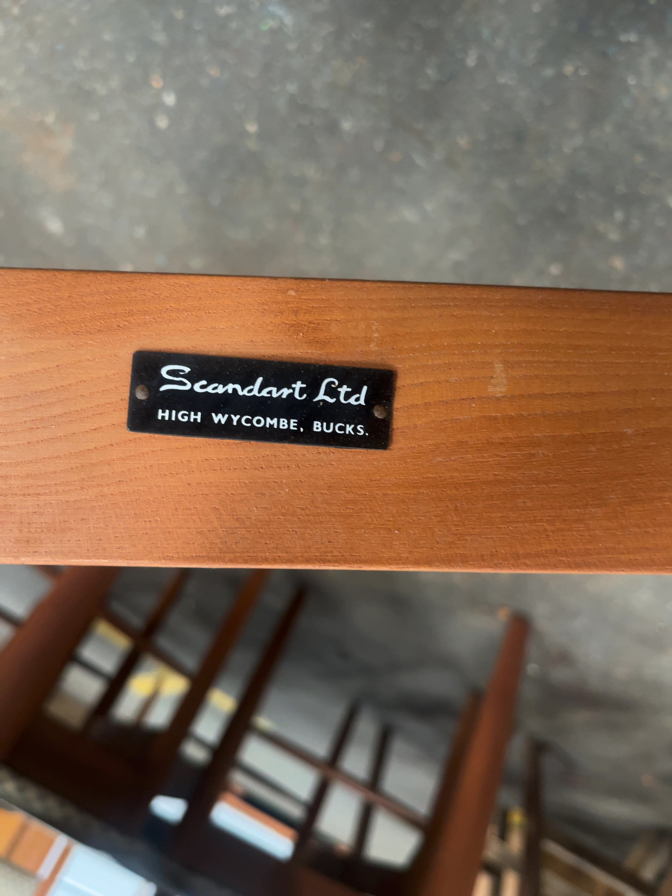 A mid-century modern dining suite manufactured by Scandart Ltd of High Wycombe, Buckinghamshire. The suite comprises an oval extending dining table and a set of matching chairs. The table is constructed with a teak-veneered top featuring a central seam for the insertion of leaves, supported by four solid wood tapered cylindrical legs. The chairs feature curved, upholstered backrests and padded seats, currently finished in a blue and cream geometric diamond pattern fabric. A black rectangular metal manufacturer’s plaque is attached to the frame, reading Scandart Ltd, HIGH WYCOMBE, BUCKS. in script and block lettering. The design reflects the Scandinavian influence prevalent in British furniture manufacturing during the 1960s.