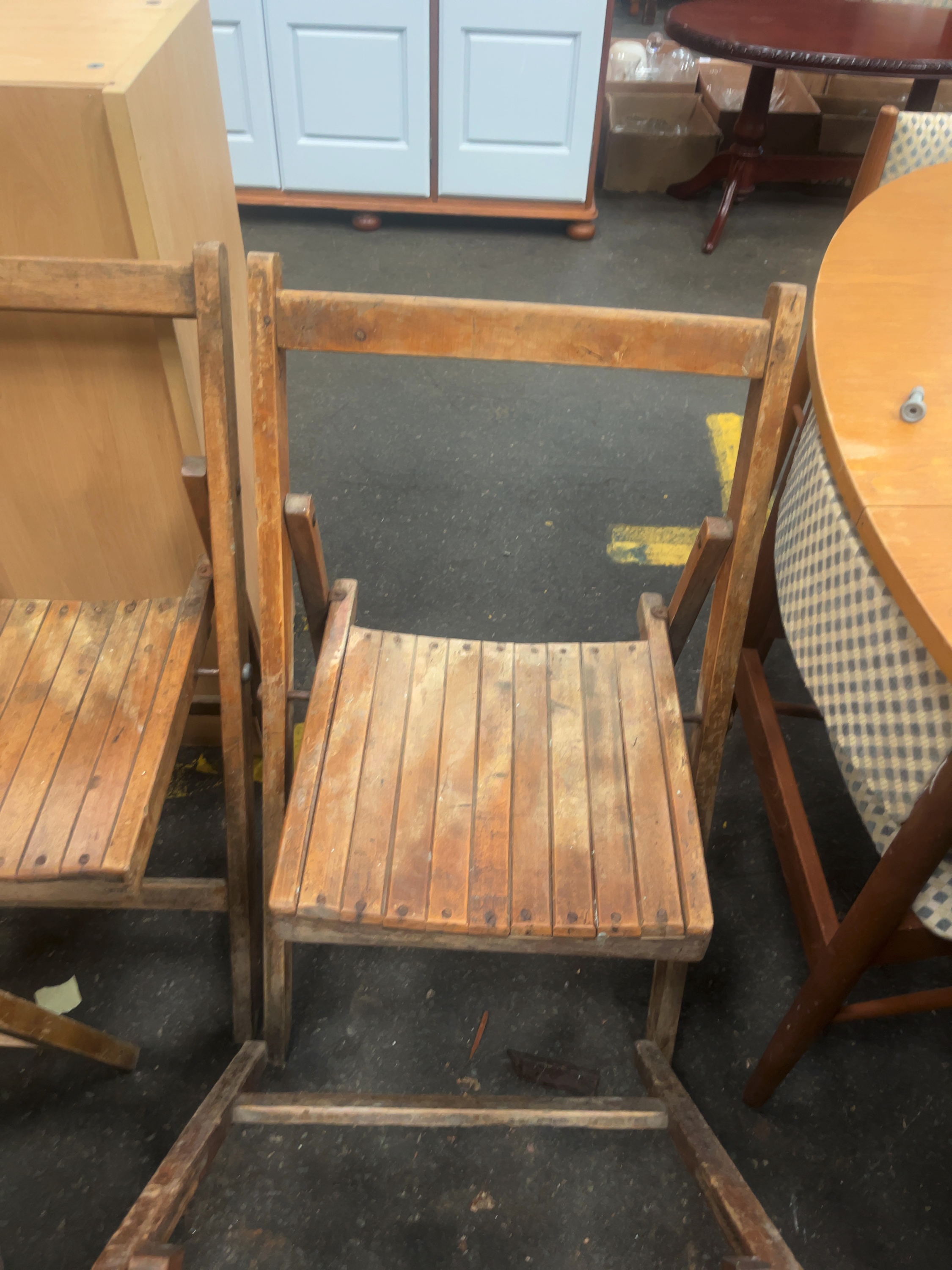 A set of eight vintage folding chairs, constructed from a light-coloured hardwood such as beech or oak. These chairs feature a utilitarian design typical of mid-20th-century British institutional furniture. Each chair is designed with a simple folding frame and metal pivot pins. The seats are composed of vertical wooden slats, secured to the frame with visible screws or bolts. The backrests consist of a single, plain rectangular top rail. The design is consistent with chairs used in community halls, churches, or schools during the mid-century period. A small white paper tag is present on one chair, though the text is no longer legible.