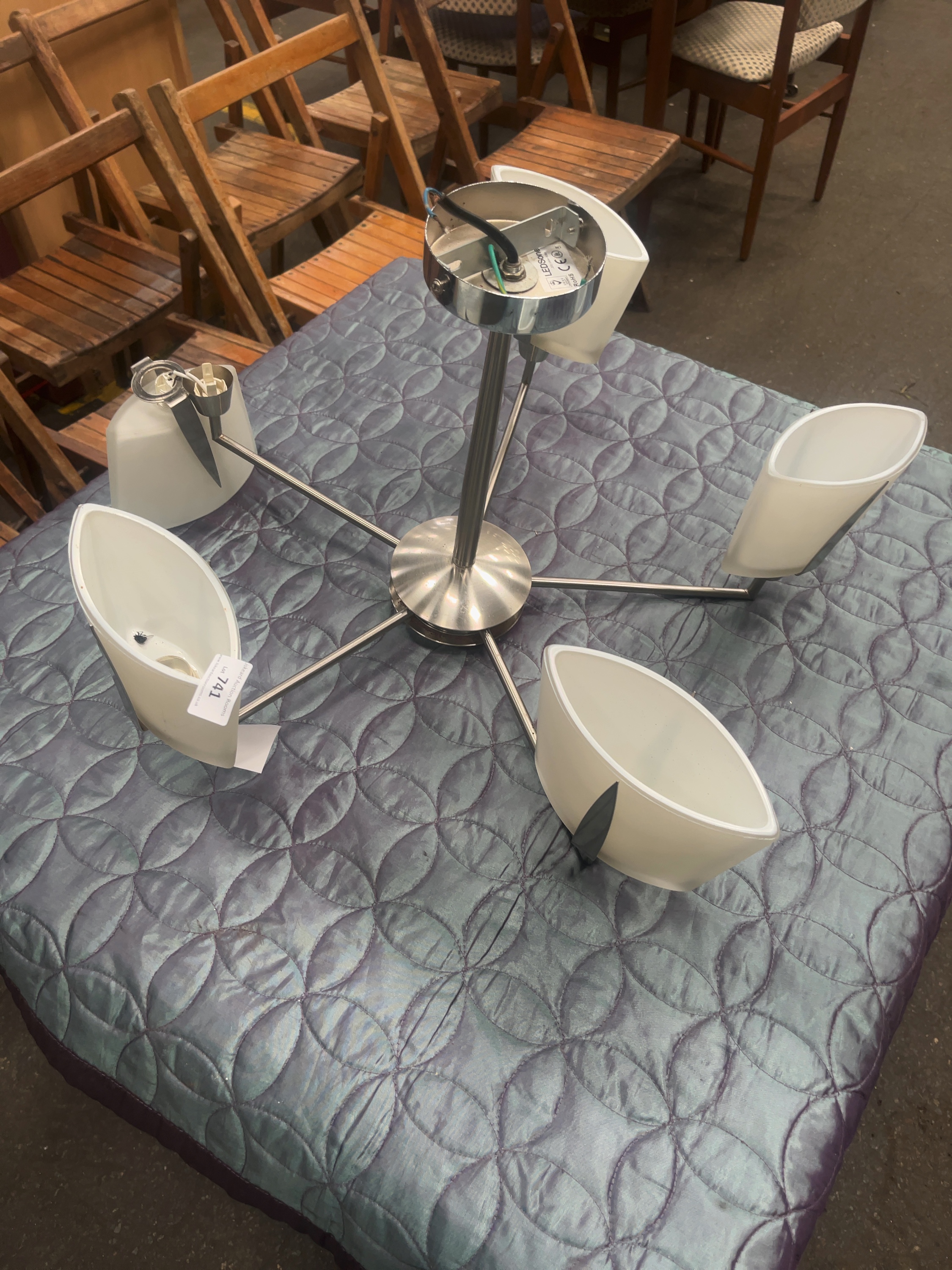 Lot 740: A LEDScone five-light brushed nickel finish chandelier with frosted glass shades