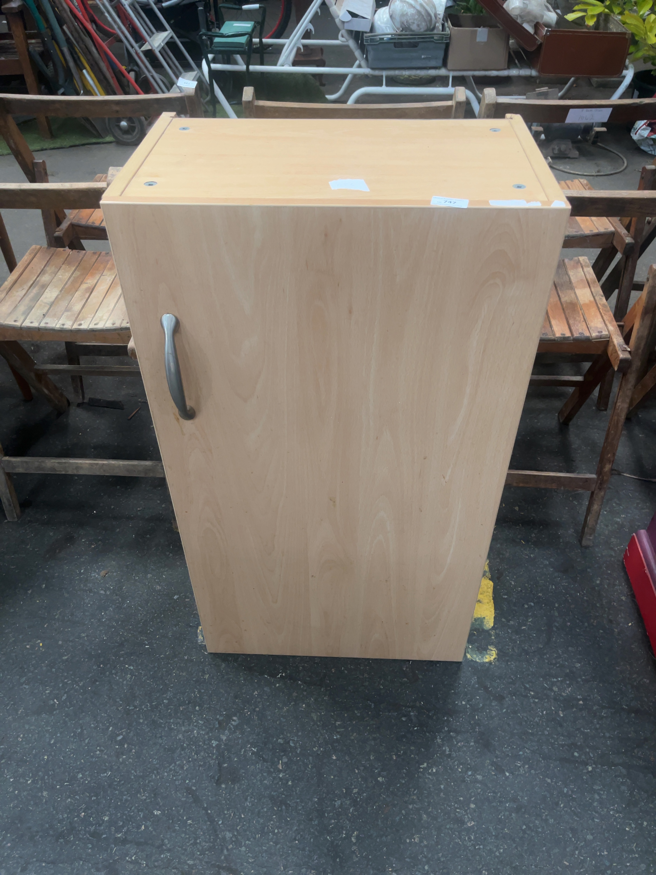 A contemporary single door storage cupboard featuring a light beech wood effect laminate finish over a composite wood core. The unit is designed for office or domestic storage, resembling the Konnexion range of office furniture. The single door is fitted with a curved matte silver tone D handle and opens on concealed Euro style hinges to reveal an interior with two adjustable shelves supported by white plastic pegs. The top surface shows visible cam lock fasteners used in the carcass construction. A small white label marked 747 is present on the top surface.