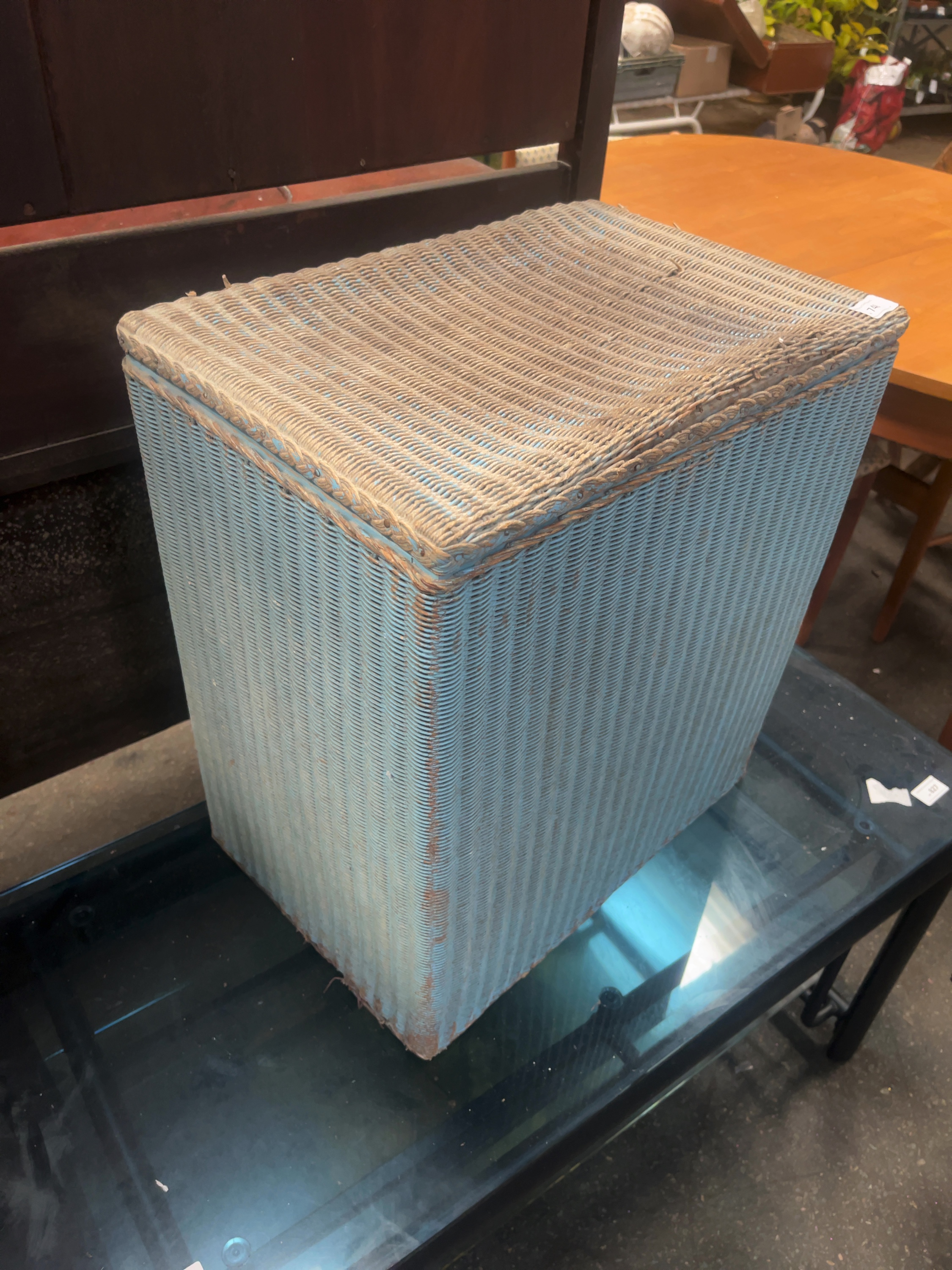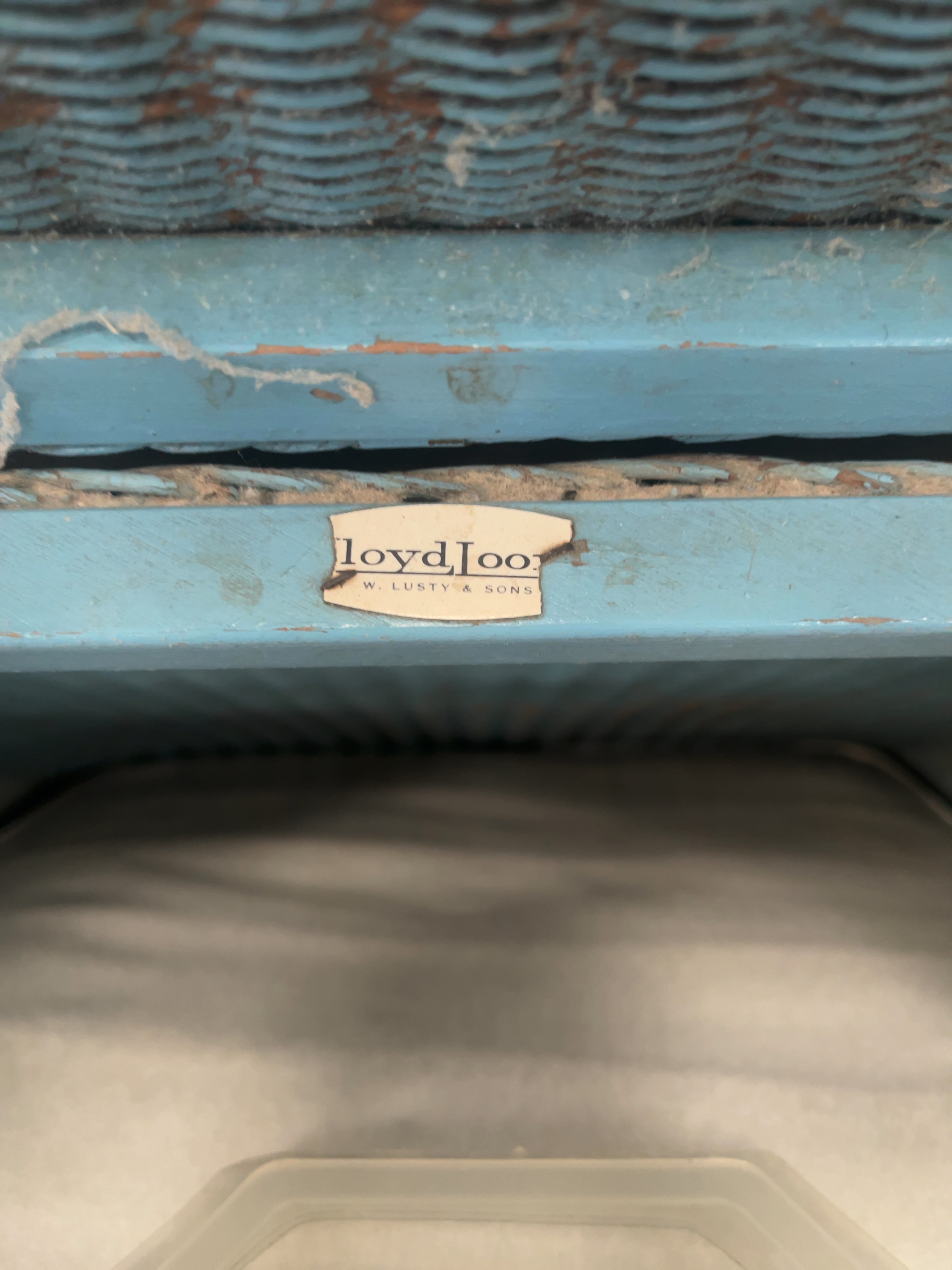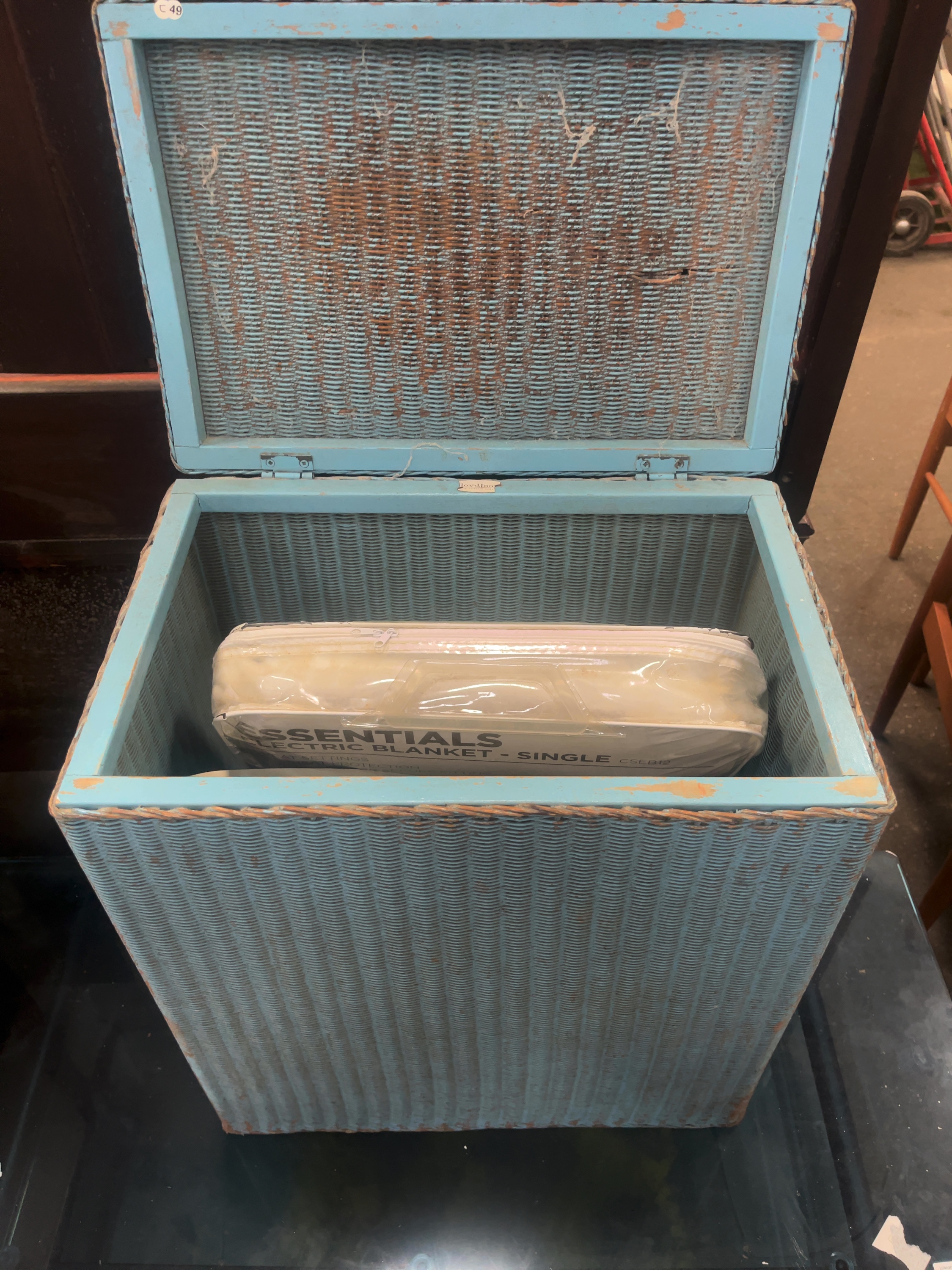 A mid-20th-century lidded laundry hamper manufactured by W. Lusty and Sons using the Lloyd Loom process. The hamper features a rectangular woven body and a hinged lid, finished in a pale blue paint. A partial manufacturer’s paper label is affixed to the interior wooden frame, displaying the characters loydLoo and W. LUSTY and SONS. The interior contains a single electric blanket in its original Essentials brand packaging.