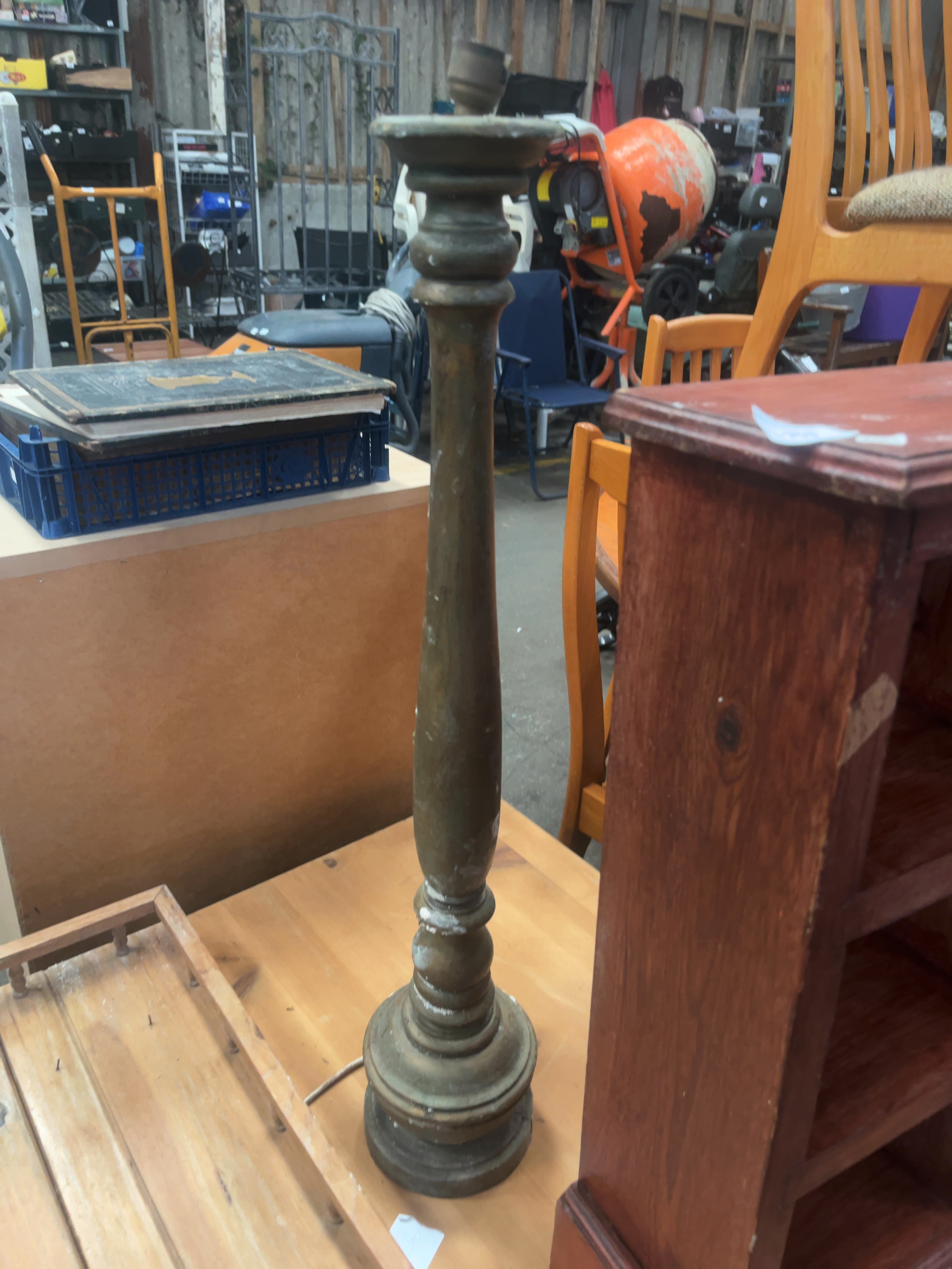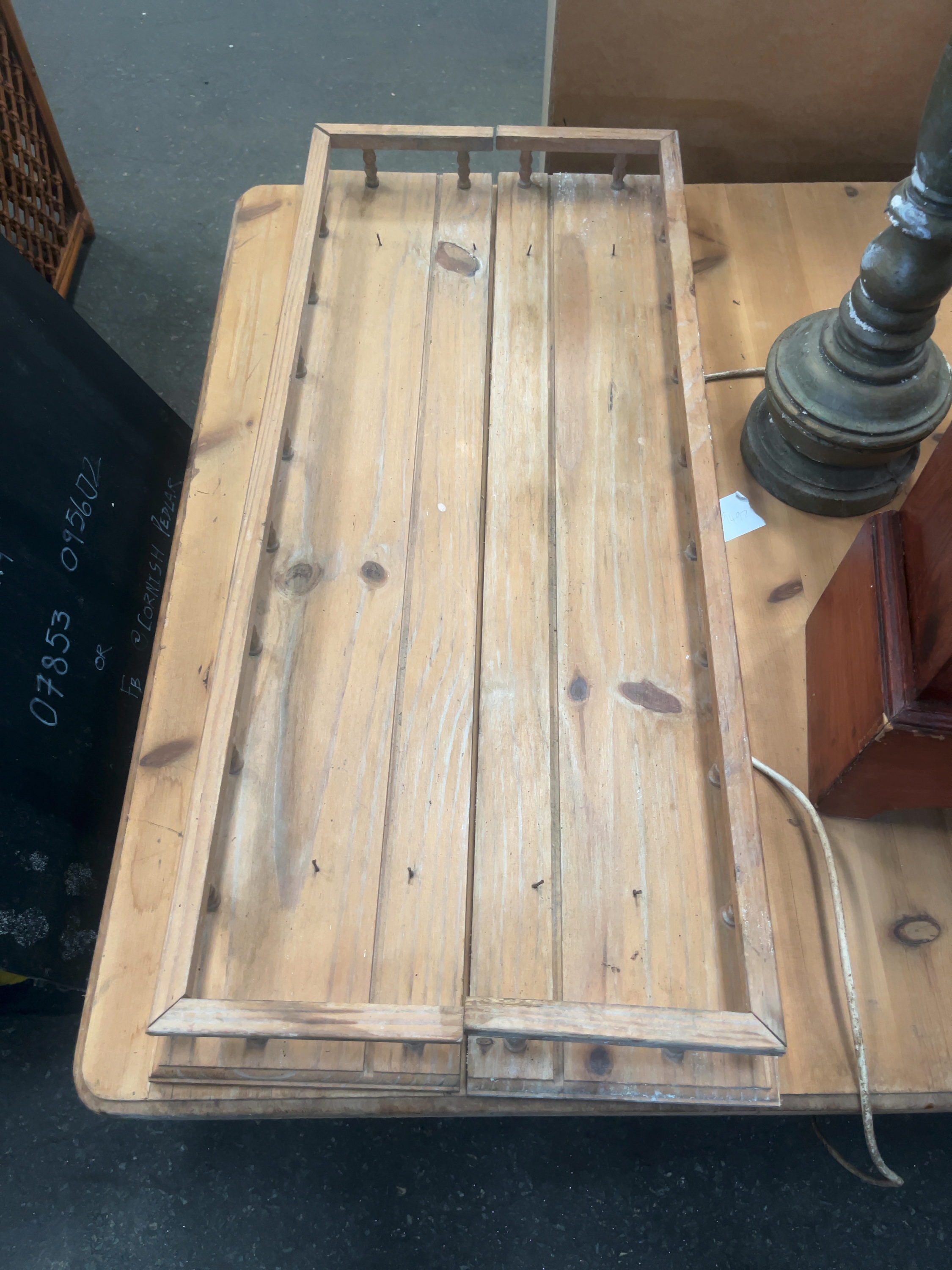 A trio of wooden items of 20th-century or contemporary manufacture. The lot comprises a long, shallow pine rack featuring a turned spindle gallery and a row of small protruding pins to the base. Included is a small three-tier bookcase with a reddish-brown stain and a shaped apron. The final item is a tall, turned wooden table lamp base with a weathered grey-green finish. No maker’s marks are discernable on the objects. Handwritten text on an adjacent surface reads 07853 095602 OR FB @ CORNISH PEDLAR.