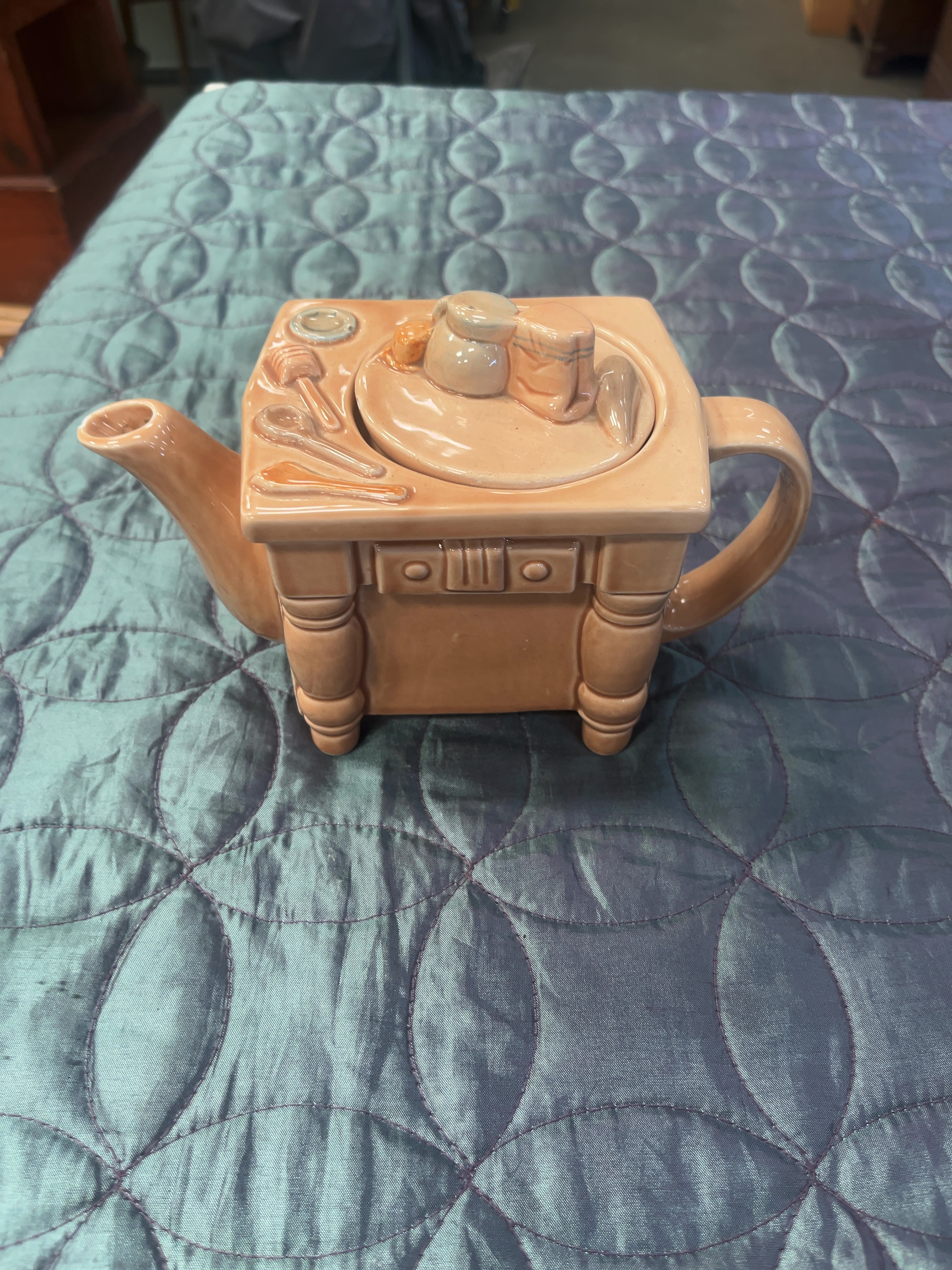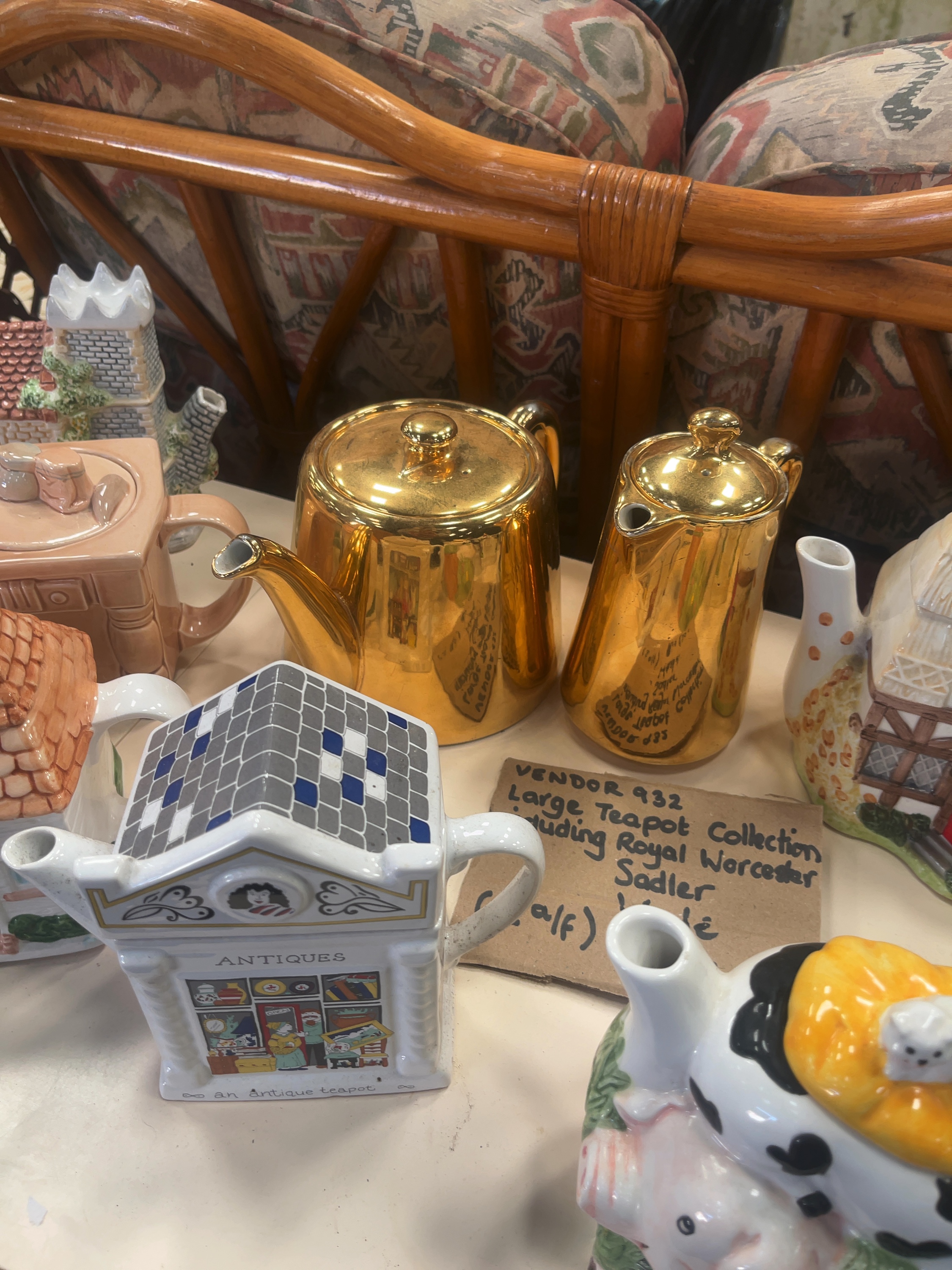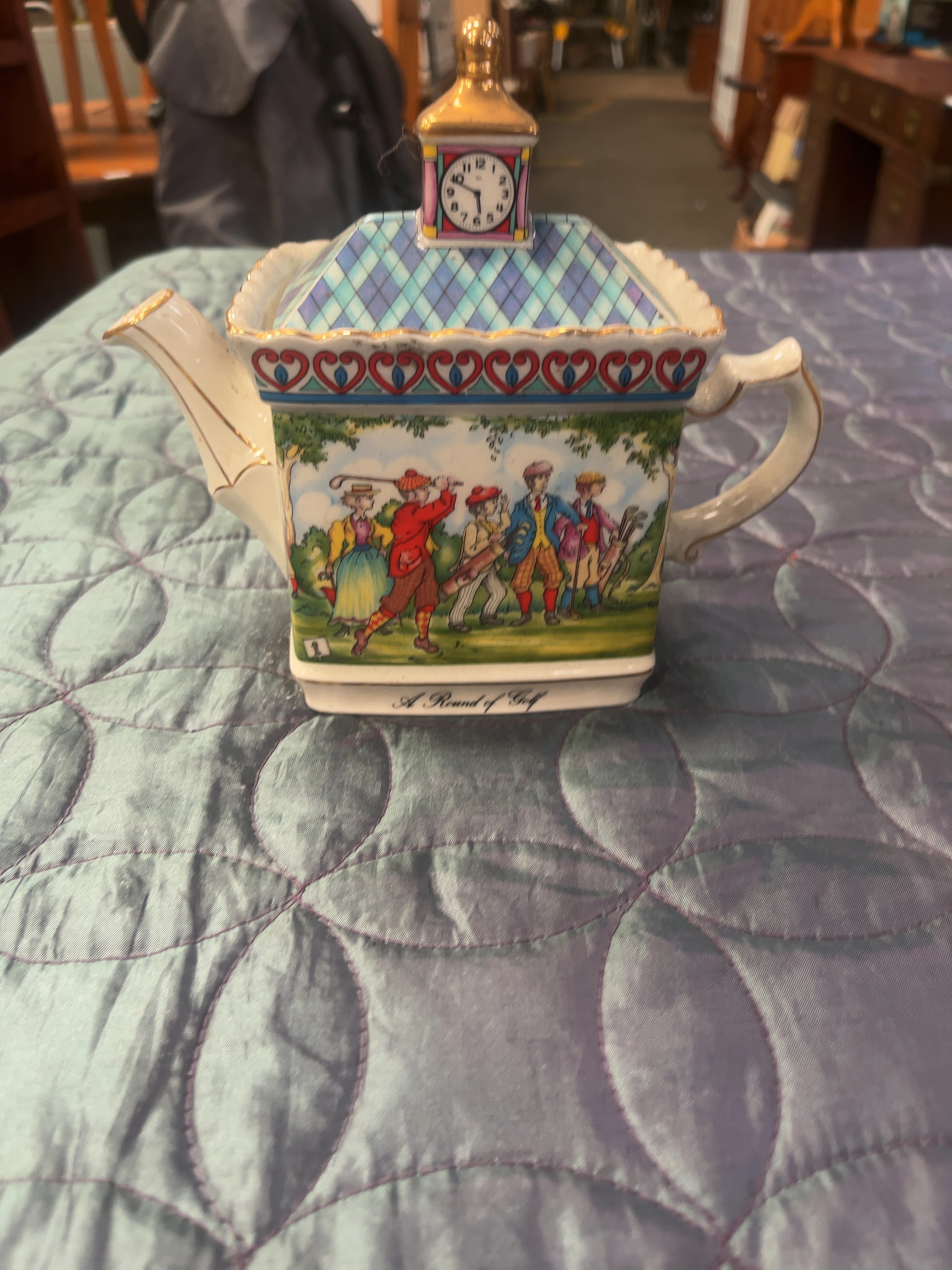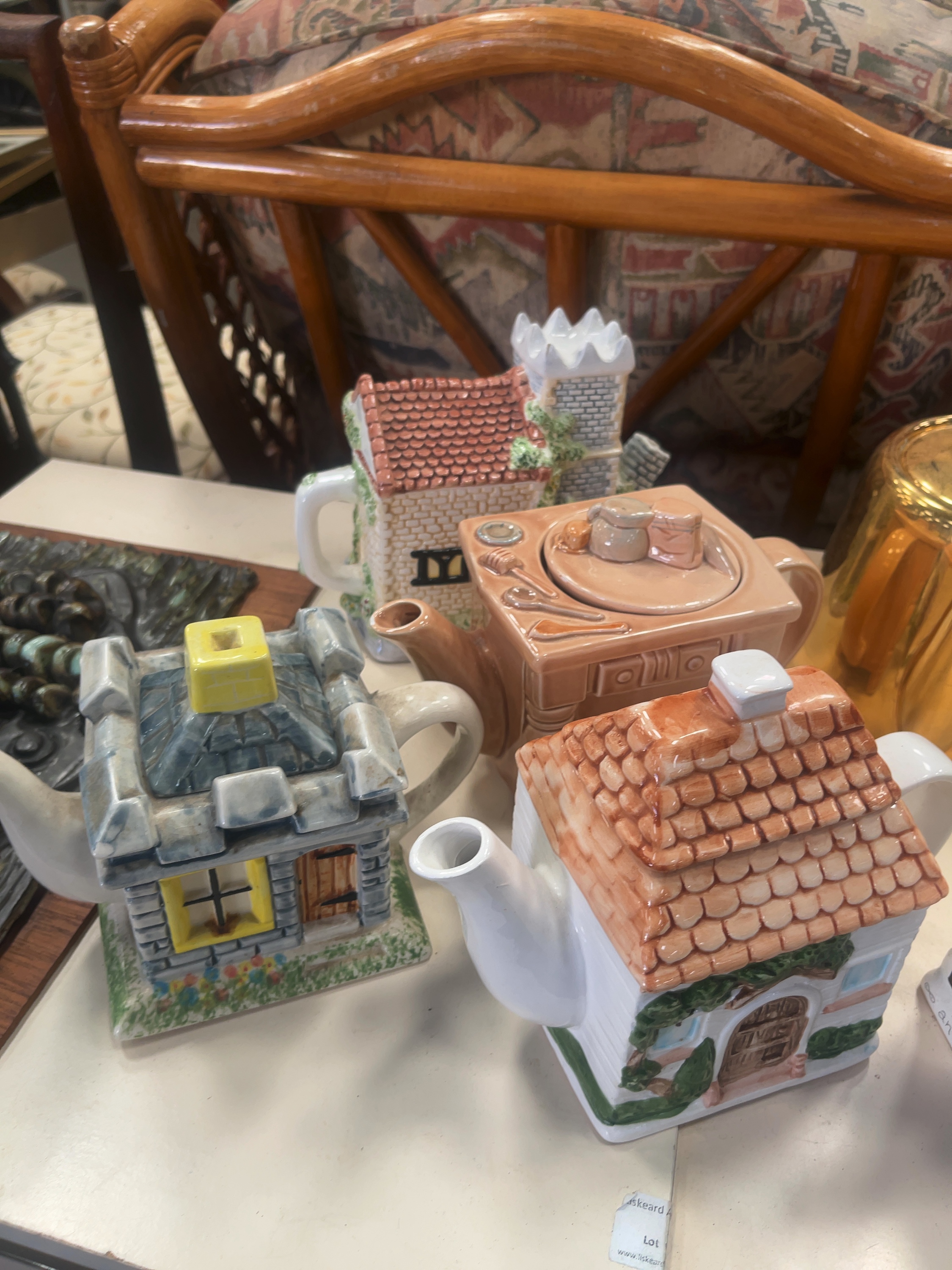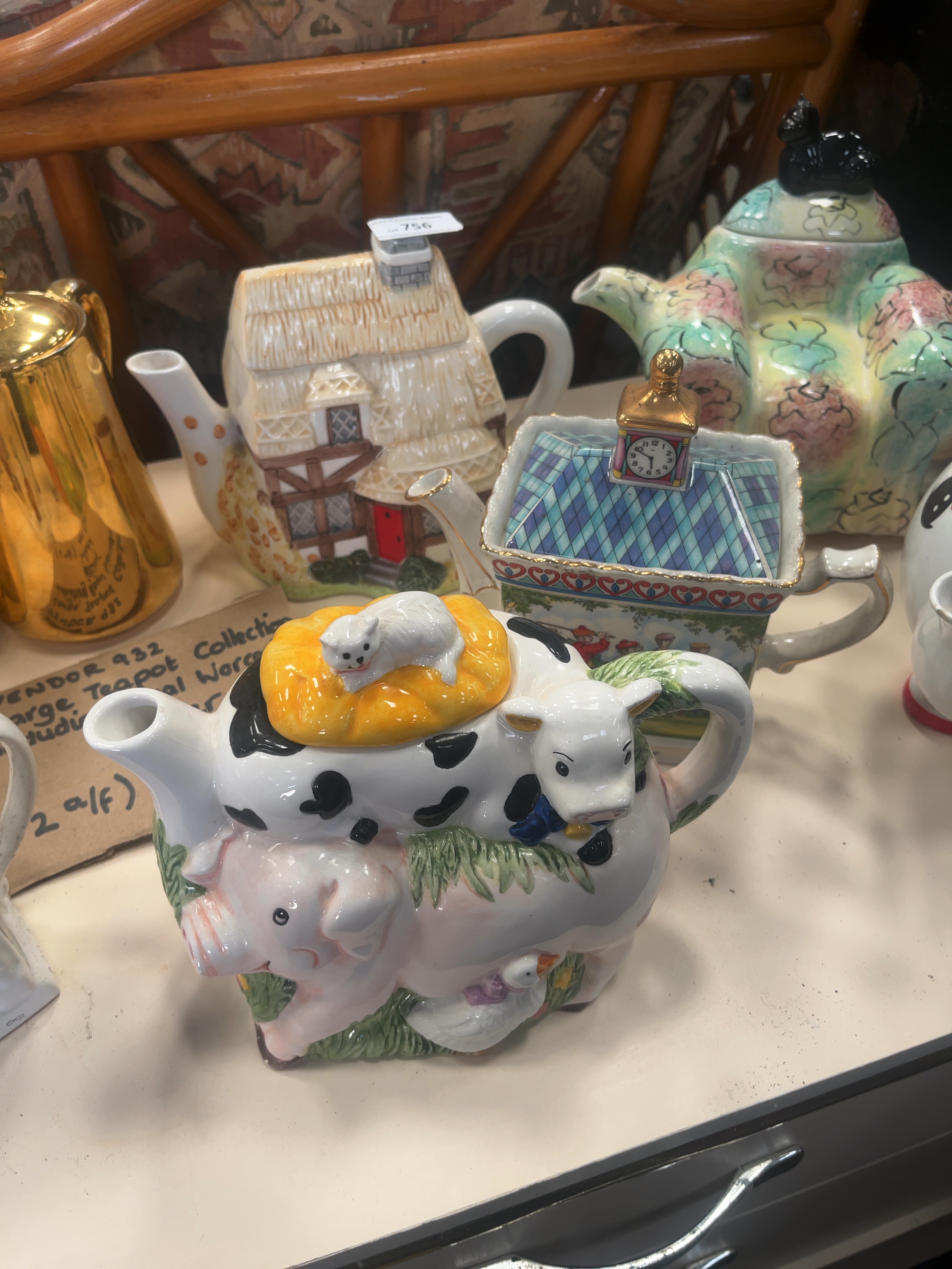 This collection comprises an assortment of novelty and decorative ceramic teapots and related wares, including pieces attributed to Sadler and Royal Worcester. The group features a Sadler A Round of Golf teapot of rectangular form, the lid decorated with a blue and green harlequin pattern and a clock-tower finial with gilded highlights, the body showing a polychrome transfer-printed scene of historical golfers. Also included is an earthenware teapot relief-moulded as a baking table or dresser in a monochrome buff glaze with moulded kitchen accoutrements to the lid including a rolling pin and flour sack. Further items include a sponge-printed floral armchair teapot with a black cat finial, and a farm animal group teapot modelled as a stack featuring a pig, cow, and a cat on a yellow cushion. The architectural selection includes a Tudor-style half-timbered cottage, a shop-front teapot titled Antiques, a medieval-style square tower with crenellated battlements, and two smaller cottages with moulded brickwork. Completing the collection are two pieces finished in a polished metallic gold-effect glaze, comprising a teapot and a taller hot water jug, both bearing circular inscriptions to the body, and a white glazed character teapot with transfer-printed facial features and a red spherical finial. The items are constructed from glazed earthenware and porcelain using a combination of relief-moulding, polychrome hand-painting, and transfer-printing.