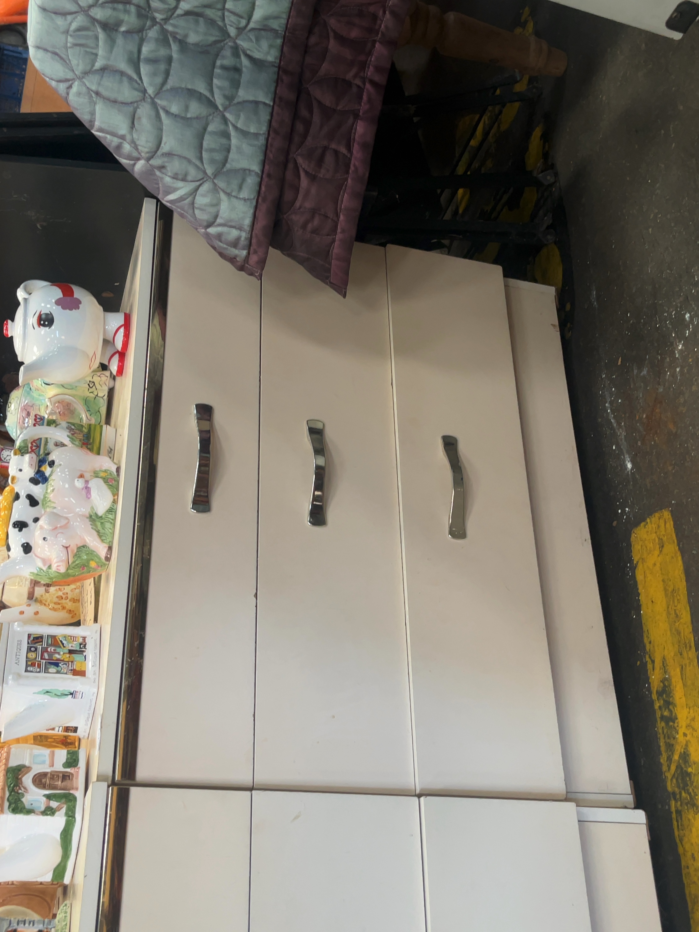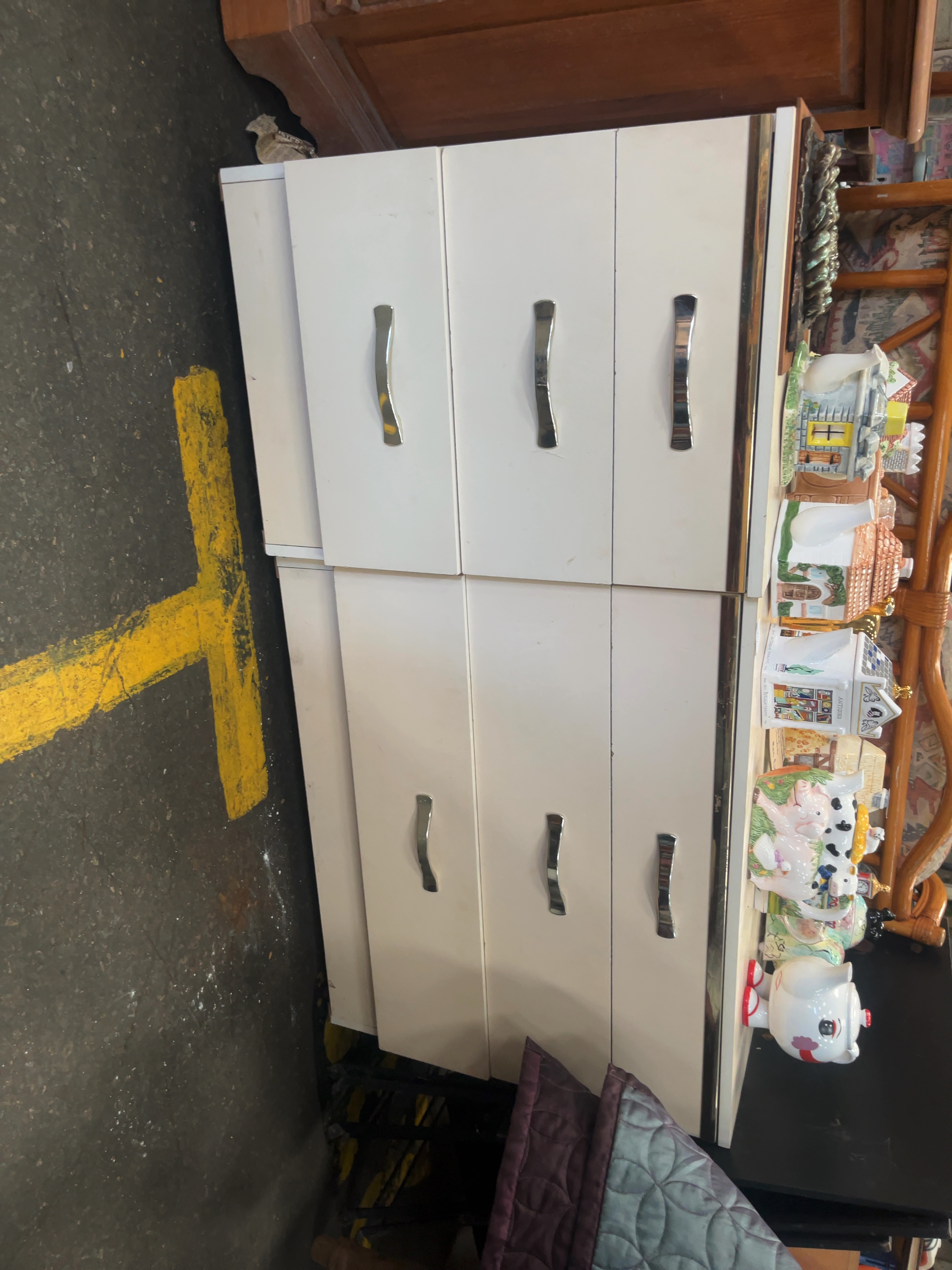 The items are in used, fair condition. There are visible surface scuffs, minor chips to the laminate edges, and general marks consistent with age and domestic use. The units would benefit from cleaning.