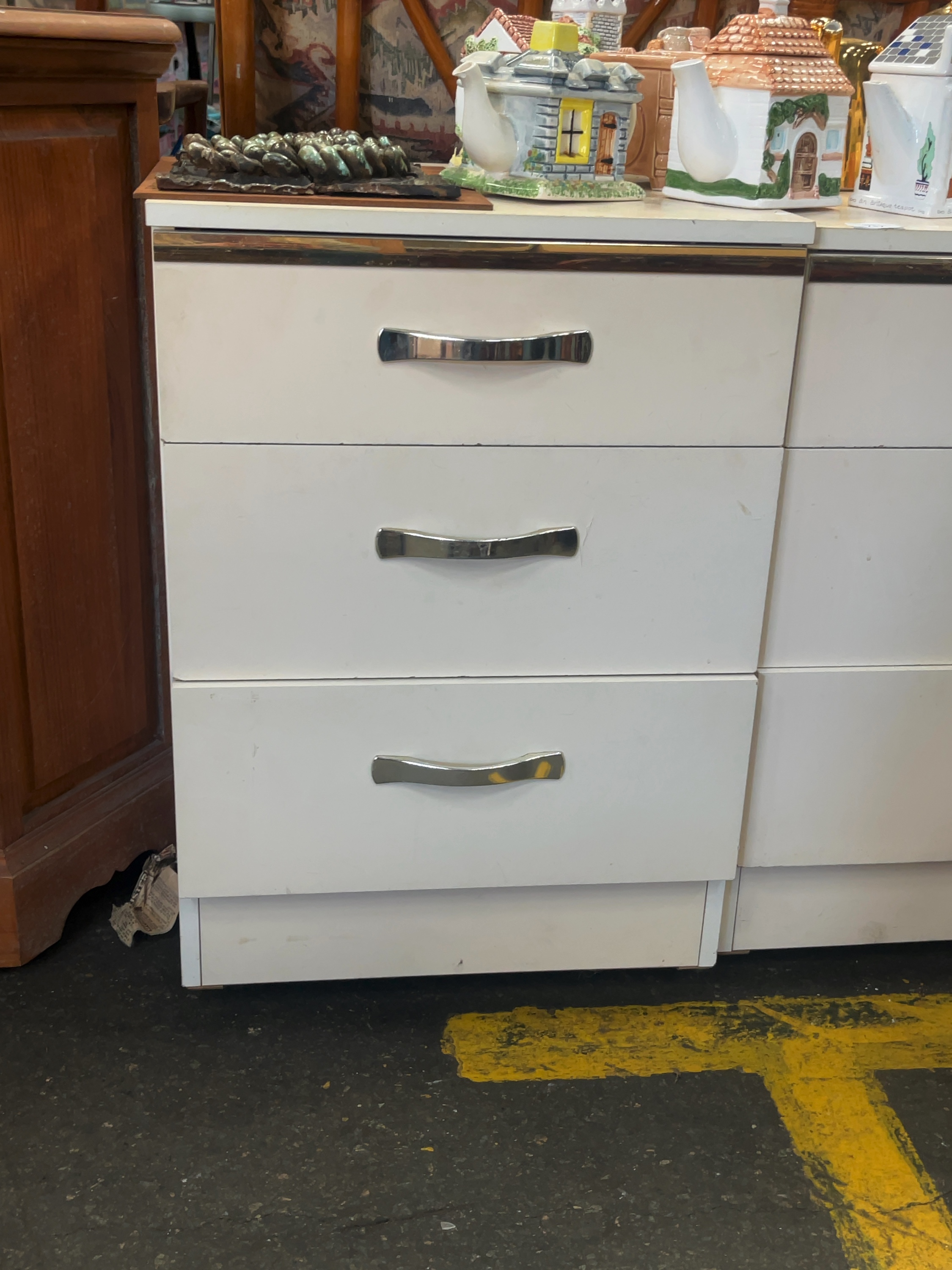 A pair of matching three-drawer chests of modular design, dating from the late 20th century. The units are constructed from engineered wood with a white melamine laminate finish. Each drawer is fitted with a single, horizontally-mounted, polished chrome-effect bow handle. A thin decorative metallic trim strip runs along the top front edge of each unit. The design is typical of mass-market furniture produced for the United Kingdom retail market during the 1970s and 1980s. No manufacturer marks or labels are visible on the exterior surfaces.