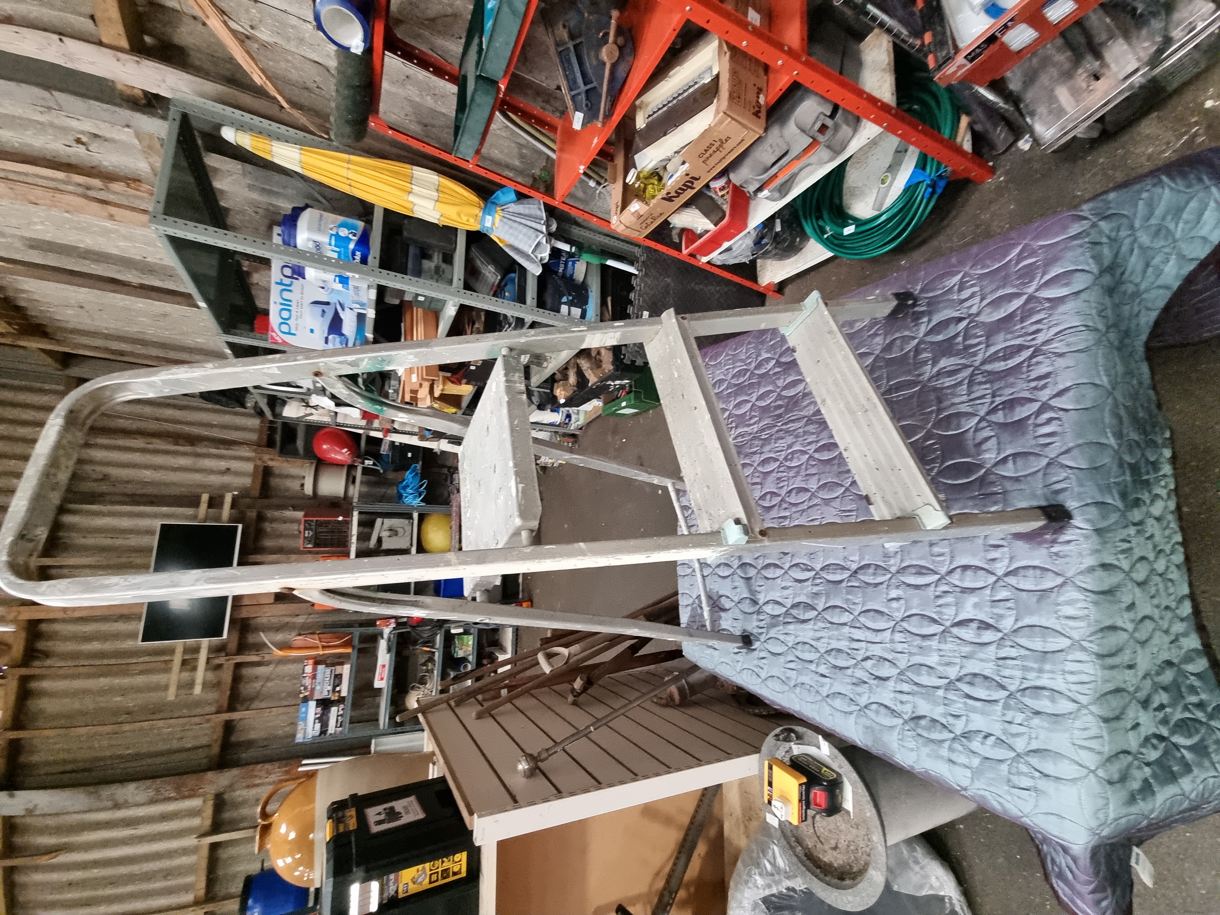 The item is in a well-used, utilitarian condition consistent with workshop or domestic DIY use. There are prominent white paint splashes across the top platform and lower rungs. General surface scuffing and oxidation are present throughout the aluminium frame. The structure appears complete and the folding mechanism is functional. Sold as viewed.