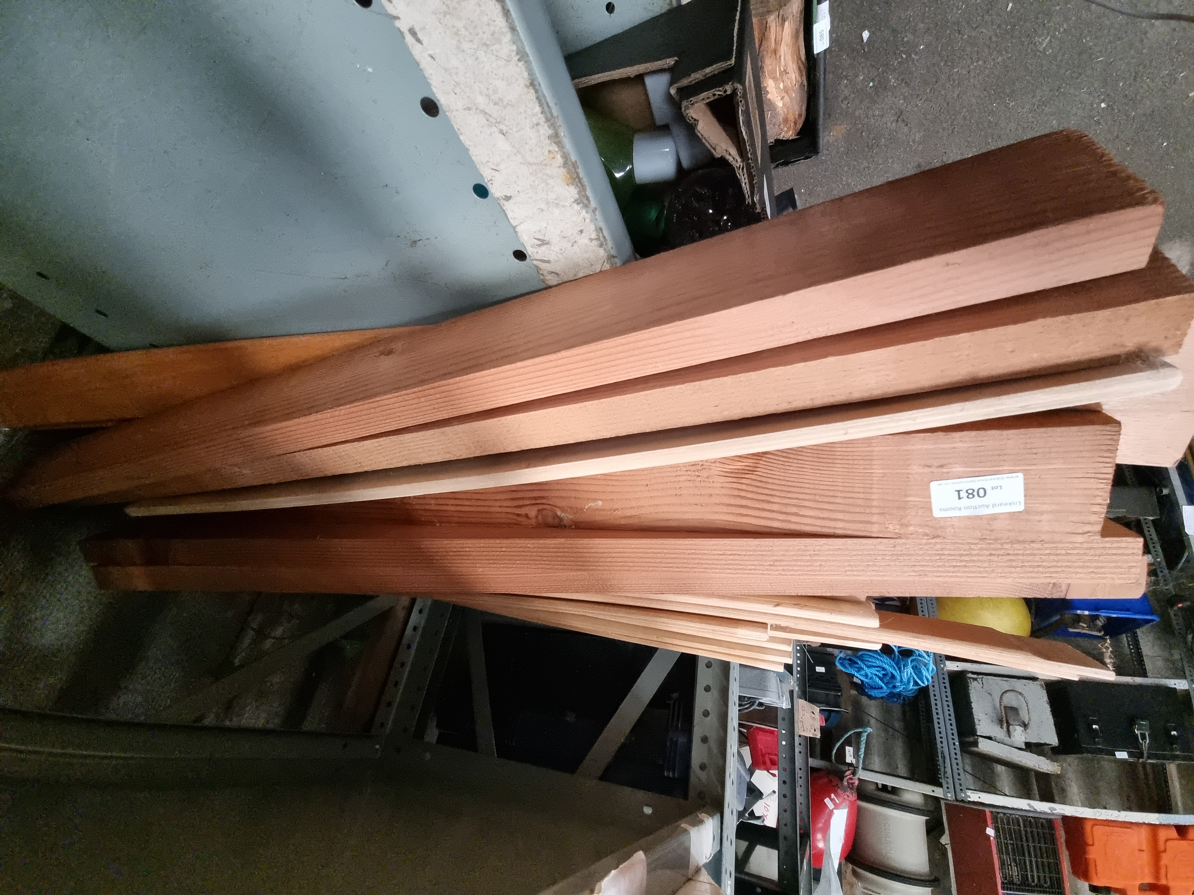 An assortment of timber planks and offcuts, appearing to be softwood such as cedar or Douglas fir. The collection consists of multiple pieces of light-coloured wood in various lengths, widths, and thicknesses. The lot includes rectangular planks and thinner strips, some with planed surfaces and others with rough-cut ends. The wood displays natural features including knots and grain variations. One plank bears a white adhesive label for Liskeard Auction Rooms, Lot 081.